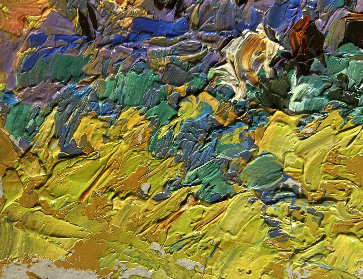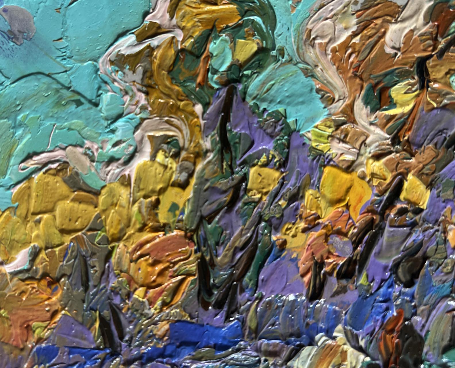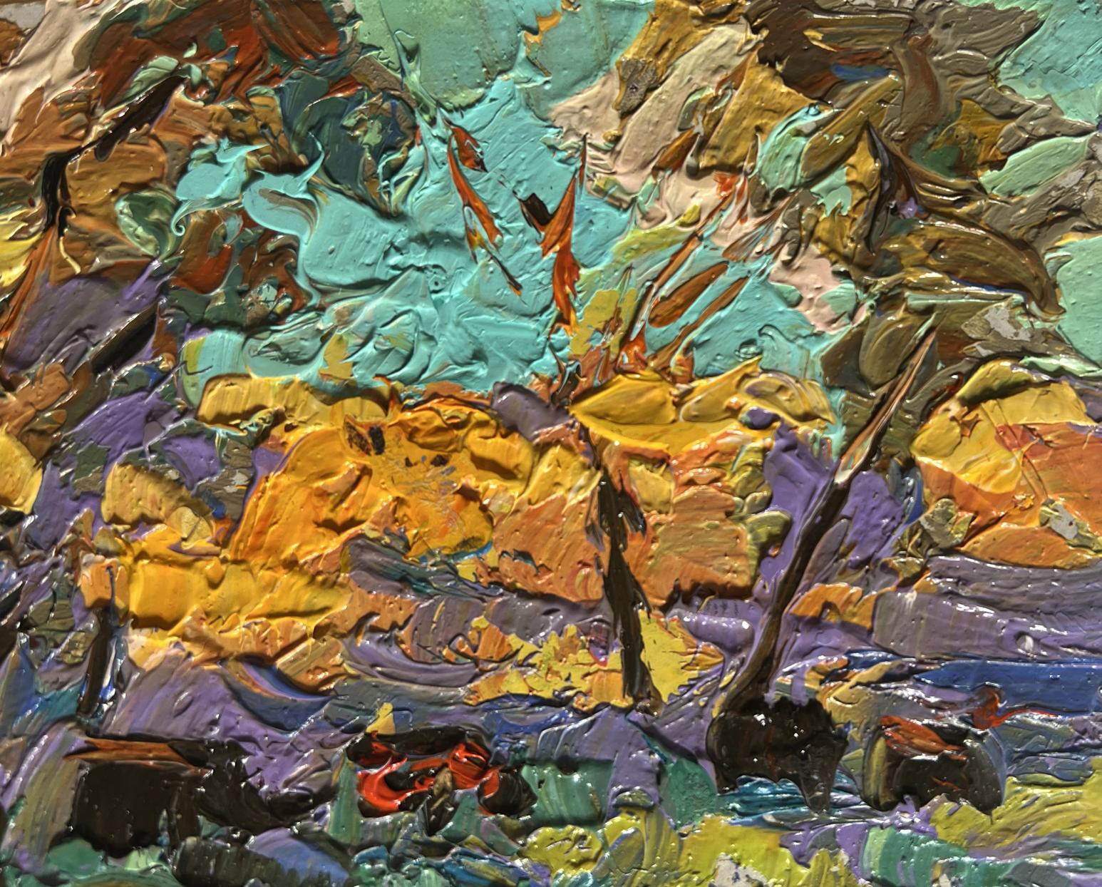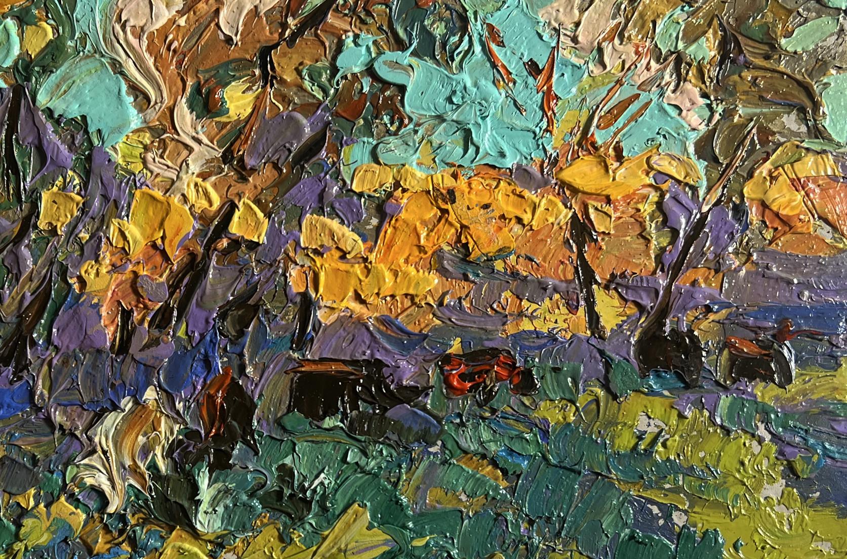 This oil painting cardboard, titled "A light breeze in the meadows", the artist masterfully captures the impression of a light breeze sweeping through the fields, rustling the tall grass and causing the leaves on the trees to flutter. In the foreground, the meadow is depicted with rich, textured brushstrokes in shades of green, yellow, and hints of blue. The thick application of oil paint gives the field a sense of depth and vibrancy, as if each blade of grass and wildflower sways under the touch of the wind. The energetic brushwork creates a dynamic surface, reinforcing the movement within the landscape. Scattered across the middle ground, trees with elongated trunks and expressive foliage stand tall, their leaves shimmering in warm hues of orange, gold, and violet. The interplay of warm and cool colors enhances the sense of seasonal transition, possibly suggesting an early autumn setting. The trees appear to be dancing with the breeze, their branches curving and bending slightly as if carried by an unseen force. Nestled among the trees, small dark structures are subtly integrated into the landscape, hinting at the presence of a village or farmhouses in the distance. Their muted tones contrast with the surrounding brilliance, grounding the composition and offering a point of stability amid the swirling colors. The background sky is painted in a soft turquoise, interwoven with white and pale yellow strokes, suggesting a vast, open space above. The bright sky casts a diffused light over the scene, illuminating the trees and meadows in a warm, glowing radiance. The use of impasto technique, with thick and deliberate strokes of paint, adds a tactile quality to the piece, making the viewer almost feel the wind that moves through the meadow. The composition exudes tranquility and freshness, transporting the observer into a quiet countryside moment, where nature's harmony is felt in every detail.