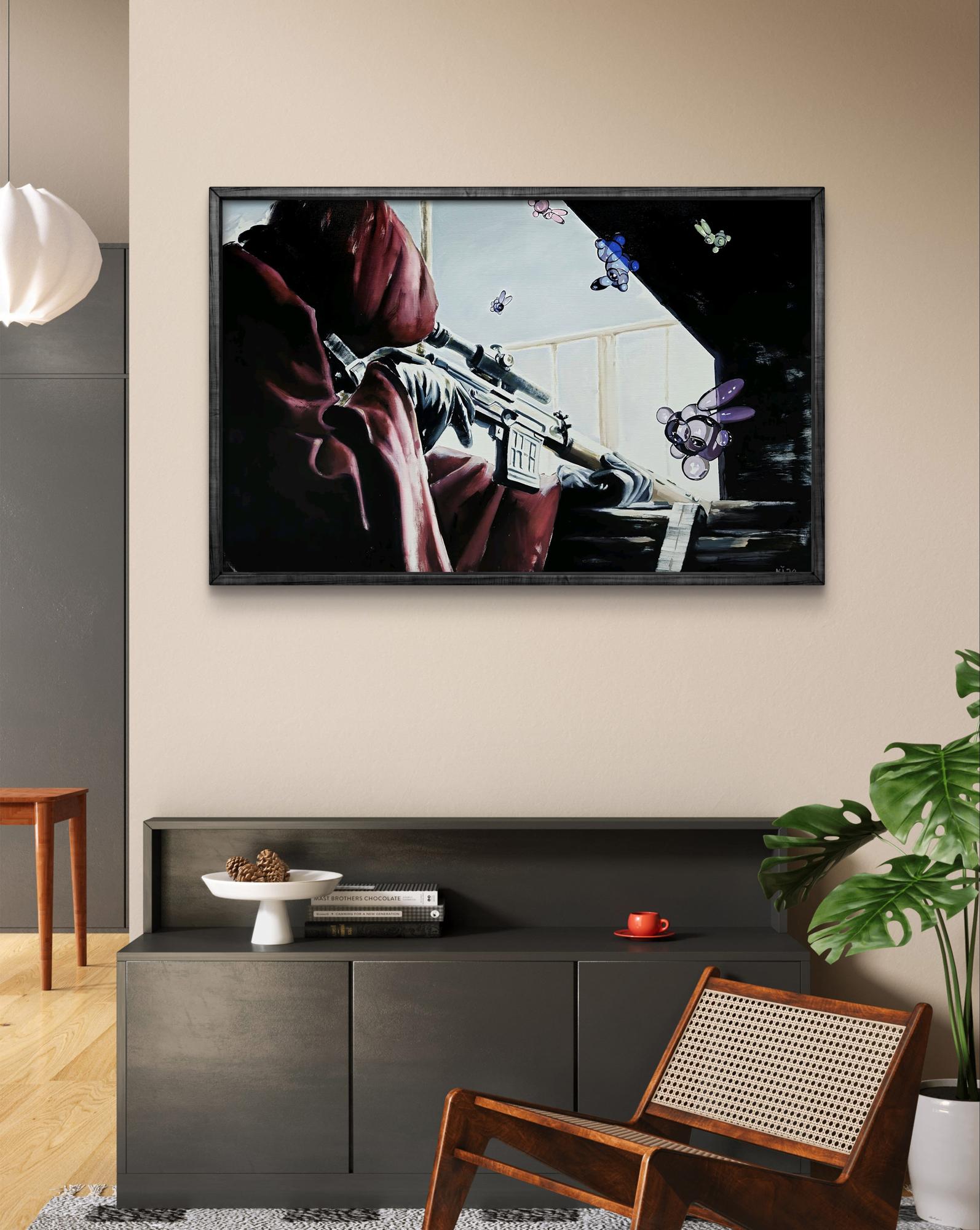 The oil painting on canvas titled "Approaching Danger" presents a striking juxtaposition of realism and surrealism, capturing a tense moment frozen in time. The central figure, cloaked in a deep crimson hood and draped in heavy fabric, is positioned in a dimly lit space, partially concealed in the shadows. Their hands, clad in sleek black gloves, grip a sniper rifle with meticulous precision, the barrel pointed toward an unseen target beyond the frame. The scope gleams under the stark light filtering through a window or an opening, suggesting the imminence of action. The background is stark and minimalistic, a pale sky contrasting sharply with the dark interior where the figure is positioned. A railing in the distance hints at an elevated position, possibly a vantage point for reconnaissance or an imminent confrontation. The composition’s dramatic lighting enhances the sense of depth, making the figure appear as though they are emerging from darkness into a world of sharp contrasts. Yet, amid this scene of tension and focus, whimsical elements intrude. Floating through the air are translucent, balloon-like creatures that resemble insects or small animals. Their glossy surfaces reflect the surrounding light, casting an otherworldly glow. Some hover close to the sniper, as if observing or interfering, while others drift in the open sky. The color palette is a carefully curated blend of muted tones and stark contrasts. The sniper’s red garment is the most dominant hue, drawing immediate attention to the figure and imbuing them with an aura of mystery and intensity. The monochromatic gloves, rifle, and shadows further emphasize the realism of the scene, while the vibrant, iridescent tones of the floating entities add a dreamlike quality. The sniper’s identity remains obscured, adding to the enigma of the moment. Their posture exudes discipline and readiness, yet there is an undeniable sense of waiting—a fraction of a second before something unfolds. The presence of the surreal creatures raises questions about the nature of the threat.