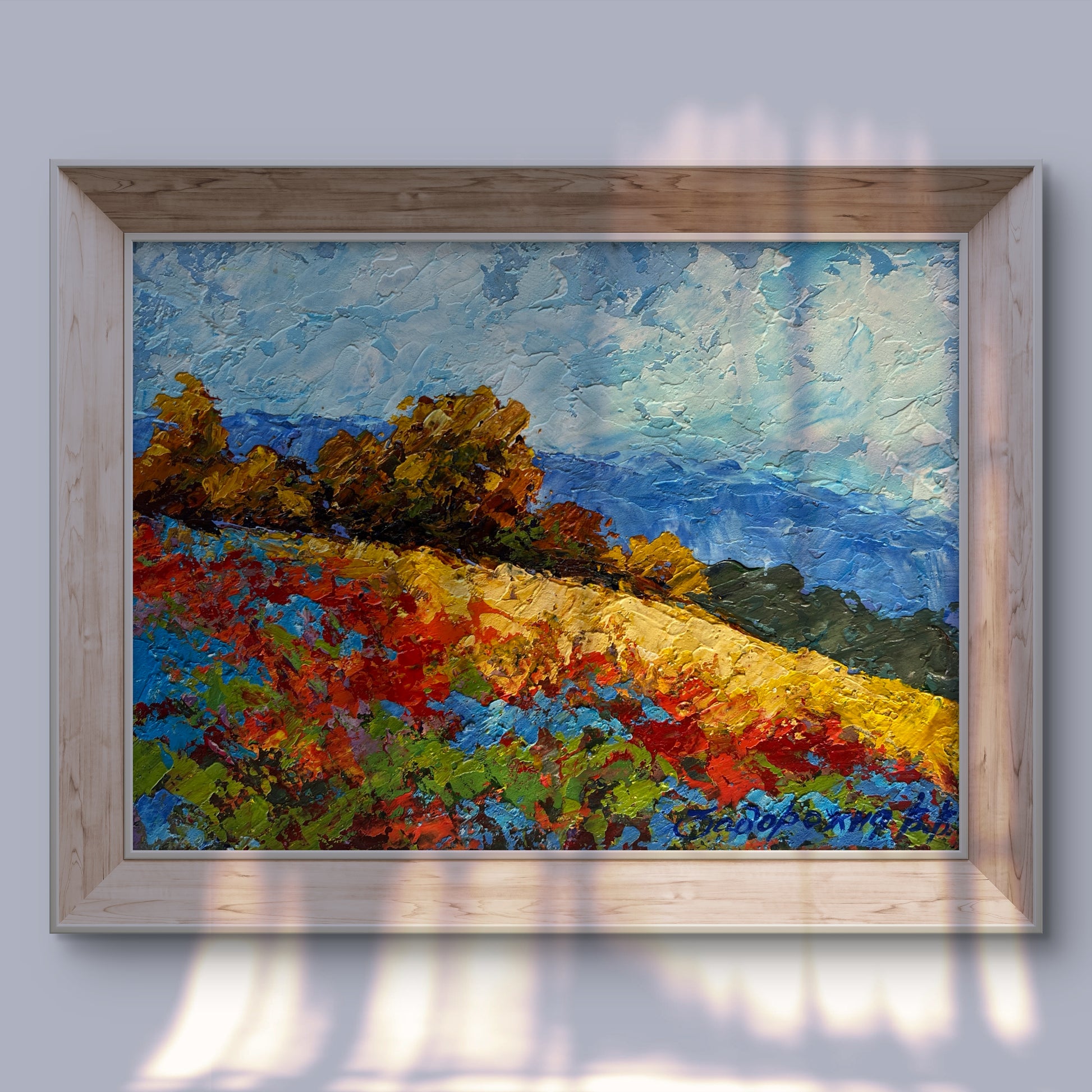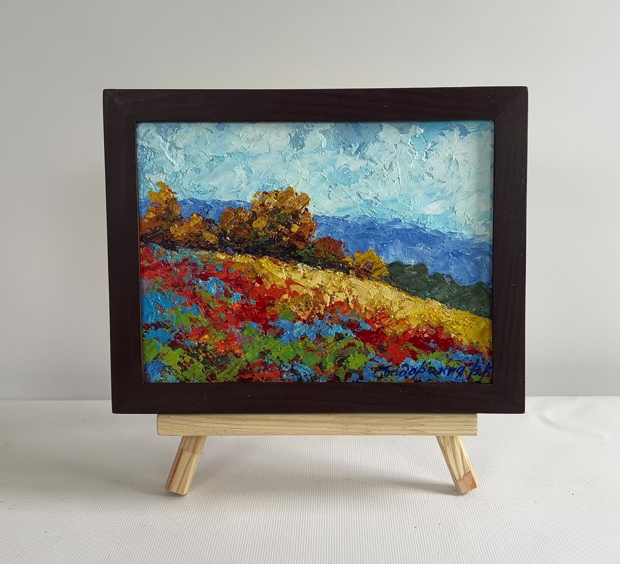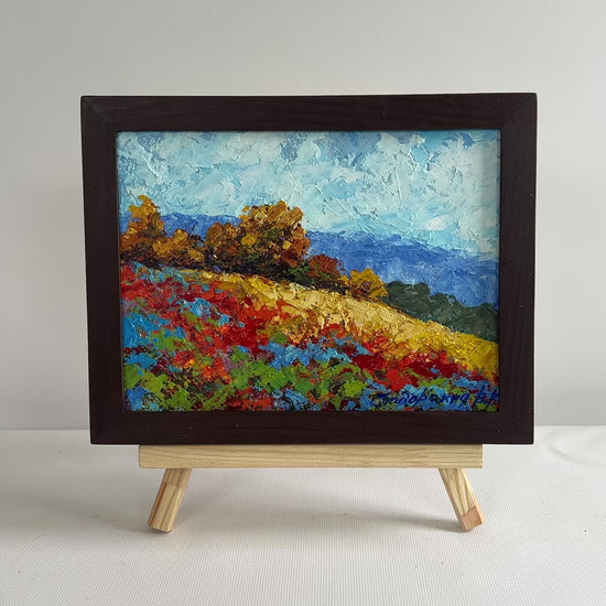This oil painting cardboard is titled "Autumn palette of nature" is a mesmerizing tribute to the rich, fiery colors of the fall season. With bold impasto brushstrokes and a vibrant color palette, the artist captures the golden warmth of the autumn sun, the brilliant reds and oranges of changing leaves, and the cool blues of distant mountains. This landscape is more than a simple depiction of nature; it is an exploration of color, texture, and emotion, celebrating the transition of the seasons in a breathtakingly dynamic way. The painting is structured in three dynamic layers, creating a sense of depth and movement: The lower part of the painting is a vibrant field of wildflowers and foliage, bursting with deep reds, fiery oranges, fresh greens, and touches of blue. The impasto brushwork creates a highly textured surface, making the colors appear almost three-dimensional, as though the leaves and flowers are shifting in the wind. The interplay of warm and cool tones gives this part of the painting a sense of energy and motion, evoking the feeling of crisp autumn air rustling through the hills. A gently sloping hill covered in golden tones cuts through the center of the composition, guiding the viewer’s eye toward the fiery trees that stand at its crest. The trees, rendered in deep amber, burnt sienna, and ochre, are painted with expressive, thick brushstrokes, making them appear alive with the essence of autumn. The contrast between the warm golden hues and the dark shadows beneath the trees adds drama and depth to the scene. In the distance, layers of deep blue mountains rise against the sky, adding a sense of vastness and tranquility. These mountains are painted with cool, blended brushstrokes, contrasting with the intense textures and colors of the foreground. Above them, the sky is a soft blend of blues and whites, filled with clouds that appear to drift gently over the landscape. The cool tones of the mountains and sky provide a perfect counterbalance to the warmth of the trees and fields, emphasizing the depth of the painting. The diagonal flow of the hill and tree line creates a sense of movement, making the composition feel dynamic and engaging. "Autumn Palette of Nature" is a stunningly expressive work of art, bringing the richness and vibrancy of fall to life through bold color choices, dynamic textures, and expert composition. The painting’s brilliant contrast between warm and cool tones, along with its masterful use of impasto technique, makes it an unforgettable piece that radiates energy and emotion. This artwork is perfect for those who love autumn, impressionistic landscapes, and bold, textured paintings. It would bring warmth, vitality, and inspiration to any space, serving as a beautiful reminder of nature’s ever-changing beauty. With its radiant colors, expressive brushwork, and deep emotional impact, this painting captures the soul of autumn—a season of transformation, warmth, and fleeting splendor.