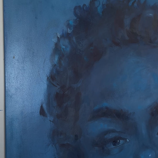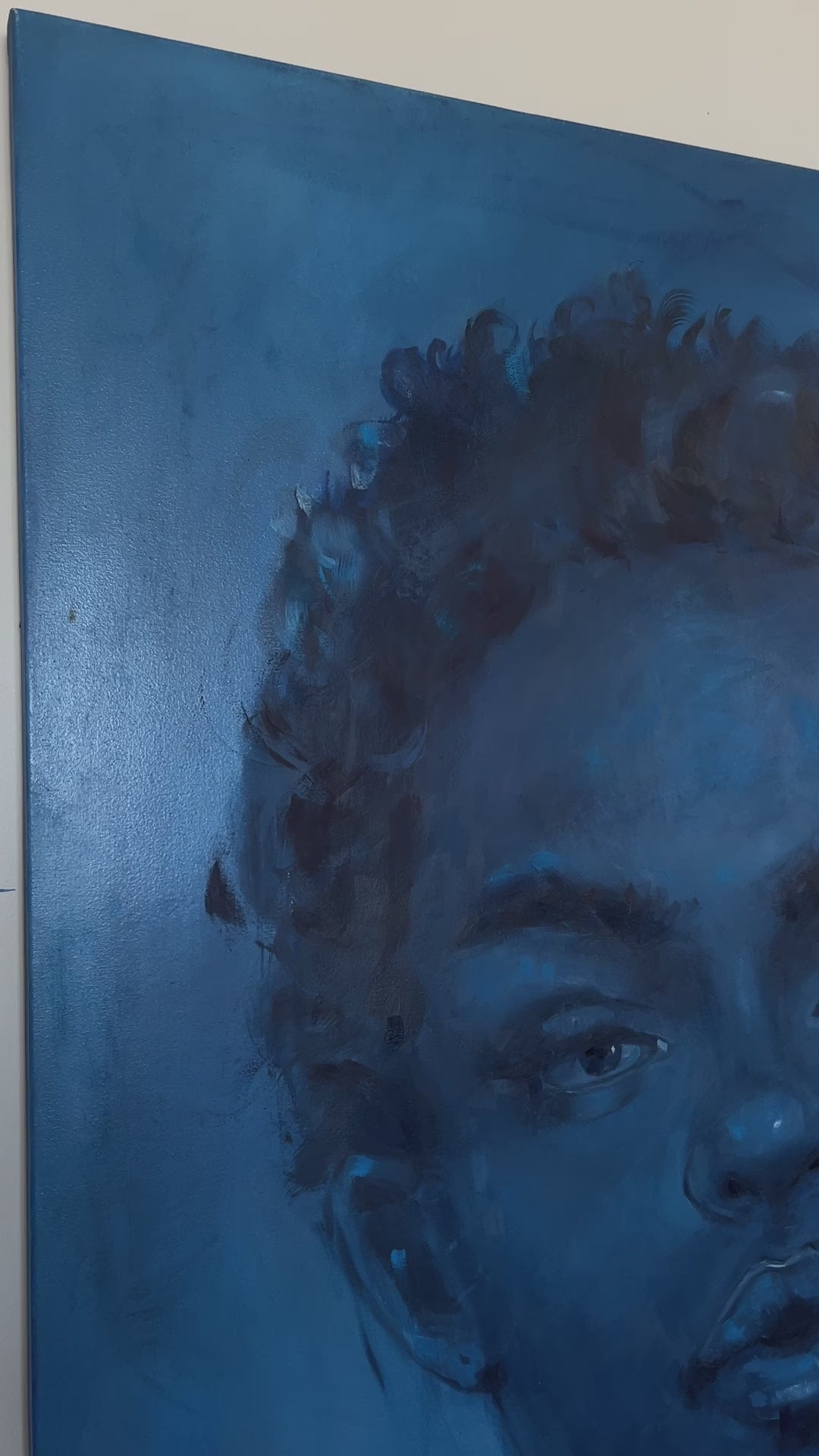This artwork is painted with different shades of blue, which symbolizes calmness, harmony, and inner strength. The girl has a serious and thoughtful expression in her face, which shows her maturity and understanding of the world. The different shades of paint show the depht of her feelings.
