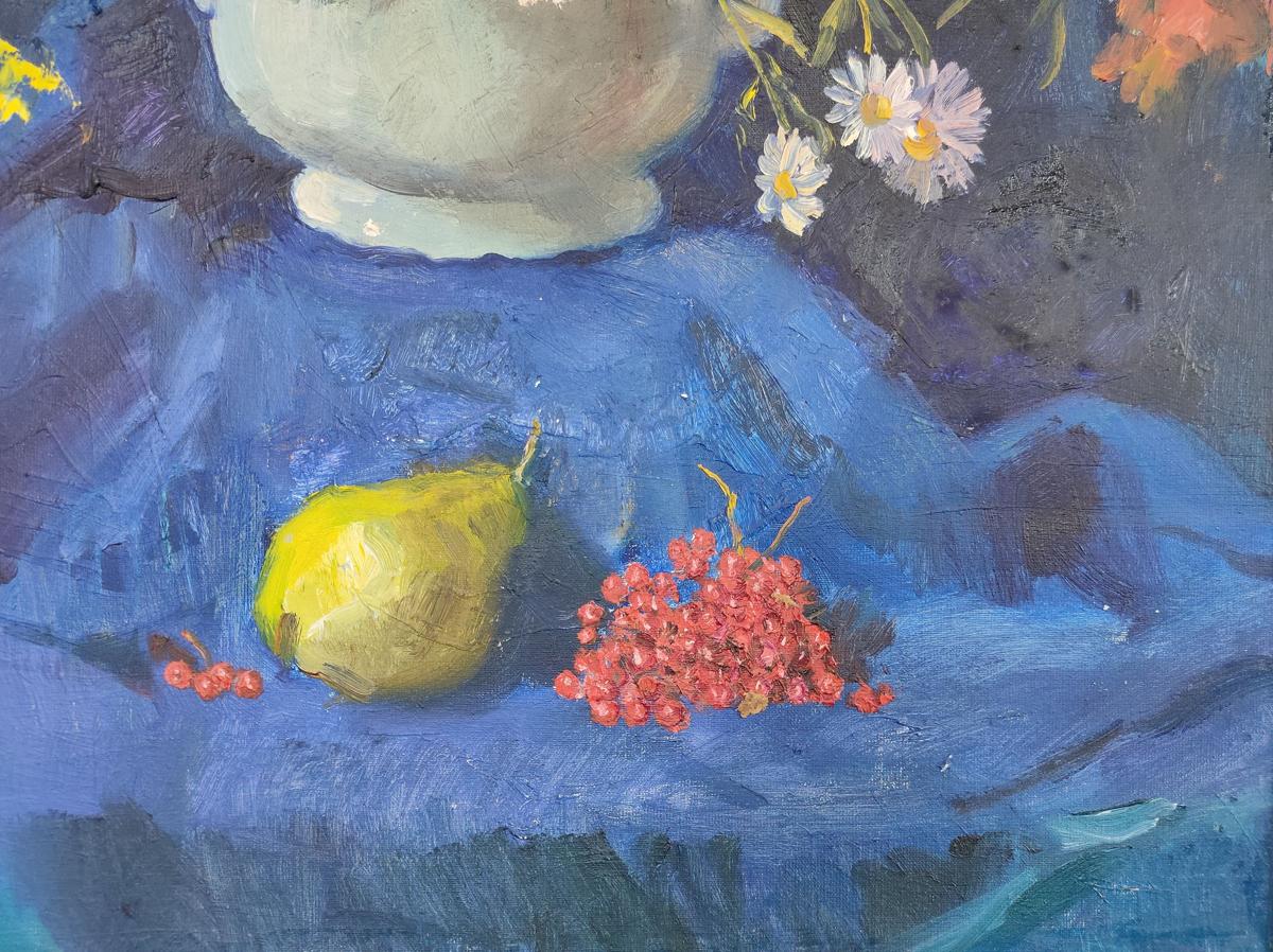 The artwork features a lush bouquet of chrysanthemums and other wildflowers arranged in a classic white vase against a stark blue background, which not only highlights the varied hues of the flowers—from delicate whites to deep oranges and pinks—but also accentuates their delicate forms and the texture of the petals. Additional elements like a smaller vase with yellow flowers, a lone pear, and scattered berries enrich the narrative, suggesting a celebration of the harvest season and the bounty of the earth.