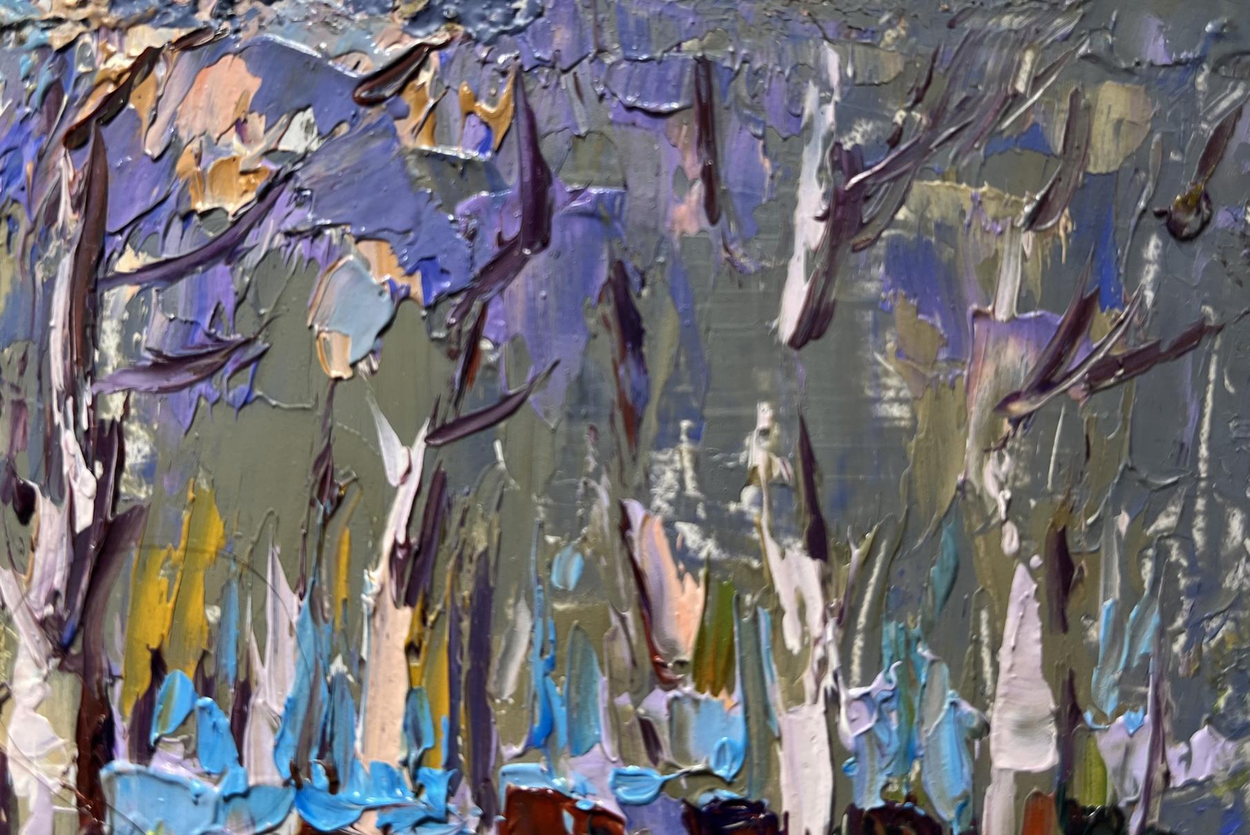 This oil painting cardboard, titled "Early spring and the meadows are in bloom", the interplay of fresh greens, delicate purples, and soft blues evokes the atmosphere of an early spring day, where the land is coming back to life. The foreground is dominated by a lush meadow, painted in a mix of bright greens and yellow tones, suggesting the first sprouts of fresh grass and wildflowers breaking through the earth. The thick application of paint gives the impression of a lively, untamed field filled with scattered patches of colorful blooms. The artist’s use of short, deliberate strokes adds a sense of texture, making the meadow appear almost tangible, as if it is rustling gently in the breeze. Among the grass, hints of lavender and blue emerge, representing early wildflowers that have started to bloom. These cool tones contrast beautifully with the warmer greens, enhancing the richness of the composition. The flowers appear scattered yet naturally arranged, reinforcing the sense of a wild, untouched landscape. The background features a dense forest with slender, bare-branched trees stretching upward. Their trunks are painted in a mix of soft whites, deep browns, and purples, blending harmoniously into the surrounding landscape. The expressive brushwork creates a sense of movement, as if the trees are swaying lightly in the fresh spring air. The combination of cool and warm hues in the foliage and bark adds complexity to the depth of the forest. Further back, an atmospheric haze in soft blues and grays blends the trees and meadow together, giving the painting a dreamy, almost ethereal quality. The blurred effect suggests the presence of morning mist or the lingering chill of early spring, enhancing the painting’s tranquil and reflective mood. The sky, though partially obscured by the dense forest, is painted in a subtle mix of muted blues and grays, reinforcing the transition from the colder months to the warmth of spring. The gentle, blended brushstrokes in the sky contrast with the thick textures of the meadow and trees, creating a harmonious balance between softness and structure. The overall mood of the painting is peaceful and uplifting, celebrating the quiet beauty of early spring. The contrast between the dormant trees and the lively, colorful meadow emphasizes the theme of rebirth and renewal, reminding the viewer of nature’s resilience and cyclical beauty.