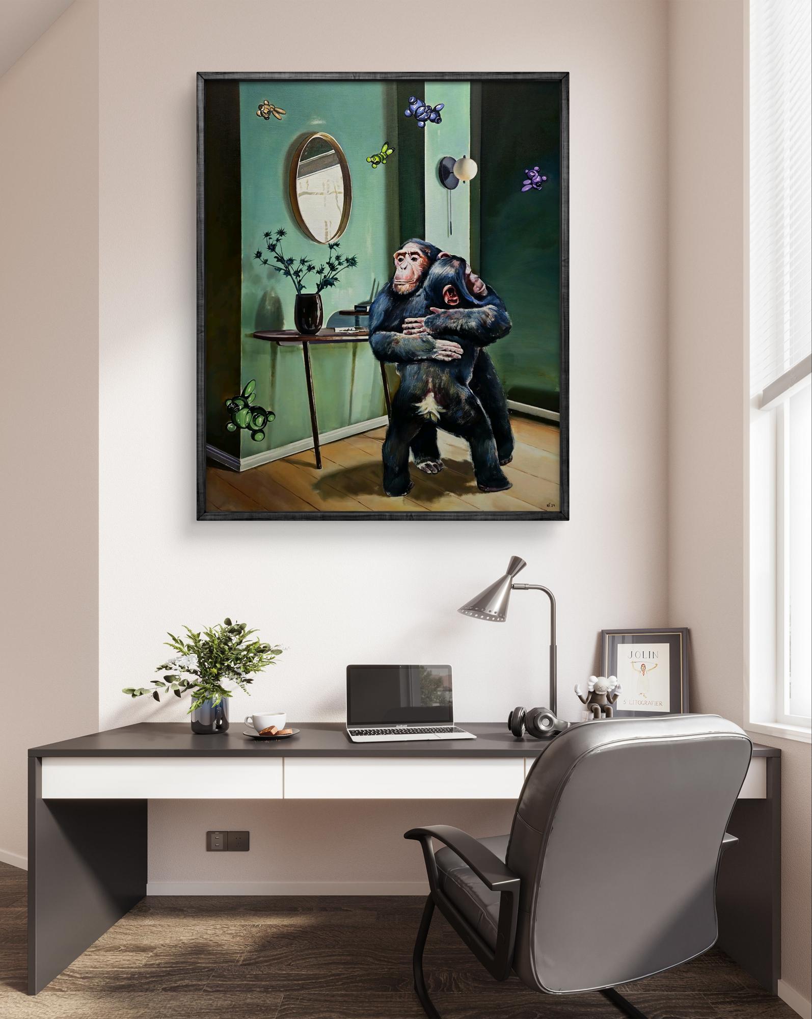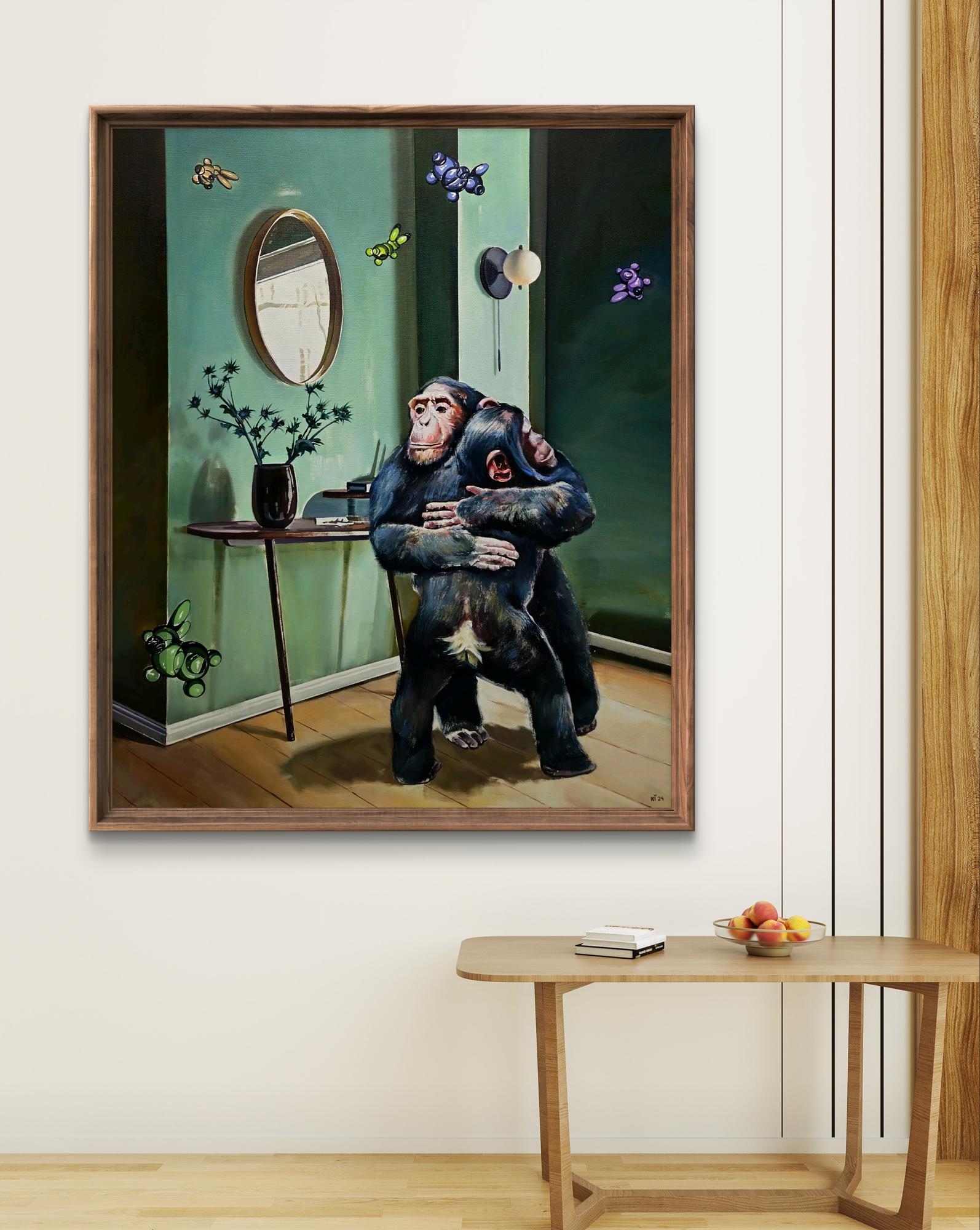 The oil painting on canvas titled "Family Housewarming" presents a captivating fusion of realism and surrealism, blending elements of domestic comfort with an underlying sense of the extraordinary. At the center of the composition, two chimpanzees embrace in a tender yet intense moment of connection. One chimp holds the other protectively, its expression calm and resolute, while the other appears to be mid-scream or cry, its mouth open in raw emotion. This intimate pose conveys a complex dynamic of support, vulnerability, and the deep bonds of family, making the viewer question the emotions behind this embrace—fear, reassurance, or something in between. The setting is a tastefully decorated interior, painted in a muted green palette that exudes warmth and sophistication. A wooden console table against the wall holds a dark vase with branches reaching outward, casting delicate shadows on the wall. A round mirror above the table reflects a distorted glimpse of the room, subtly altering the viewer’s perspective and adding an element of mystery. The light fixture beside the mirror, with its sleek, modern design, suggests a carefully curated space, contrasting with the raw, organic presence of the chimpanzees in the room. Adding to the surreal nature of the painting, balloon-like creatures float through the air, resembling glossy, inflated animals suspended in motion. These whimsical, artificial forms disrupt the otherwise serious and grounded atmosphere, creating an interplay between playfulness and solemnity. They may symbolize fleeting joy, distractions, or even deeper societal or existential themes—perhaps a nod to the absurdity of modern life or the contrast between nature and constructed environments. The brushwork is meticulously detailed, especially in the rendering of the chimpanzees’ fur, hands, and expressive faces. The texture of the wooden floor, the sheen of the vase, and the soft reflection in the mirror all contribute to the painting’s hyperrealistic qualities. Meanwhile, the composition’s lighting, with soft shadows and a warm glow, enhances the depth and dimensionality of the scene, drawing the viewer further into the intimate moment shared by the figures.