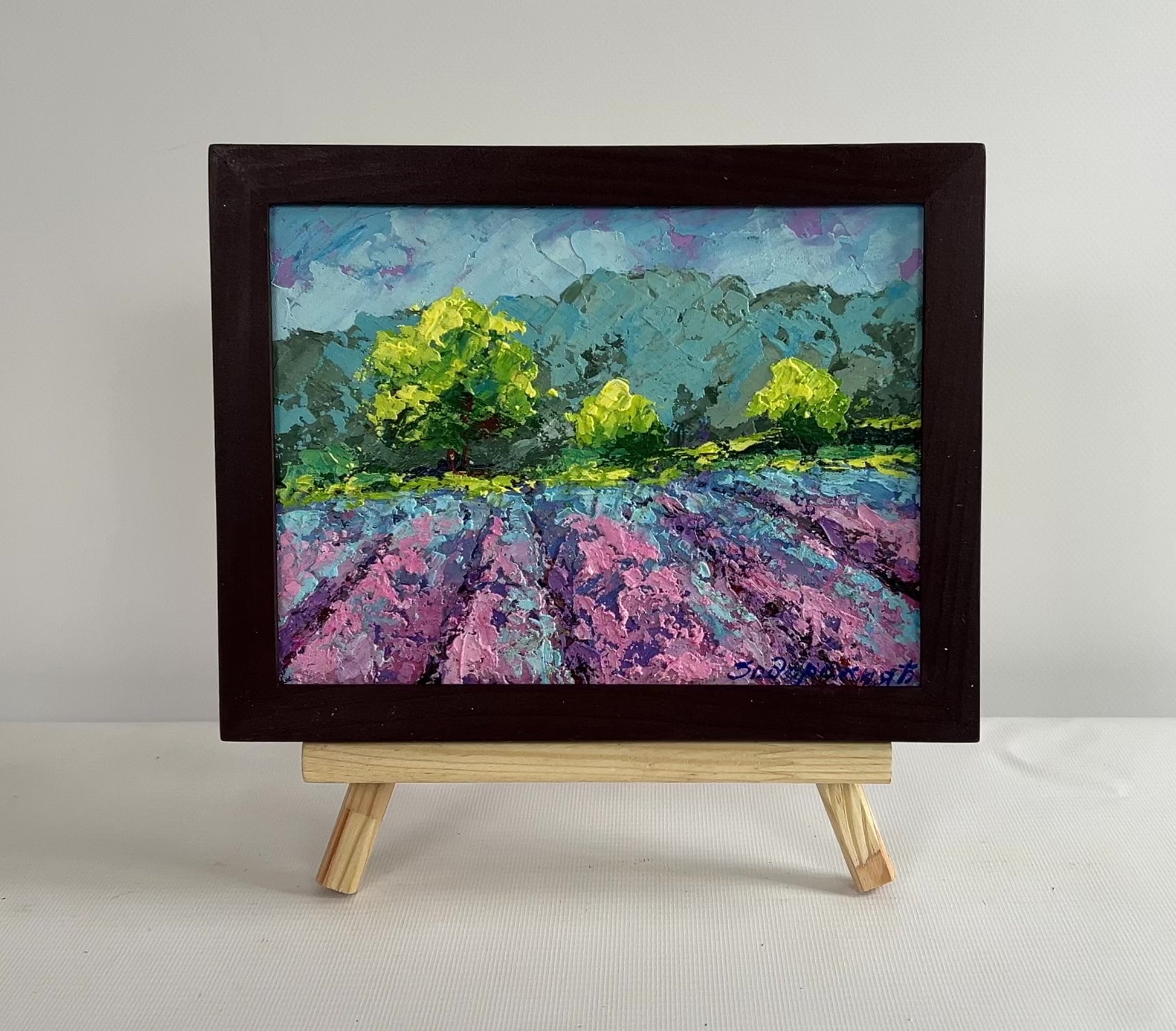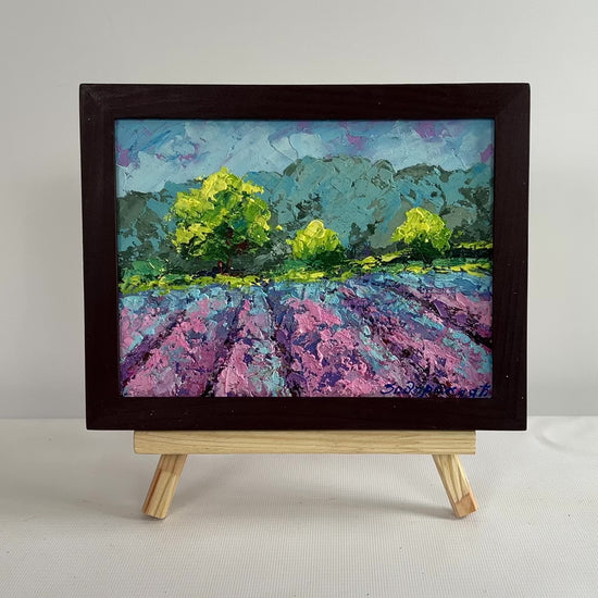 This oil painting cardboard is titled "Floral glow under the sky" is an enchanting and expressive landscape that captures the beauty of a vast flower field beneath a luminous sky. The artist’s use of bold, vibrant colors and thick impasto brushwork creates a mesmerizing scene that exudes warmth, energy, and movement. This artwork is not just a depiction of a landscape; it is a celebration of nature’s harmony, where colors blend in a symphony of light and texture. The composition of the painting guides the viewer’s eye through the landscape, creating depth and perspective. The foreground features rows of blooming flowers, stretching toward the horizon in a rhythmic pattern, leading the eye toward the central tree and the distant mountains. The Foreground (The Flower Fields): The lower half of the painting is dominated by lush lavender and pink hues, representing endless rows of blooming flowers. The thick application of oil paint in a textured impasto technique creates an almost three-dimensional effect, making the flowers feel tangible. The darker strokes between the rows add depth and movement, suggesting gentle waves of color swaying in the breeze. The Middle Ground (Golden Trees and Greenery): The transition between the flower field and the mountains is marked by bright yellow-green trees that stand as focal points against the cooler tones of the background. Their luminous color contrasts with the deeper greens and blues, giving the impression of sunlight filtering through the branches, casting a warm glow on the land below. The Background (Majestic Mountains and Sky): Rising above the fields, a majestic mountain range in deep blues and muted greens forms a solid, grounding presence in the composition. The sky above is a blend of soft blues, purples, and hints of pink, suggesting an ethereal atmosphere, as if the air is filled with the scent of blossoms and the warmth of the setting or rising sun. The balance of warm and cool tones creates a visually engaging scene, evoking a sense of tranquility and wonder. "Floral Glow Under the Sky" is a masterful celebration of nature’s brilliance, filled with rich textures, bold colors, and a glowing sense of life. The artist’s use of impasto technique, dynamic brushstrokes, and vivid contrasts makes the painting not just a visual experience, but an emotional journey. This artwork would be perfect for those who love impressionistic landscapes, vibrant floral fields, and paintings that radiate warmth and serenity. It brings a sense of joy, wonder, and peace into any space, reminding the viewer of the infinite beauty that nature offers when seen through an artist’s eye. With its captivating colors, luminous light, and expressive brushwork, this painting is a testament to the power of art to transform the ordinary into something extraordinary.