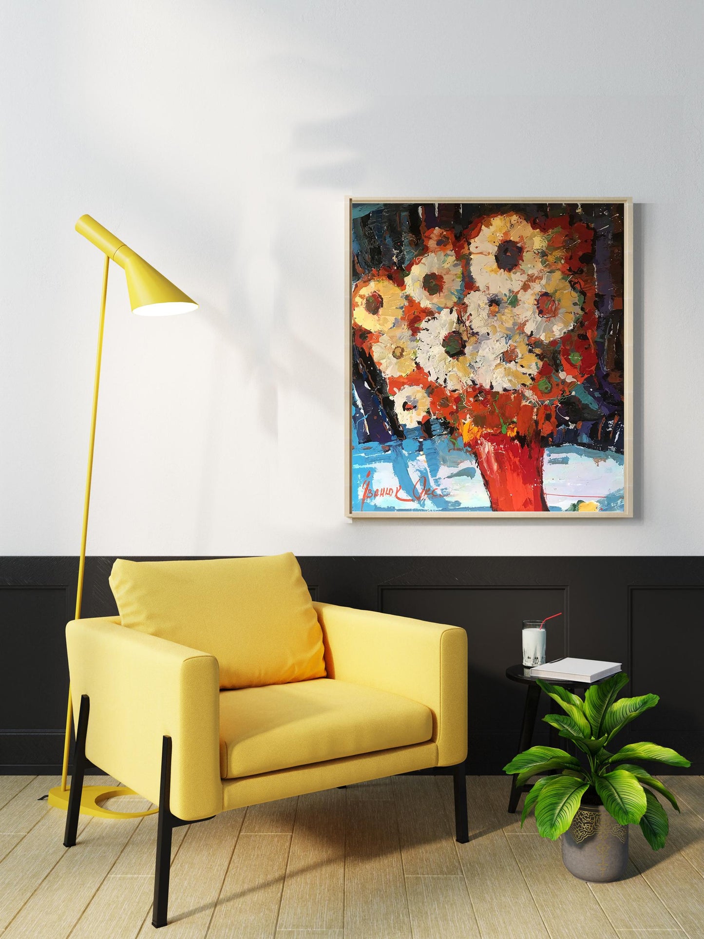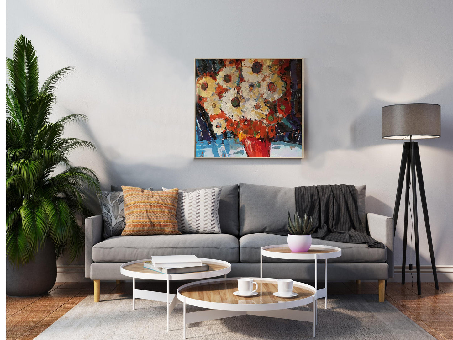 This artwork features a stunning bouquet of flowers, including the delicate white daisies and the vivid red poppies, brilliantly arranged to create an eye-catching composition. The striking colors and the artistic elegance of this painting make it an ideal addition to any home or office, and a perfect gift for any occasion.