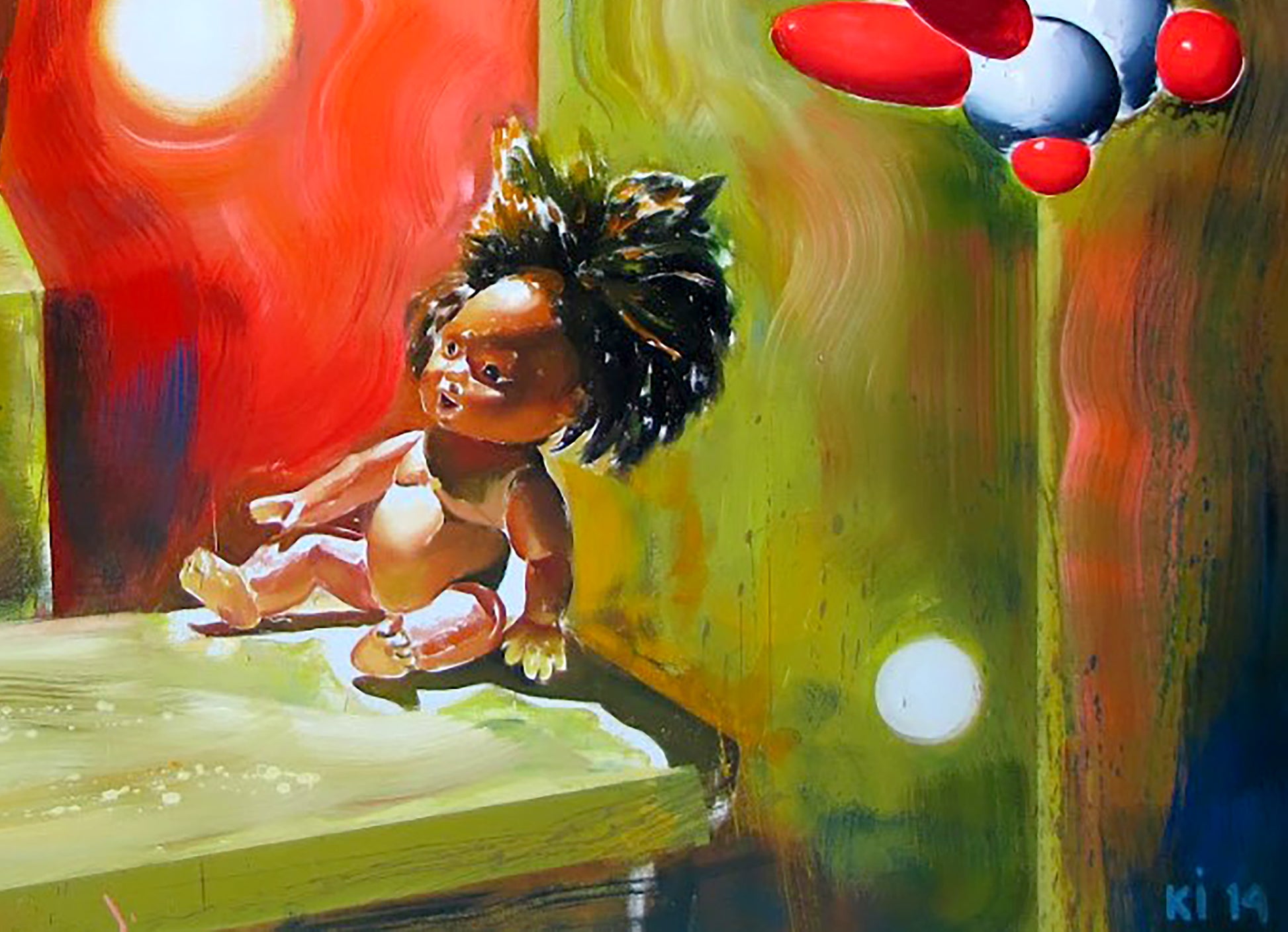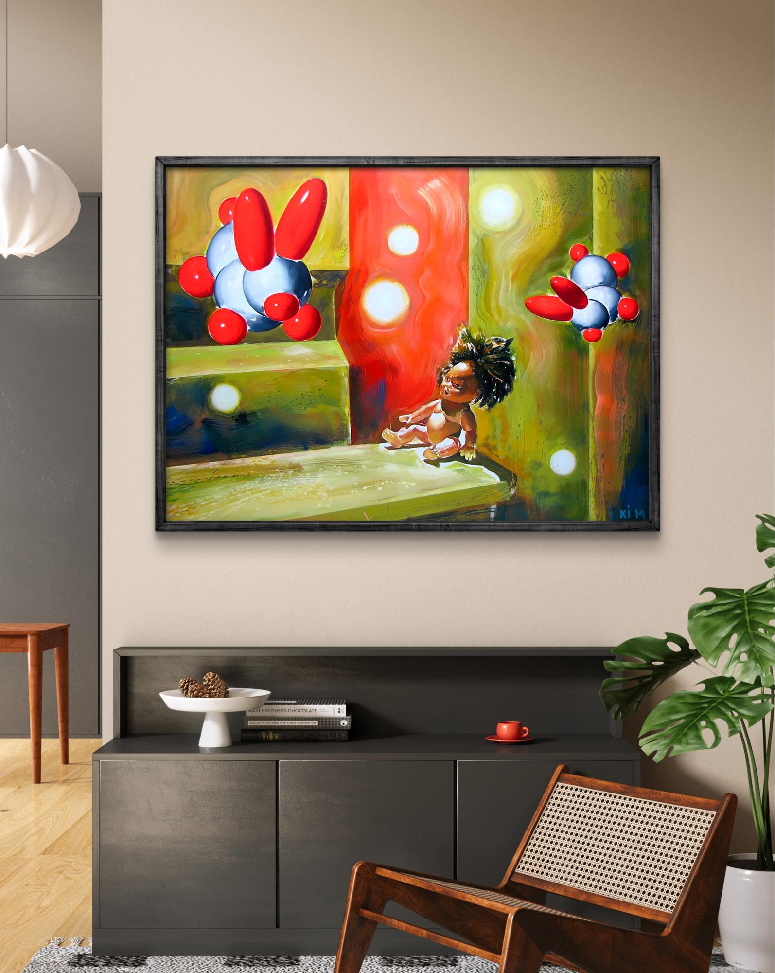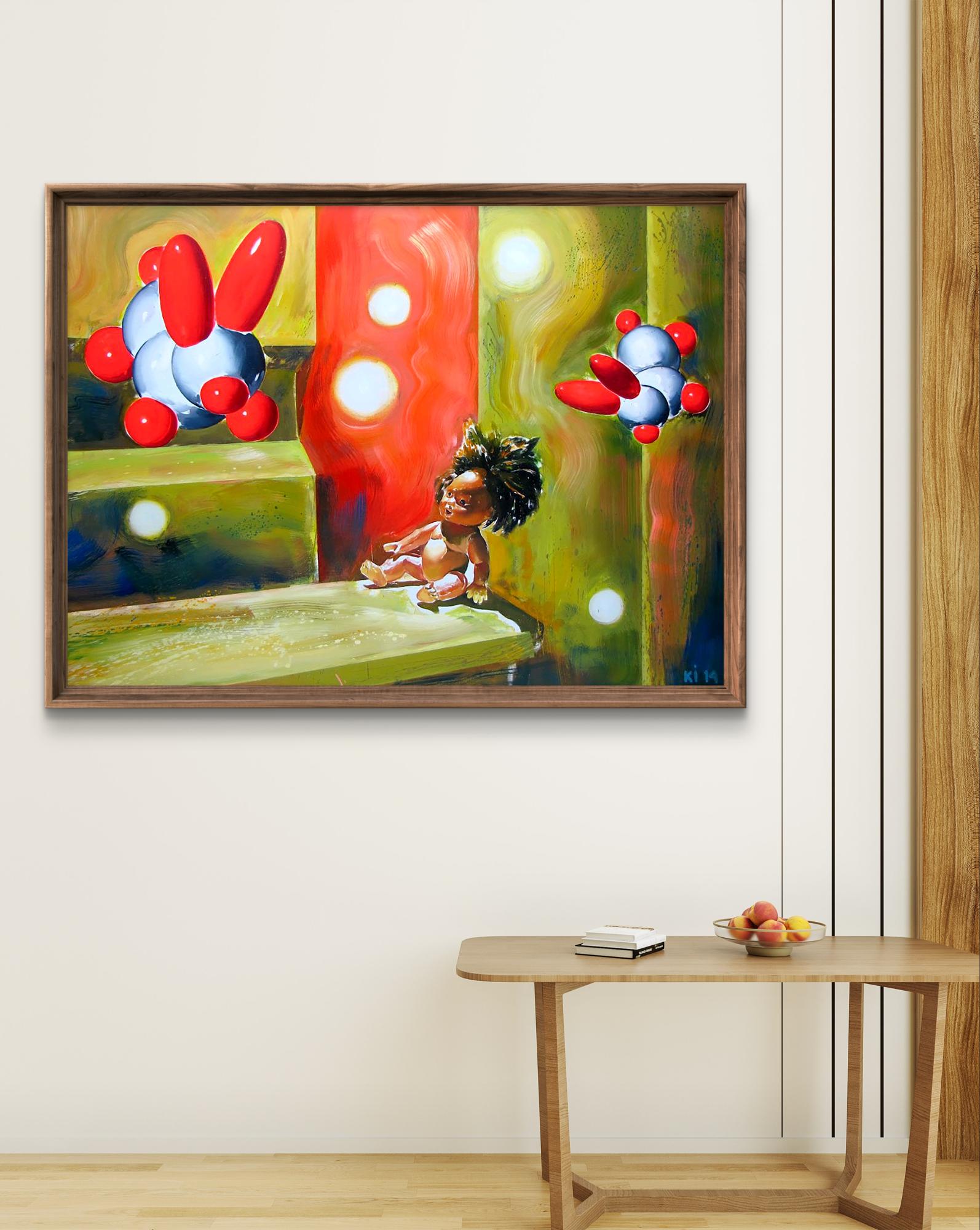 The painting "Good Night" by Ukrainian artist Igor Konovalov is a vibrant and imaginative depiction that juxtaposes the innocence of childhood with the pervasive influence of modern information. The scene centers on a small child, depicted with a sense of wonder and curiosity, seated amidst a colorful and almost fantastical environment. The child is surrounded by Konovalov's symbolic "bunnies," here represented as playful and brightly colored orbs that seem to bounce around the space.