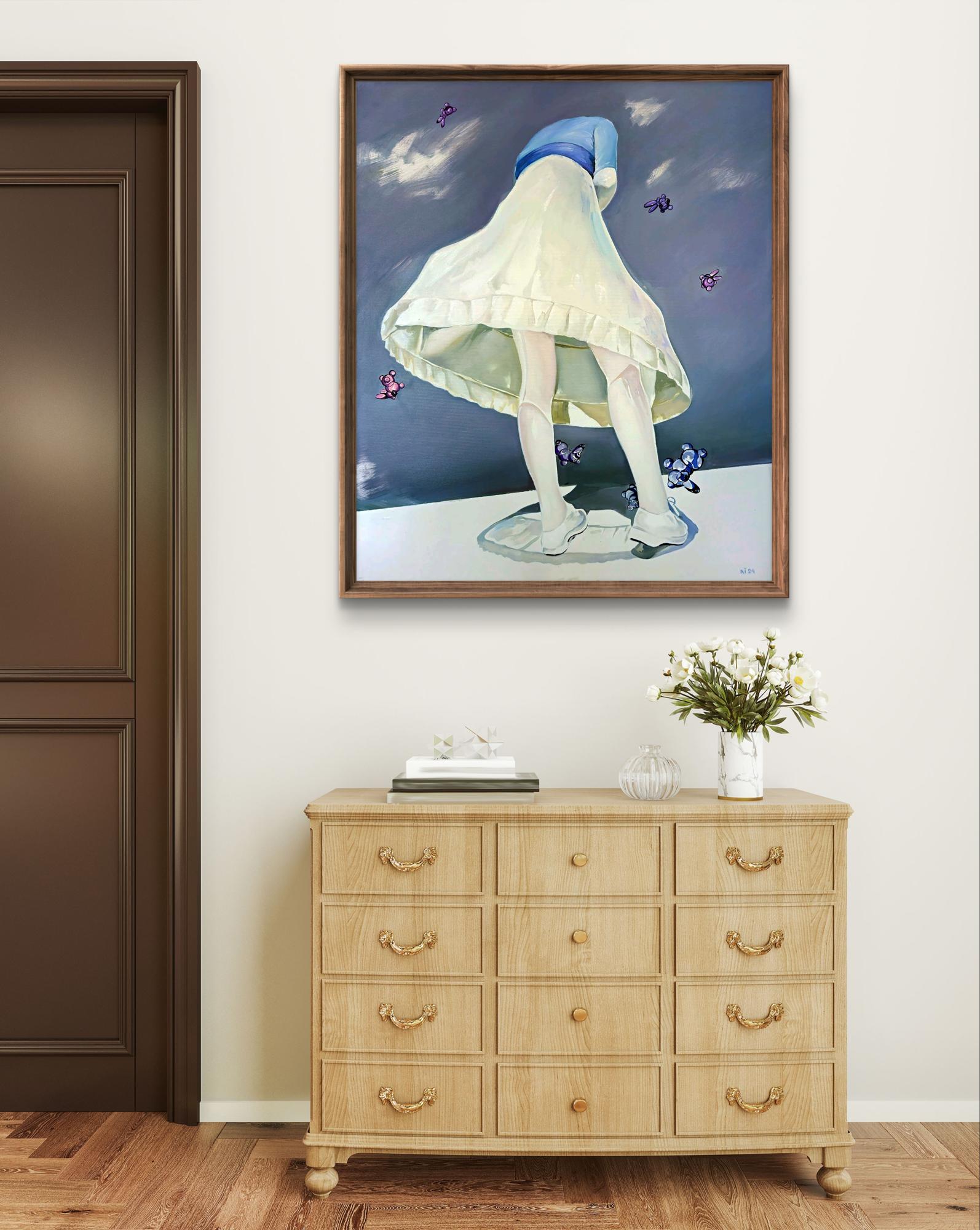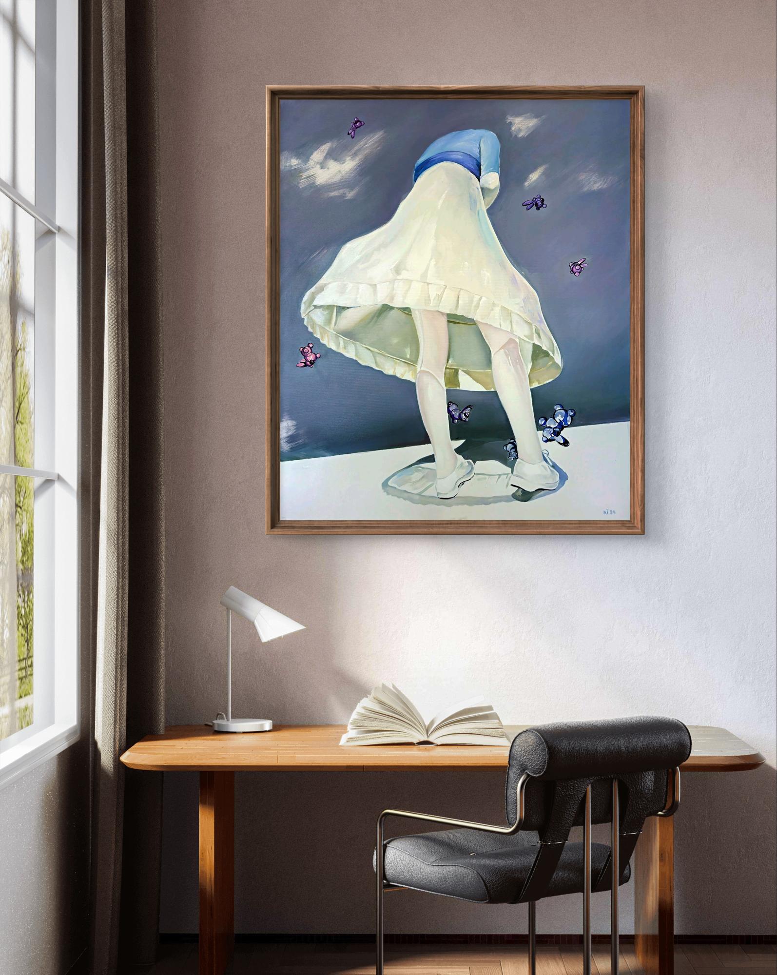 The oil painting on canvas titled "Like Catcher" presents a striking and whimsical composition, blending elements of surrealism and modern figurative art. The focal point of the painting is a young girl, captured from an unusual perspective—viewed from below as she leans forward, peering into the unknown. Her posture and the way her white dress billows in the air create a sense of curiosity, innocence, and movement, inviting viewers to step into a world that seems both dreamlike and playful. The girl's attire evokes a vintage or fairy-tale aesthetic. She wears a flowing, ruffled dress with soft folds and delicate shadows that suggest light fabric, moving as if caught in a gentle breeze. Her white tights and simple shoes emphasize the purity of childhood, while the contrasting blue blouse and belt add a pop of color, balancing the cool, muted tones of the background. The entire composition is bathed in an ethereal light, lending it an almost weightless quality. Surrounding the girl are small balloon-like creatures, floating in mid-air. These tiny, whimsical figures resemble animals or insects made of glossy, reflective material, their surfaces shimmering with hints of purple, pink, and blue. Their presence adds an element of fantasy to the painting, blurring the lines between reality and imagination. They appear to be drifting around the girl, perhaps reacting to her movement, as if she is attempting to catch or interact with them. The background consists of a smooth gradient of gray and blue, with soft, wispy clouds faintly visible in the upper portion. This simple yet atmospheric backdrop enhances the sense of depth and vastness, making it seem as if the girl is in a boundless, surreal space rather than a defined environment. The use of minimalistic surroundings directs the viewer’s attention to the figures and their interaction, emphasizing the theme of discovery.