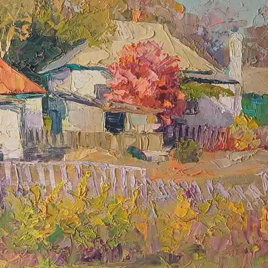 Dive into the essence of fall with "October is Upon Us," an exquisite oil painting by the acclaimed artist Serdyuk Boris Petrovich. This artwork perfectly captures the tranquil atmosphere of a rural yard on a warm October day, surrounded by the vibrant hues of autumn. A small, cozy house nestles amid trees and bushes, adorned in the season's fiery palette, creating a scene of serene beauty and warmth.