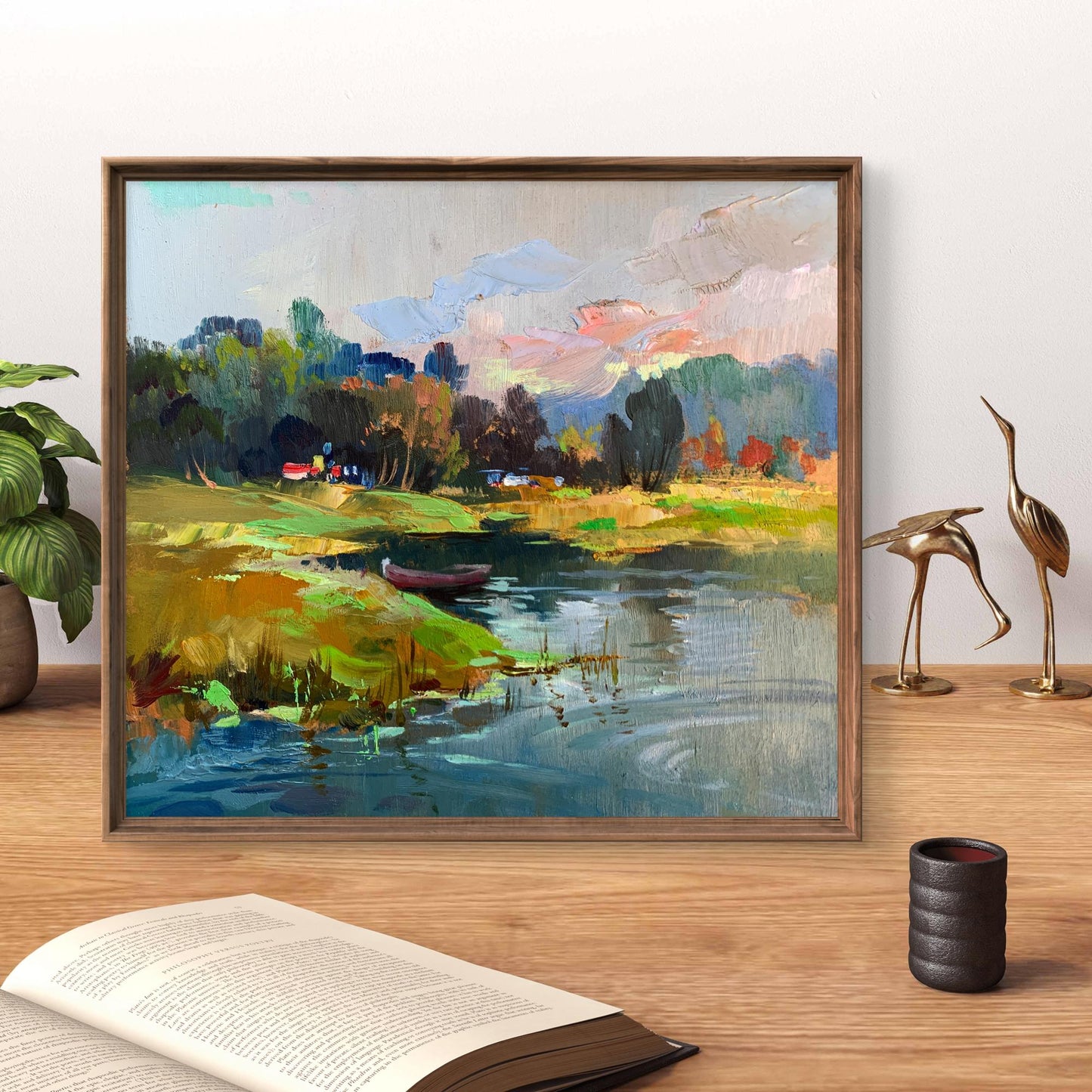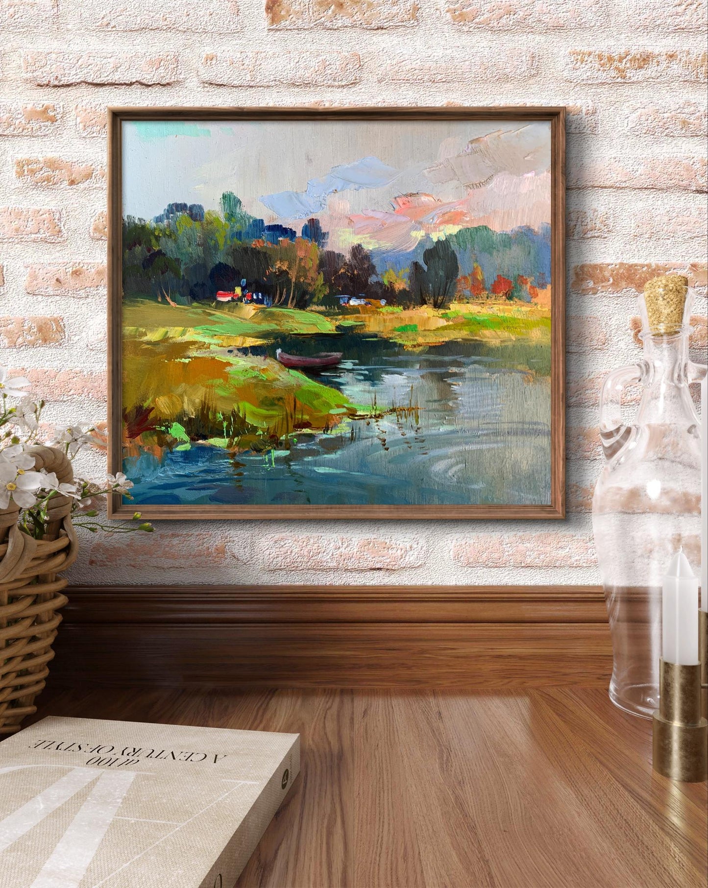 The painting "On the Left Bank of the River" captures a serene and picturesque riverside landscape, inviting the viewer into a moment of peace and natural beauty. Executed in oil on cardboard, the artwork skillfully balances vibrant colors and soft textures to depict a quiet, unspoiled scene along the water’s edge. The composition is dominated by the interplay of light and shadow, creating a harmonious atmosphere that feels both intimate and expansive.In the foreground, the left bank of the river is rendered in earthy tones of green, gold, and brown, punctuated by patches of wild grass and reeds. A small, weathered wooden boat rests on the shore, its muted red-brown color contrasting gently with the cooler tones of the water. The stillness of the boat evokes a sense of quiet solitude, suggesting that it has been left by someone who recently explored or fished along the river.The river itself, flowing calmly through the center of the composition, reflects the surrounding landscape and the soft hues of the sky above. Delicate ripples and reflections bring a sense of movement to the otherwise tranquil scene, drawing the eye across the water and toward the distant shore.The background features a lush forest, painted in rich, layered greens with hints of warm oranges and reds, indicating the onset of autumn. Among the trees, glimpses of small, colorful structures—perhaps houses or cabins—can be seen, adding a human presence to the natural setting. These details are subtle yet significant, emphasizing the harmonious coexistence of people and nature.The sky above is a blend of soft grays, blues, and pastel pinks, with clouds painted in loose, expressive strokes. The light suggests either early morning or late afternoon, a time when the sun casts a gentle glow over the landscape. This interplay of warm and cool tones creates a mood of quiet reflection and timelessness.Through "On the Left Bank of the River," the artist conveys a deep appreciation for the simplicity and beauty of rural life. The painting invites the viewer to pause and enjoy the serenity of nature, highlighting the restorative power of quiet moments by the water. The use of vibrant yet natural colors, combined with soft, impressionistic brushwork, creates a scene that is both vivid and calming.This work serves as a reminder of the delicate balance between human life and the natural world, encouraging the viewer to find peace and inspiration in the gentle rhythms of nature. The artist’s vision captures not just a landscape but a feeling—one of tranquility, connection, and the timeless beauty of a riverside retreat.