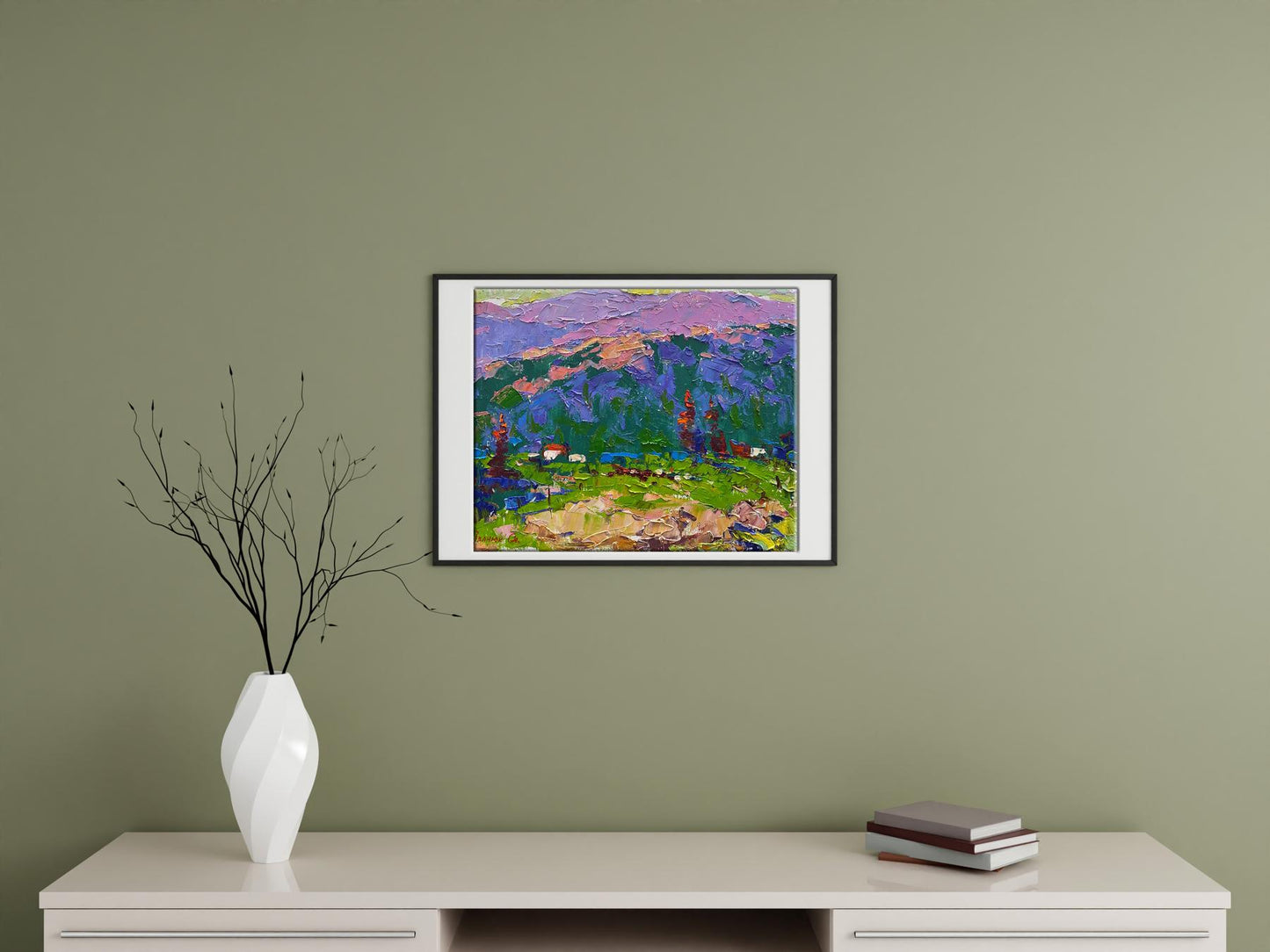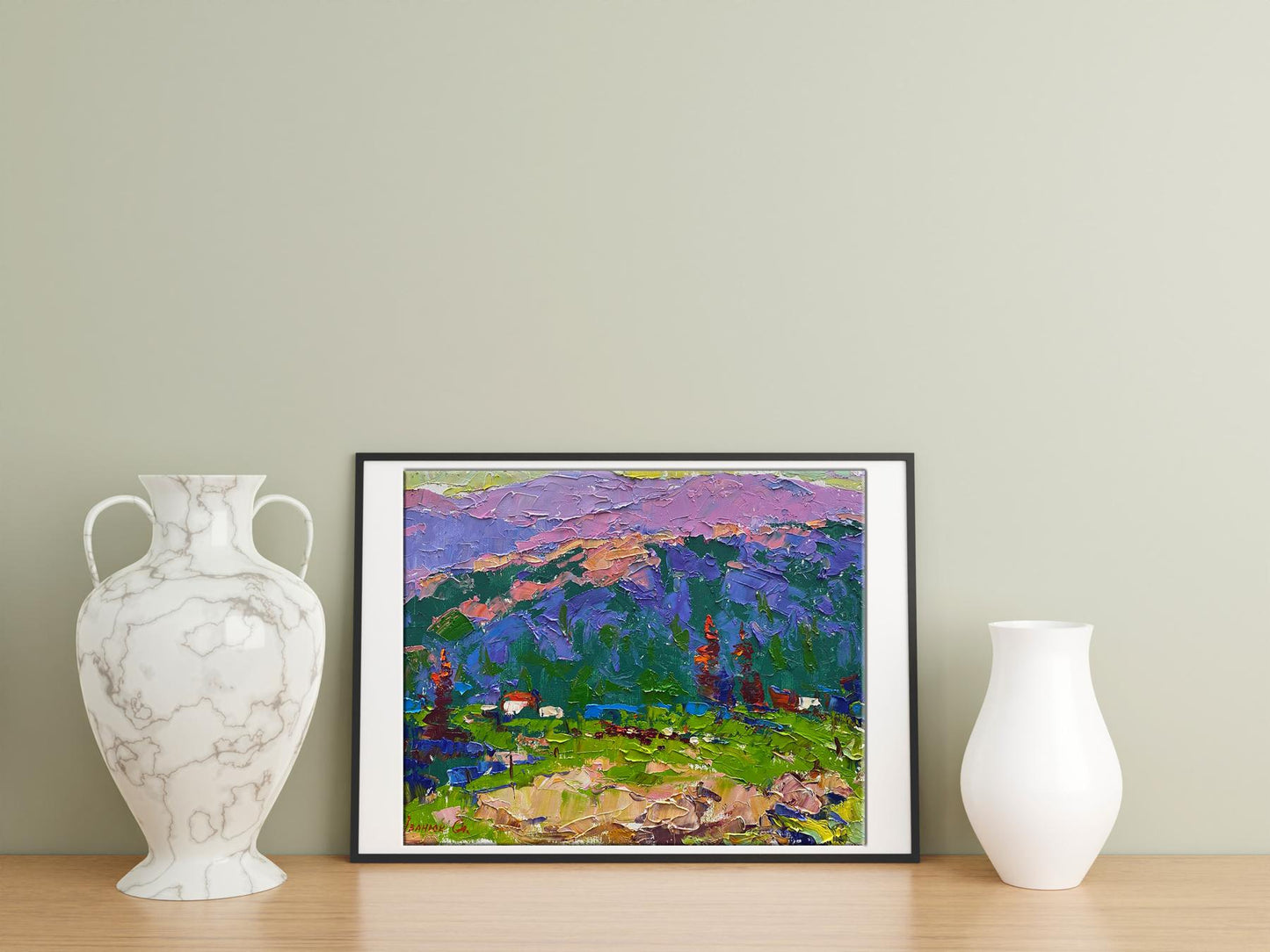 The artist’s use of bold, contrasting colors is particularly striking, with vivid greens, rich purples, and warm reds blending harmoniously to create a lively and captivating landscape. This dynamic use of color invites the viewer to immerse themselves in the beauty of nature, evoking a sense of freedom and calm.