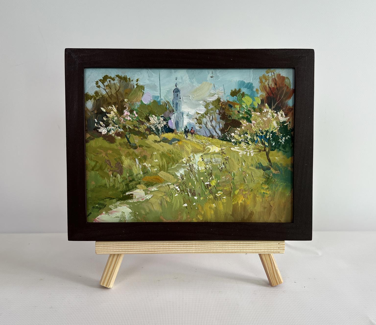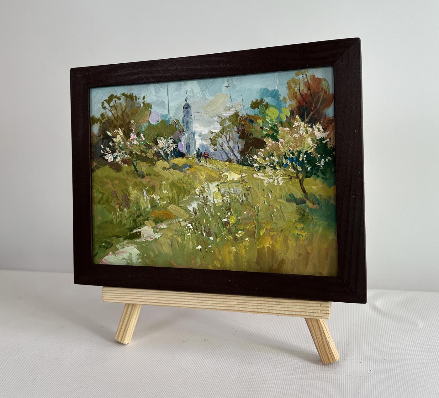 The painting "The Road to the Church" is a masterful depiction of nature’s serenity and the human connection to faith and tranquility. Created with oil on cardboard, the artwork exudes an impressionistic style, characterized by expressive brushstrokes, rich texture, and a harmonious interplay of colors. It captures a picturesque rural landscape where a narrow path winds through lush greenery, leading towards a distant church, partially obscured by the blossoming trees. In the foreground, an abundance of wild grasses, flowers, and plants flourish in a vibrant array of greens, yellows, and subtle earth tones. The artist's brushwork is loose and dynamic, allowing the viewer to feel the movement of the breeze as it rustles through the tall grass. Dashes of white and soft purple suggest the presence of delicate blossoms, adding to the natural splendor of the scene. The uneven, slightly worn path, lined with small stones and patches of bare earth, meanders through the landscape, gently inviting the viewer to embark on the journey toward the church. As the composition progresses, the landscape opens up to a rolling hill bathed in soft light. The middle ground is dominated by the presence of blooming trees, whose branches reach toward the sky, adorned with delicate white and pink blossoms. These trees create a sense of depth and perspective, framing the central path and drawing the viewer’s eye toward the distant figures and the towering silhouette of the church. Two small human figures, painted with loose but intentional strokes, walk along the path towards the sacred building. One figure, clad in a red garment, stands out prominently against the greenery, creating a striking contrast. Their presence adds a narrative element to the painting, suggesting a moment of quiet pilgrimage or a peaceful stroll towards a place of worship. The figures' subtle anonymity allows the viewer to project their own emotions and interpretations onto the scene. The church, nestled among the trees, serves as the focal point of the composition. Its tall, slender tower reaches skyward, a symbol of faith and a beacon for those seeking solace and reflection. Painted in soft blues and whites, the structure appears almost ethereal, blending seamlessly with the pale sky. The slightly blurred edges and atmospheric rendering of the church enhance its mystical presence, making it feel like an integral part of the natural world rather than an imposing structure.