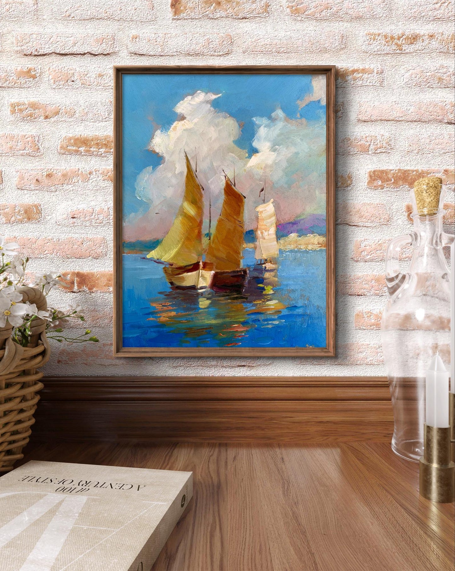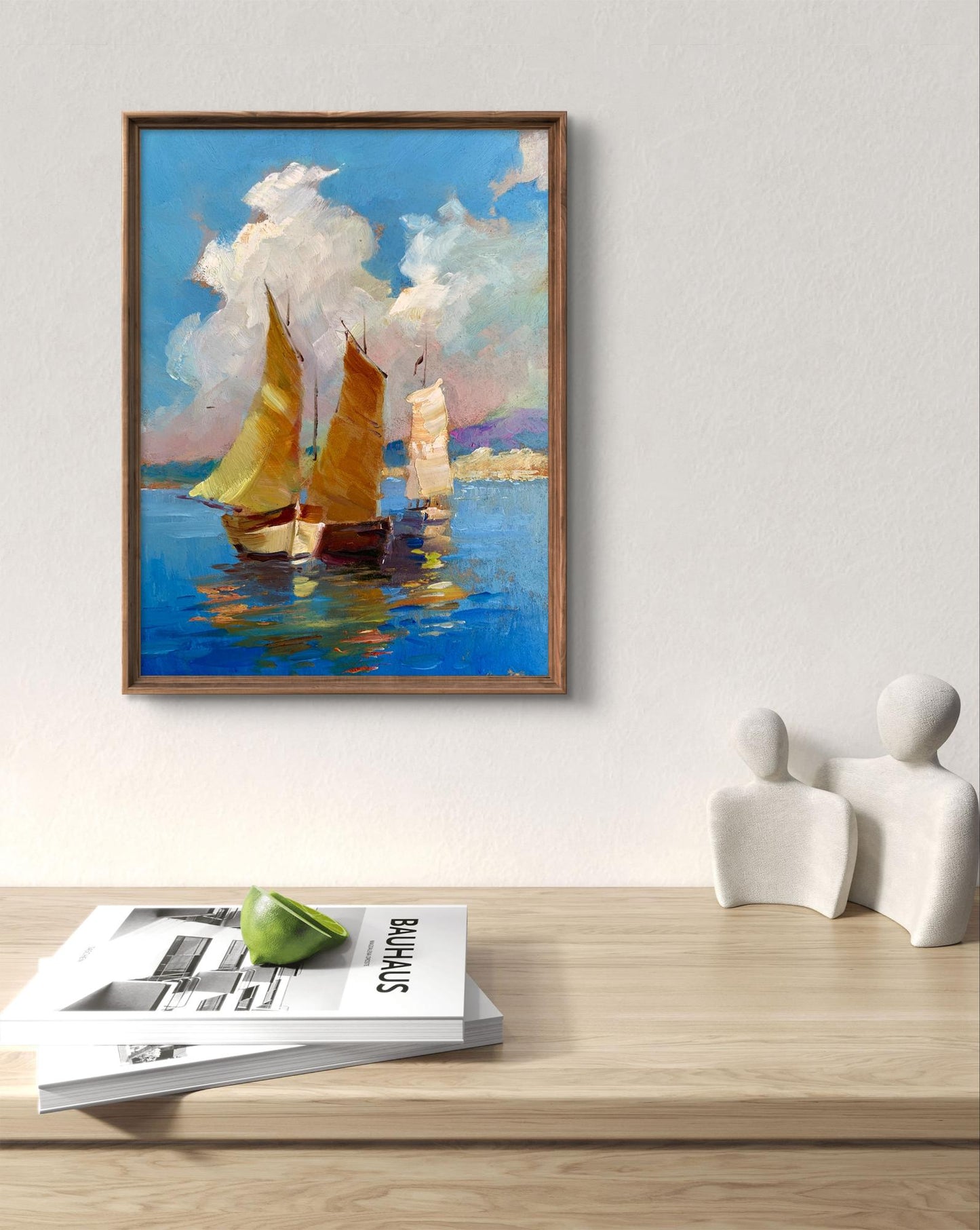 The painting "There is a Sailboat at Sea" captures the tranquil beauty of sailing on calm waters under a radiant sky. Executed in oil on cardboard, the artwork focuses on two sailboats gliding gracefully across the shimmering surface of the sea. The composition immerses the viewer in a serene maritime scene, evoking a sense of freedom, exploration, and harmony with nature.The sailboats, with their tall, golden sails catching the sunlight, dominate the foreground. Their hulls, painted in warm earthy tones, reflect the light, creating a vivid interplay of color and shadow. The sails, rendered in rich shades of yellow and gold, stand out against the blue sky and sea, symbolizing movement and vitality. The detailed yet impressionistic brushstrokes capture the texture of the canvas sails as they billow in the gentle breeze.The water beneath the boats is painted in vibrant shades of blue, punctuated with shimmering reflections of the sails and the sky. The dynamic ripples and waves on the surface create a sense of motion, giving life to the scene. The reflection of the sails in the water adds depth and symmetry, drawing the viewer’s eye into the composition.In the background, the horizon is softened by the faint outlines of distant land, painted in pastel tones of purple and beige. These muted colors create a sense of depth and tranquility, balancing the vividness of the foreground. The sky above is a vibrant mix of blue and white, with voluminous clouds painted in soft, textured strokes. The clouds seem to glow, capturing the warmth of the sun and adding a dreamy, ethereal quality to the scene.Through "There is a Sailboat at Sea," the artist conveys the beauty of simplicity and the profound sense of peace that comes from being close to nature. The sailboats, carried by the wind, symbolize freedom and the human spirit’s connection to the natural world. The harmonious color palette and fluid brushstrokes evoke feelings of calm and introspection, inviting the viewer to pause and immerse themselves in the moment.This painting celebrates the timeless allure of the sea, highlighting its ability to inspire and rejuvenate. The artist invites the viewer to reflect on the balance between human presence and the vastness of nature, capturing the essence of a perfect day on the water. It is a tribute to the joys of sailing and the serenity found in open waters.