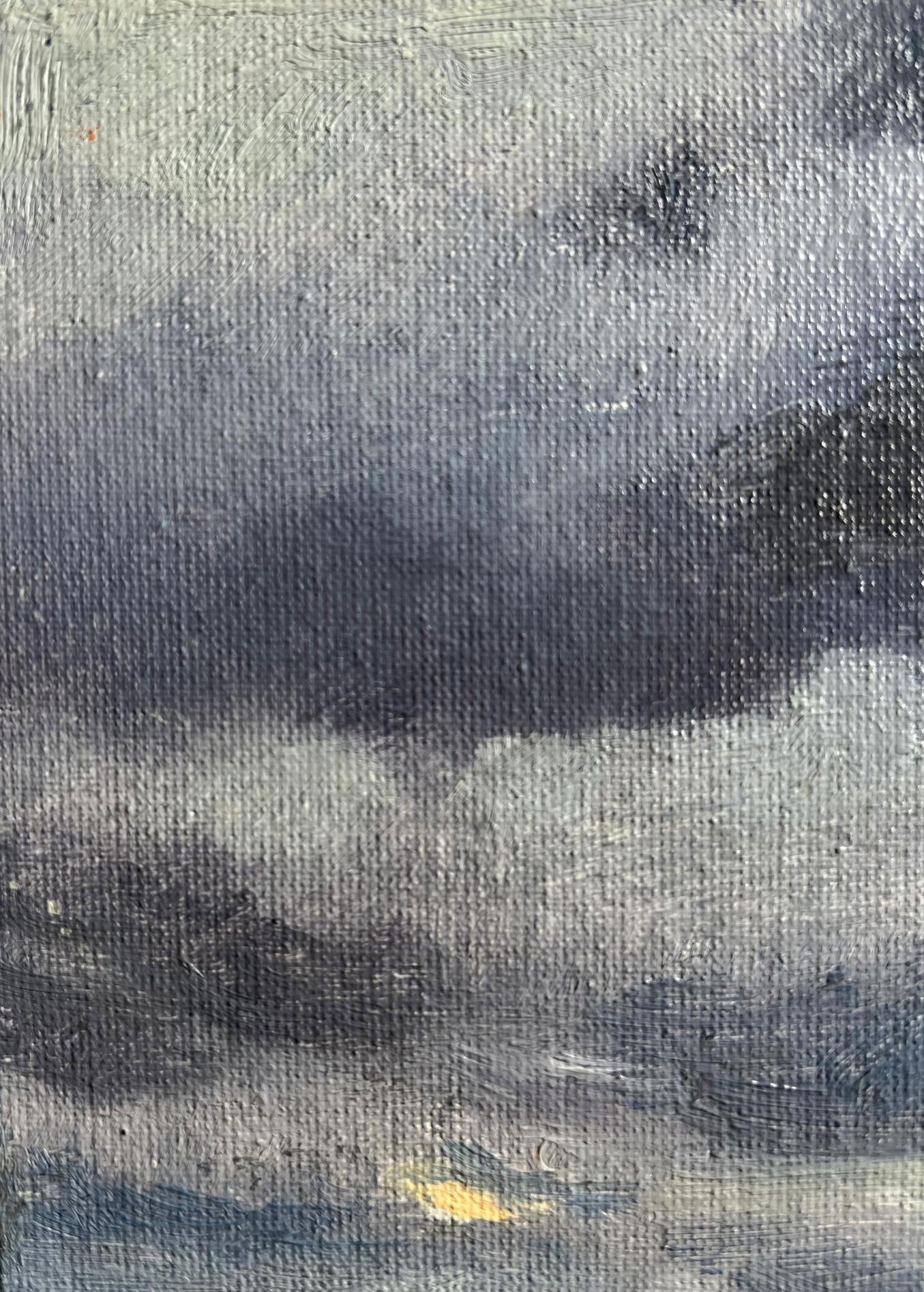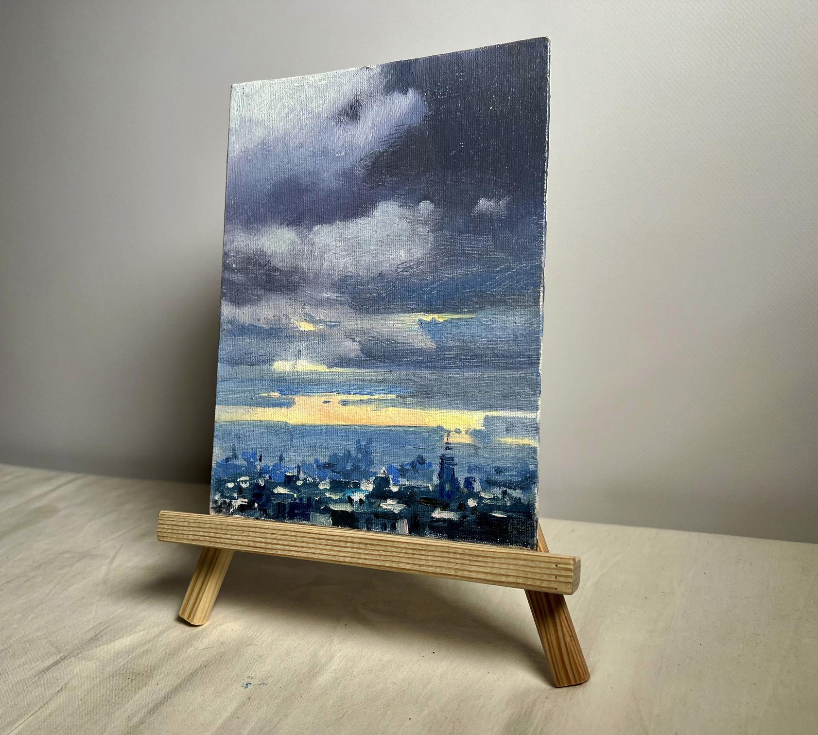 "Yellow Sunset Over the City" is a moody and atmospheric Oil painting on cardboard that captures the fleeting beauty of twilight over an urban landscape. The composition is divided into three main elements: the cityscape, the sky, and the dramatic play of light that bridges the two.The lower portion of the painting features a hazy city skyline, painted in deep blues and muted grays. The buildings appear as silhouettes, their forms softened by distance and atmospheric perspective. A few architectural elements, such as towers and rooftops, emerge from the mist, hinting at the grandeur of the city while maintaining an overall sense of anonymity. The indistinct nature of the buildings allows the viewer’s imagination to fill in the details, making the city feel both familiar and universal.Above the city, the sky dominates the scene with a striking contrast of dark, heavy clouds and a band of golden light near the horizon. The upper sky is painted in deep shades of gray and blue, creating an ominous and almost stormy atmosphere. The thick clouds, rendered with bold and expressive brushstrokes, add a sense of movement, as if they are shifting and changing with the wind.In stark contrast to the brooding sky, a warm glow of yellow and orange emerges just above the horizon. This golden light, diffused by the clouds, is the heart of the painting, drawing the eye and evoking a sense of hope and tranquility. The reflection of this warm hue on the lower clouds adds depth and richness to the composition, creating a transition between the darkness above and the city below.Through this painting, the artist conveys a sense of contrast—not just in color and light, but in emotion and atmosphere. The dark clouds symbolize the weight of urban life, the struggles, and uncertainties that come with it. Yet, the golden sunset offers a glimmer of hope, a moment of beauty amidst the chaos. The scene suggests a quiet contemplation of time and transience, as day gives way to night, and the city continues its ceaseless rhythm beneath the ever-changing sky."Yellow Sunset Over the City" invites the viewer to pause and reflect, to appreciate the fleeting moments of beauty that nature offers, even in the heart of a bustling metropolis. It is a reminder that light always finds a way through the darkness, and that even the most dramatic skies can hold a quiet sense of peace