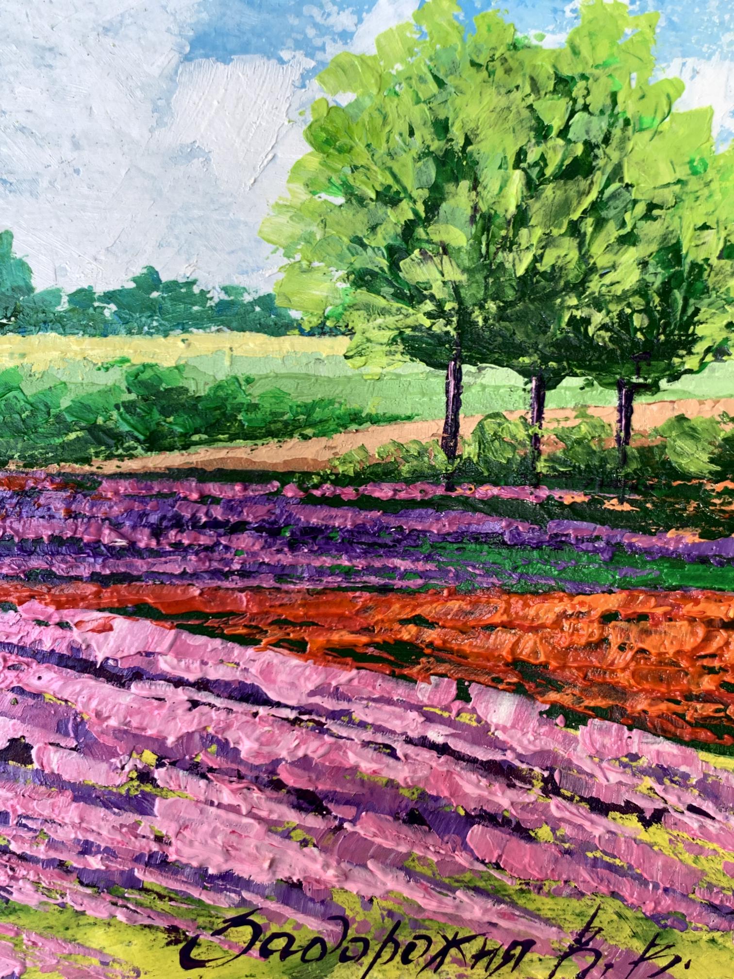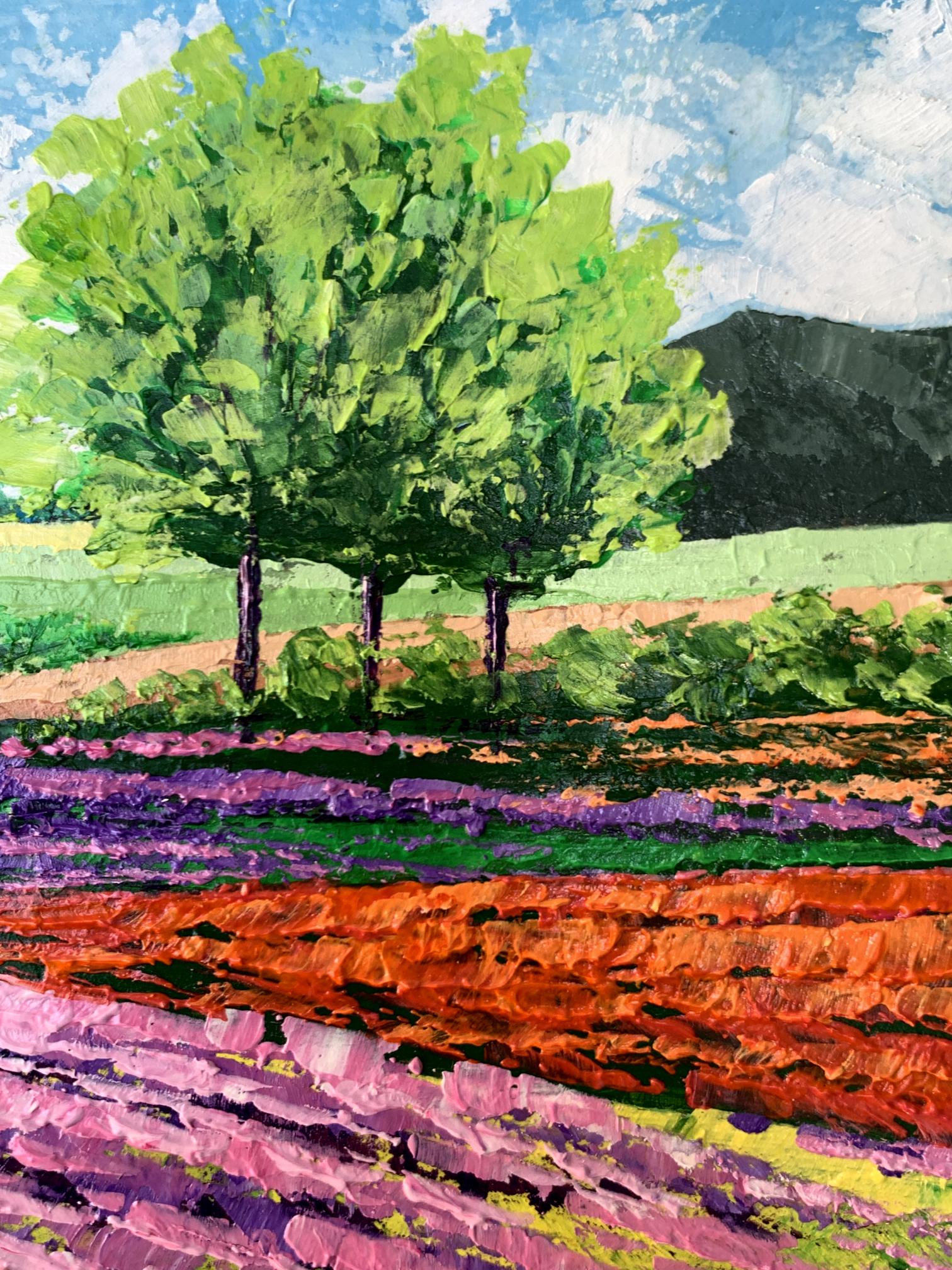 The painting titled "Flower Fields Near the Mountains" is a vivid and expressive oil on cardboard piece that captures the serene beauty of a countryside landscape. The artwork bursts with color and texture, immersing the viewer in a scene of blooming fields, lush greenery, and distant mountains under a bright blue sky.In the foreground, vibrant flower fields stretch out in rows of rich purples, reds, and magentas, creating a striking visual impact. The flowers, painted with thick, textured strokes, exude a sense of vitality and abundance. The use of impasto technique enhances the tactile quality of the flowers, allowing their colors to stand out and almost leap off the canvas. The rows of flowers guide the viewer's eyes toward the middle ground, where two lush green trees stand side by side, symbolizing balance and harmony in nature.Beyond the trees, the landscape transitions to rolling green hills, gradually meeting the base of dark, distant mountains. The mountains, painted in muted tones, provide a sense of depth and stability, contrasting with the lively colors of the foreground. Above, the sky is a brilliant expanse of blue, punctuated by soft, fluffy clouds that add to the overall sense of tranquility and openness.Through this painting, the artist seeks to convey the coexistence of vibrancy and calm in nature. The flower fields, with their bold colors, symbolize the energy and renewal of life, while the trees and mountains in the background provide a grounding sense of continuity and endurance. The composition suggests a harmonious relationship between the dynamic and the still, the near and the far, the ephemeral and the eternal."Flower Fields Near the Mountains" invites viewers to pause and reflect on the beauty of natural landscapes, encouraging them to appreciate the delicate balance that sustains the environment. The artist's choice of colors and textures creates an emotional resonance, evoking feelings of joy, peace, and a deep connection to the earth. This work stands as a celebration of nature's splendor and a reminder of its capacity to inspire and heal.