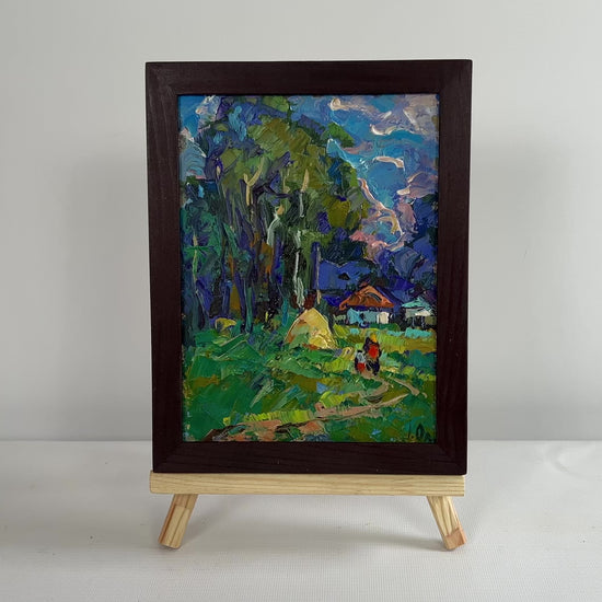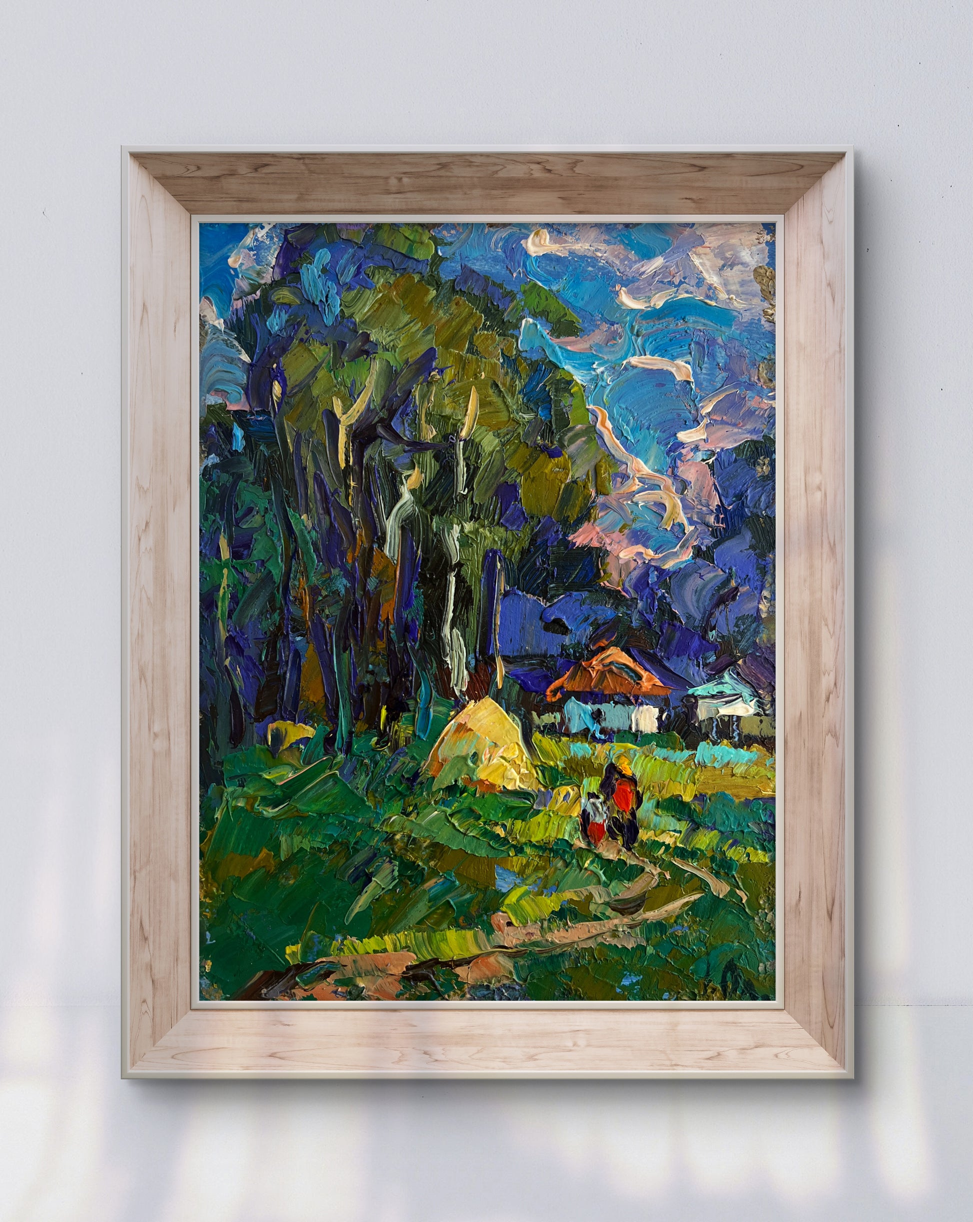The painting "House near the Forest" is a vivid depiction of a serene rural scene where nature and human life coexist in harmony. Executed in a rich impasto technique with thick strokes of oil paint on cardboard, the artwork radiates depth and texture, drawing the viewer into its immersive landscape. The composition is centered around a lush green forest, its towering trees reaching upward with a mix of dark and vibrant greens. The foliage, painted with energetic and expressive strokes, gives a sense of movement, as if swaying in a gentle breeze. The variation of deep blues and purples within the trees adds contrast, creating a cool shadowy atmosphere that enhances the painting’s depth. The artist has skillfully layered colors, allowing glimpses of sky through the gaps in the canopy, where soft, swirling pink and blue tones create a dreamy, tranquil mood. A bright yellow haystack sits prominently in the foreground, standing in contrast to the cool tones of the surrounding vegetation. This golden element acts as a focal point, pulling the viewer’s gaze toward the heart of the rural scene. Its rough texture, achieved through thick, energetic brushstrokes, captures the rustic charm of a countryside setting. The houses, nestled near the edge of the forest, are painted in warm earthy tones, with rooftops of deep orange and brown blending seamlessly into the natural surroundings. The cottages have a humble and inviting appearance, their small windows glowing with a sense of life. The artist’s use of loose, impressionistic strokes gives the structures an organic, almost dreamlike quality, making them feel as though they are a natural extension of the landscape. In the lower right-hand corner, two figures stand near a narrow dirt path that winds its way through the grassy terrain. One figure, draped in red, appears to be guiding the other, perhaps a child, toward the houses. Their presence adds a human element to the otherwise wild and untouched setting, infusing the painting with warmth and narrative intrigue. The figures, though abstract in detail, are expressive in posture, conveying a sense of companionship and purpose.