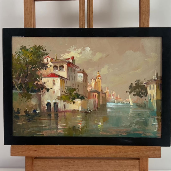 The painting "Romantic Evening in Venice" captures the timeless charm and poetic atmosphere of one of the world's most enchanting cities. The delicate play of light and shadow creates a scene that immerses the viewer in the gentle tranquility of Venice’s canals as the day transitions into night. The palette of warm earthy tones, soft golds, and deep browns reflects the fading sunlight as it caresses the historic buildings, lending them an ethereal glow. In the foreground, grand Venetian palazzos rise from the water’s edge, their façades rich with history. The architecture, with its arched windows, textured walls, and signature red-tiled rooftops, conveys a sense of old-world elegance. The buildings' reflections shimmer gently on the surface of the water, creating a mesmerizing dance of light and color. The presence of greenery climbing up the walls adds a natural, intimate touch, softening the rigid stone structures. The canal itself, calm and mirror-like, is punctuated by the iconic gondolas that glide effortlessly through its waters. A gondolier in traditional attire, standing gracefully at the helm of his boat, guides his vessel through the labyrinth of waterways, adding a sense of movement to the stillness of the evening. Another gondola, nestled near the building’s entrance, hints at unseen lovers or travelers savoring a quiet moment on the water. Further into the composition, the perspective leads the eye toward the distant cityscape, where the iconic domes and bell towers of Venice rise against the dusky sky. The fading sunlight illuminates the architectural details, highlighting the majesty of the city’s skyline. The distant sailboats drifting along the Grand Canal suggest a gentle breeze, bringing life to the otherwise serene evening. Above, the sky is painted in soft hues of warm gray and dusty gold, with wisps of clouds catching the last remnants of sunlight. The atmosphere is heavy with romance, the air seemingly filled with the distant sounds of lapping water, the hushed whispers of lovers, and the melodic strains of a violin played from a passing gondola.