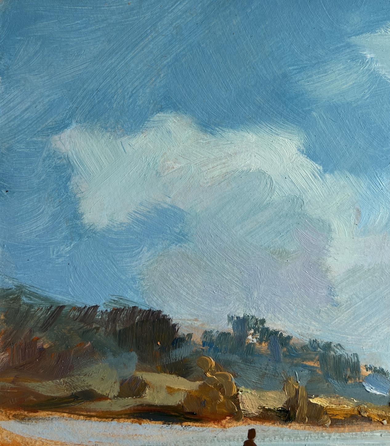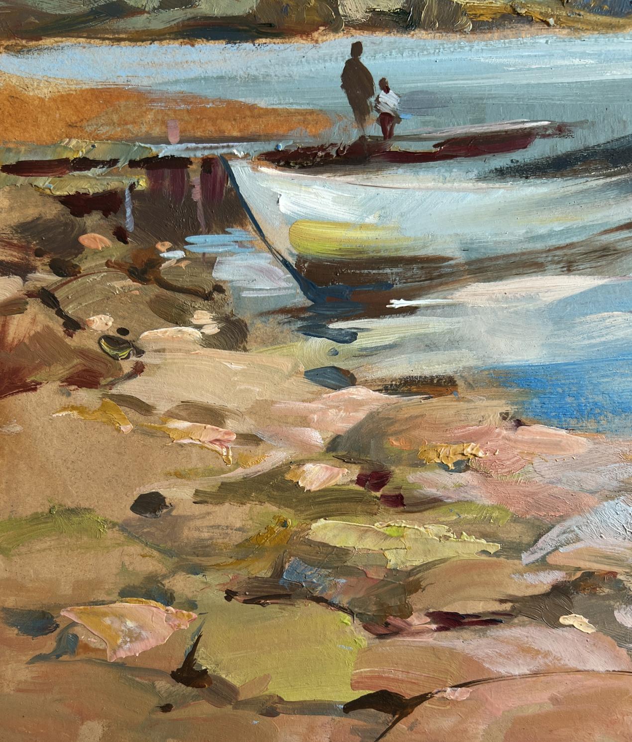 The painting "Sailing on a Yacht" captures the serene beauty of a peaceful coastal landscape, where the shimmering waters of the bay reflect the crisp blue sky. The artist uses bold and expressive brushstrokes to convey a sense of movement in the water, the gentle sway of the sailboats, and the warm, sunlit atmosphere that bathes the entire scene in a golden glow. At the center of the composition, two majestic sailboats with tall, white sails glide gracefully across the water. Their reflections create a mesmerizing interplay of light and shadow on the rippling surface. The sails catch the warm hues of the sun, adding subtle tones of orange and pink, contrasting beautifully with the deep blues of the sky and water. The boats are positioned in a way that suggests movement, as if they are leisurely drifting, enjoying the wind’s soft embrace. In the foreground, a smaller wooden rowboat rests near the shore, its hull partially submerged in the shallow water. The boat is painted with a mix of soft whites and blues, blending harmoniously with the surroundings. Nearby, a figure stands on the dock, accompanied by a child, observing the yachts as they sail away. The presence of these figures adds a human element to the composition, evoking a sense of nostalgia and peaceful contemplation. The shoreline is adorned with warm, earthy tones, with rocks and sand depicted in rich hues of ochre, sienna, and rust. The textured brushstrokes add depth and realism to the rugged terrain, leading the viewer’s eye toward the distant horizon, where the coastline gently fades into a hazy blue. In the background, rolling hills and distant trees form a tranquil backdrop, painted in muted greens and soft browns. The landscape is subtly blended, allowing the sky and water to take center stage while still providing a sense of depth and scale. The sky itself is a masterpiece, with delicate wisps of clouds drifting lazily across, their soft forms illuminated by the sunlight. The artist masterfully captures the essence of a carefree summer day by the sea, where the joy of sailing and the quiet beauty of nature merge into one harmonious scene. The use of light and color creates an atmosphere of warmth and relaxation, inviting the viewer to step into this idyllic setting and experience the gentle rhythm of the water and the soothing sound of the waves.