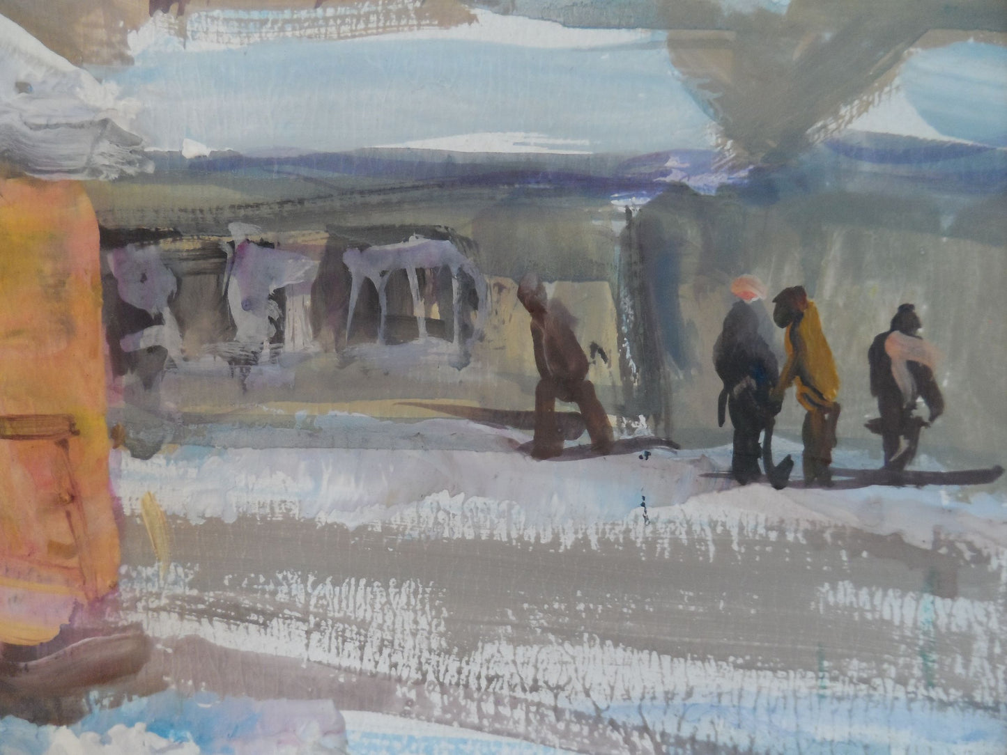 The painting features a rural train station with a brightly colored train carriage at its center, creating a striking contrast against the white snow and the subdued tones of the surrounding buildings and distant mountains. The backdrop, a majestic panorama of snow-covered mountains, adds depth and scale to the scene. Myshurovsky's use of soft, blended brushstrokes crafts a calm, almost muted atmosphere, capturing the stillness typical of a snowy day in a secluded village. Small figures, depicted going about their daily activities, bring the painting to life, showcasing the continuity of life despite the season's harshness.