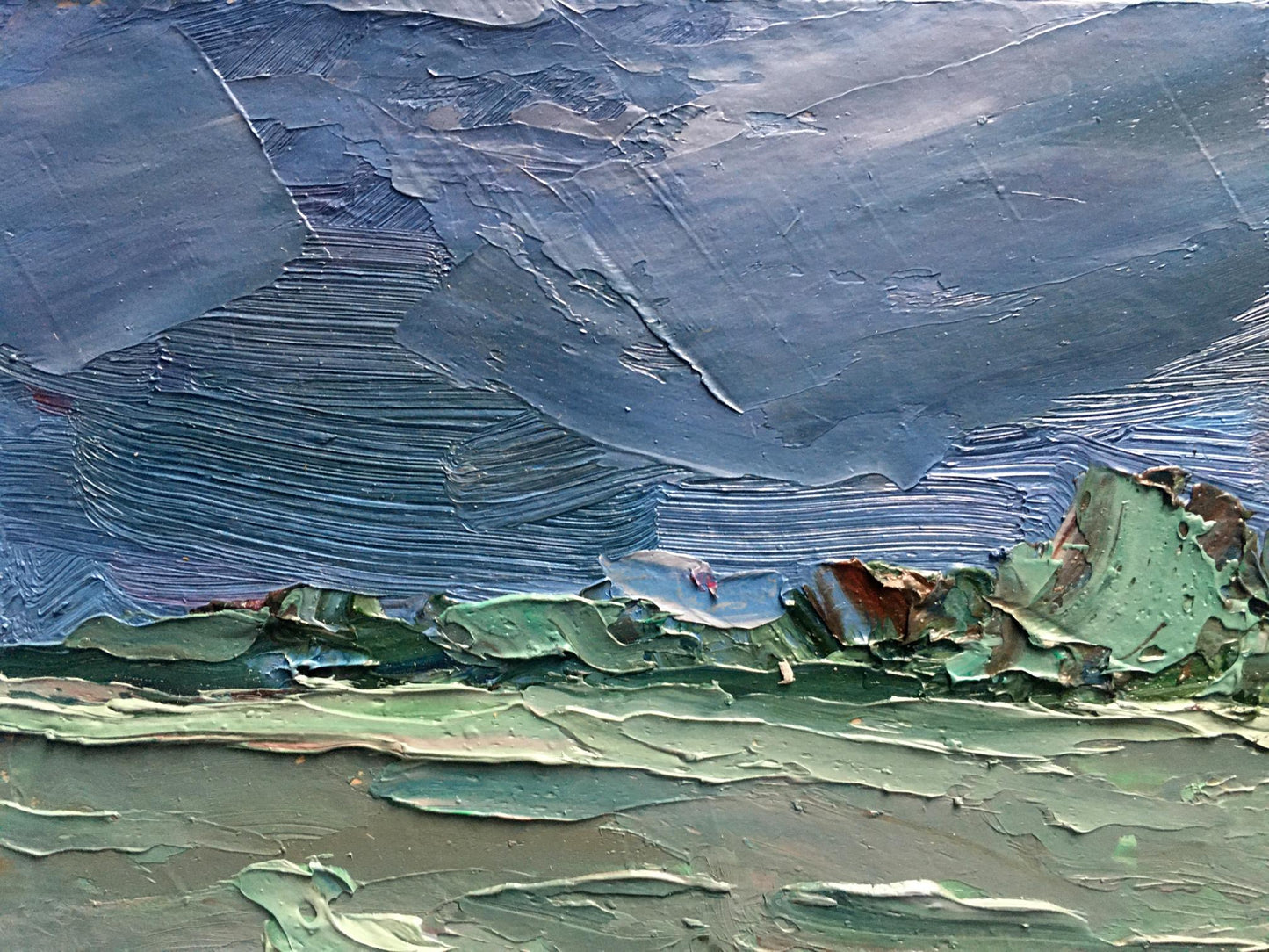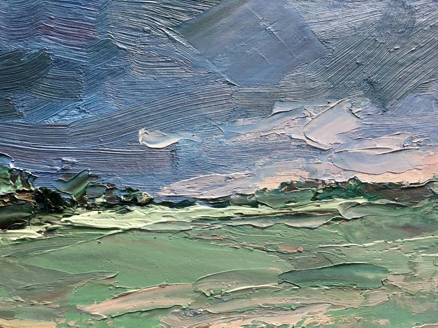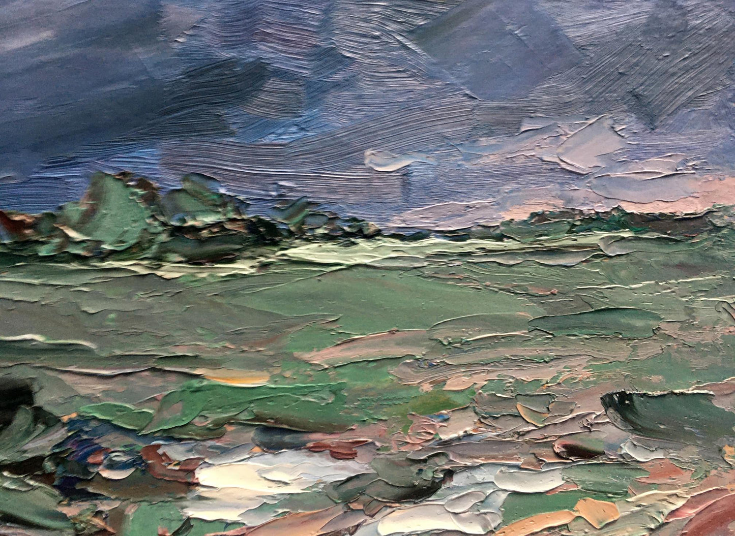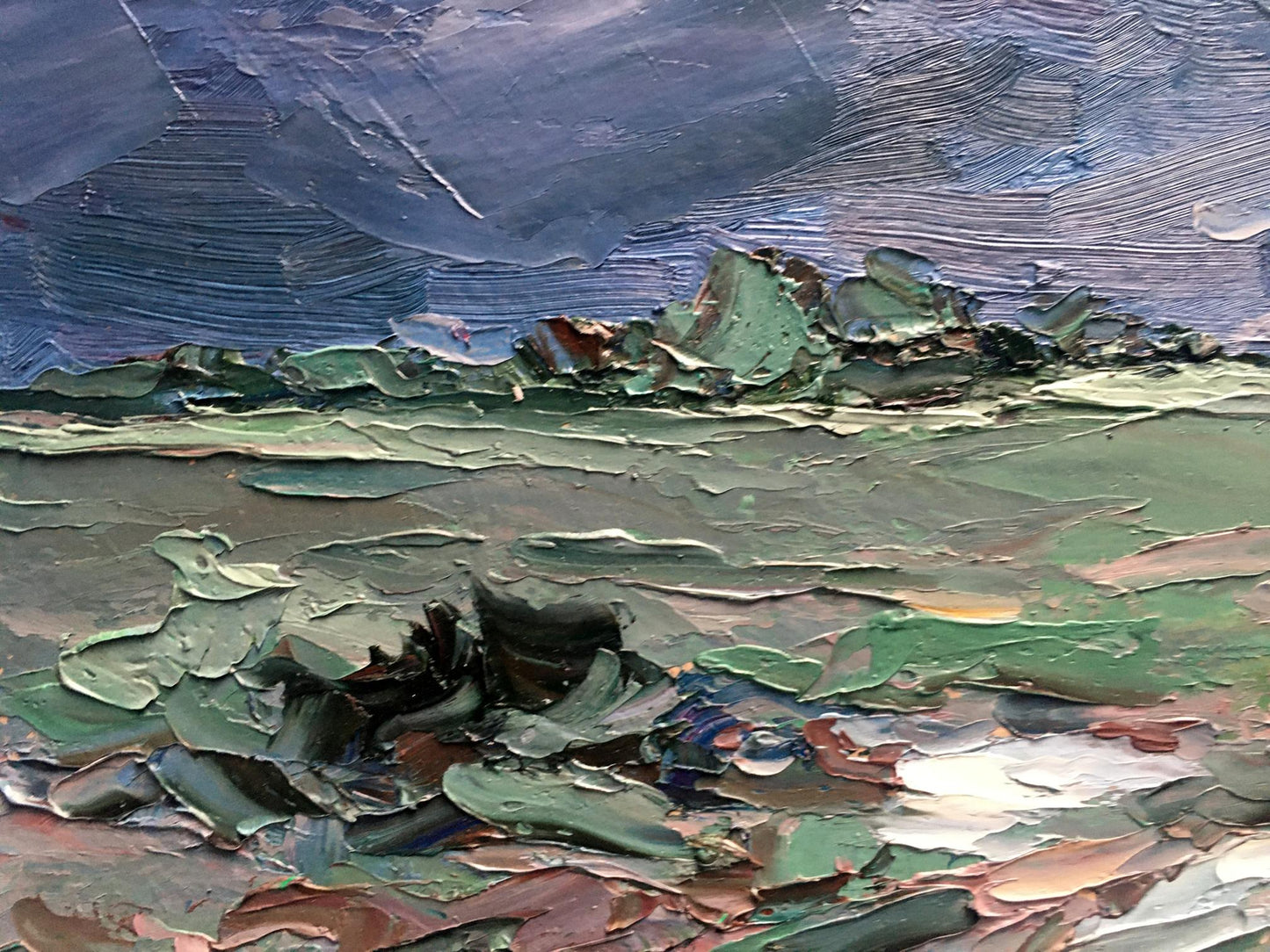 Cherednichenko’s palette of cool greens and blues infuses the scene with a moist, expectant quality, making the viewer almost feel the humidity and tension in the air. The rugged, uneven ground, painted with earthy tones, adds to the scene's rawness, as if the earth itself is preparing for the impact of the coming rain. The distant horizon stretches out, suggesting a vast and open landscape about to be enveloped by the storm.