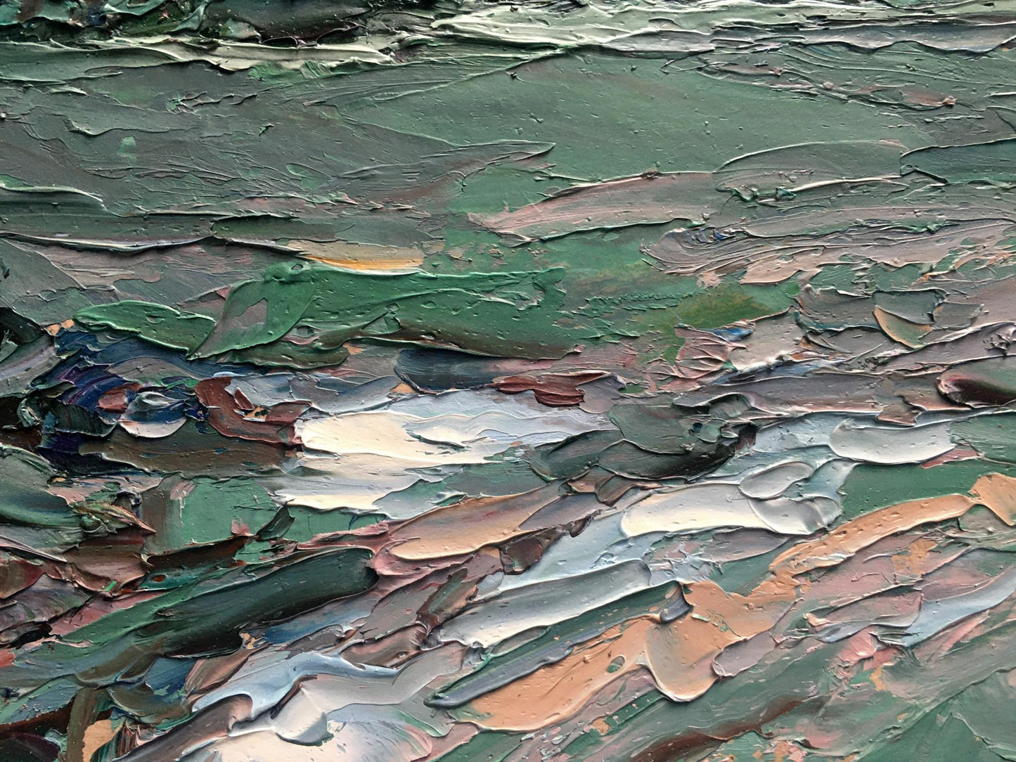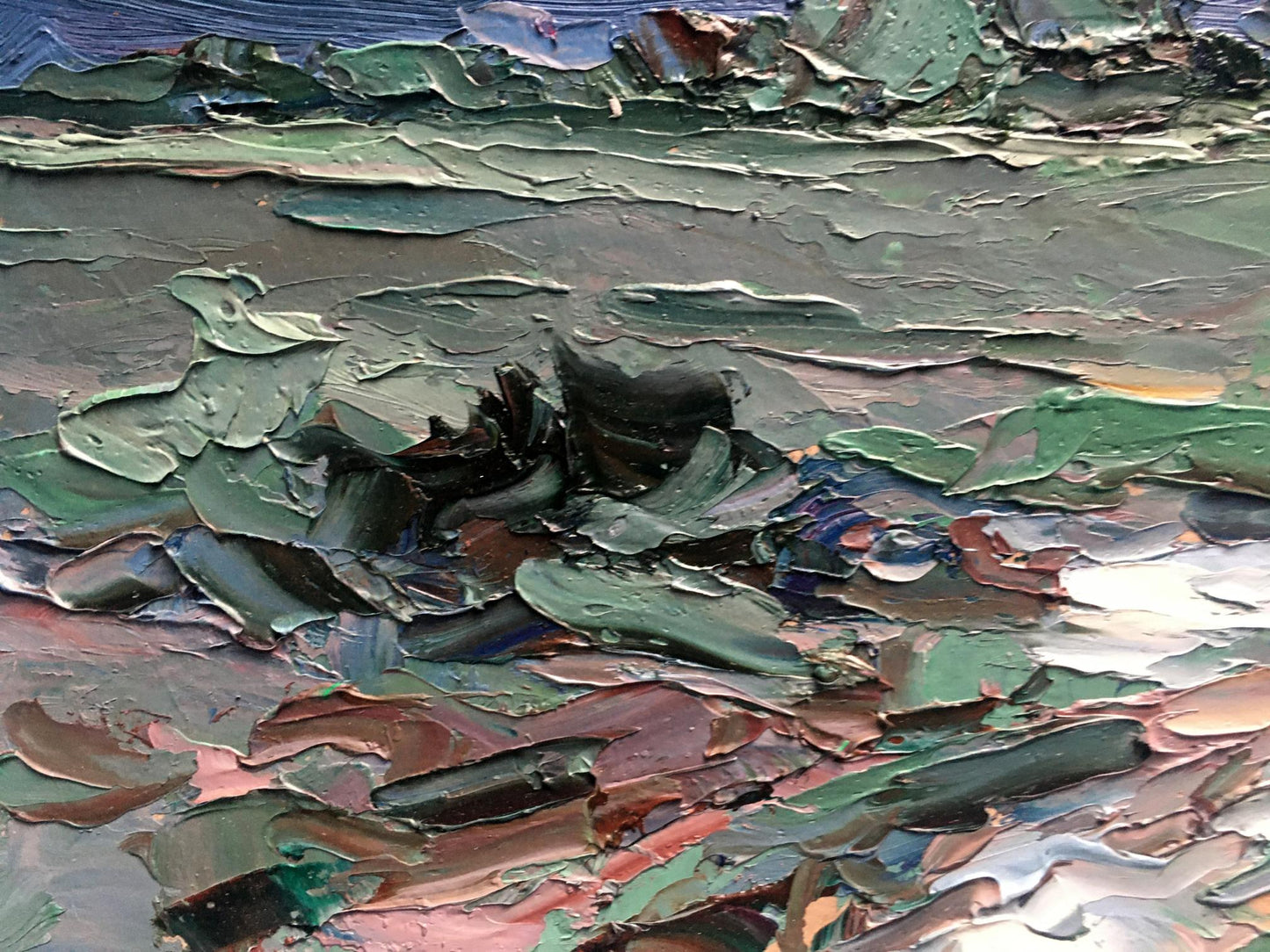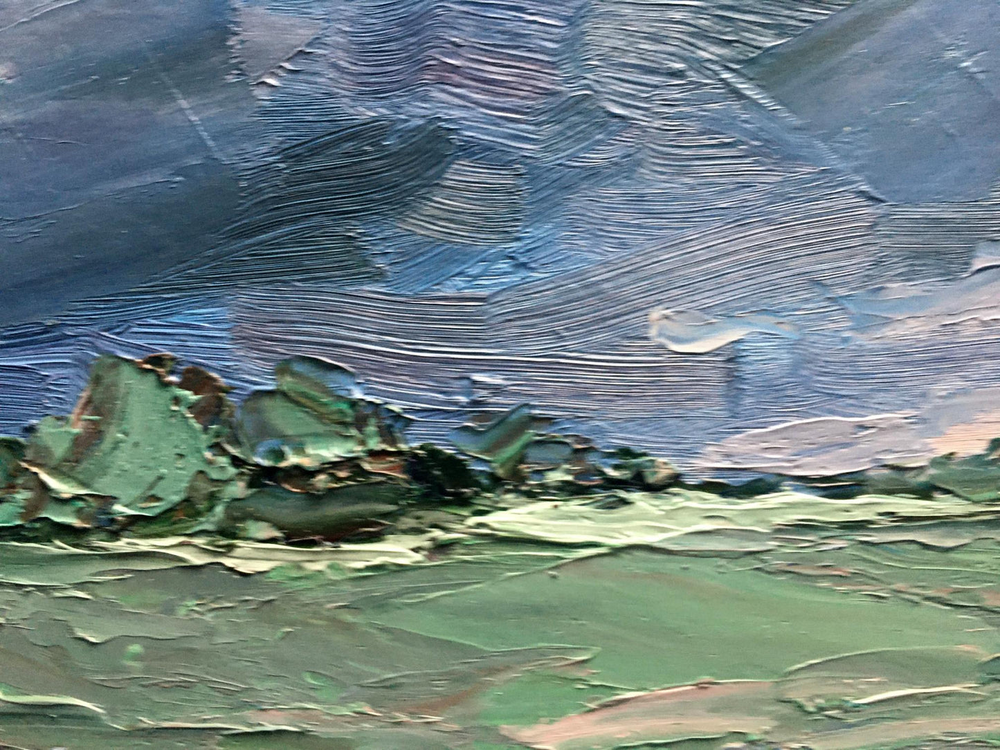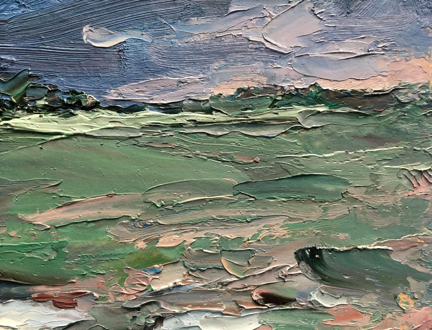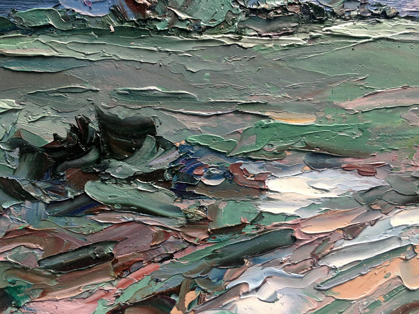 Cherednichenko’s palette of cool greens and blues infuses the scene with a moist, expectant quality, making the viewer almost feel the humidity and tension in the air. The rugged, uneven ground, painted with earthy tones, adds to the scene's rawness, as if the earth itself is preparing for the impact of the coming rain. The distant horizon stretches out, suggesting a vast and open landscape about to be enveloped by the storm.