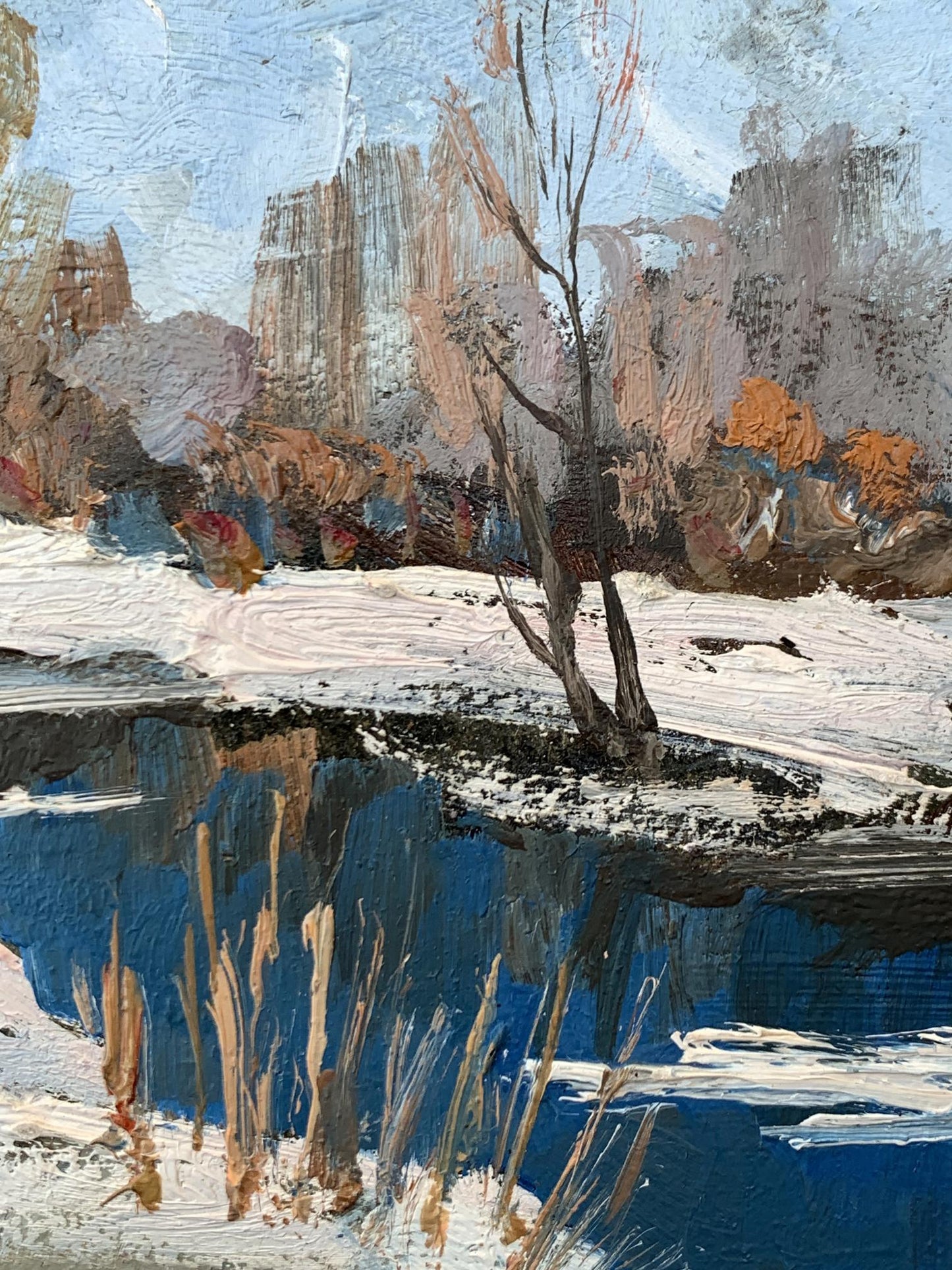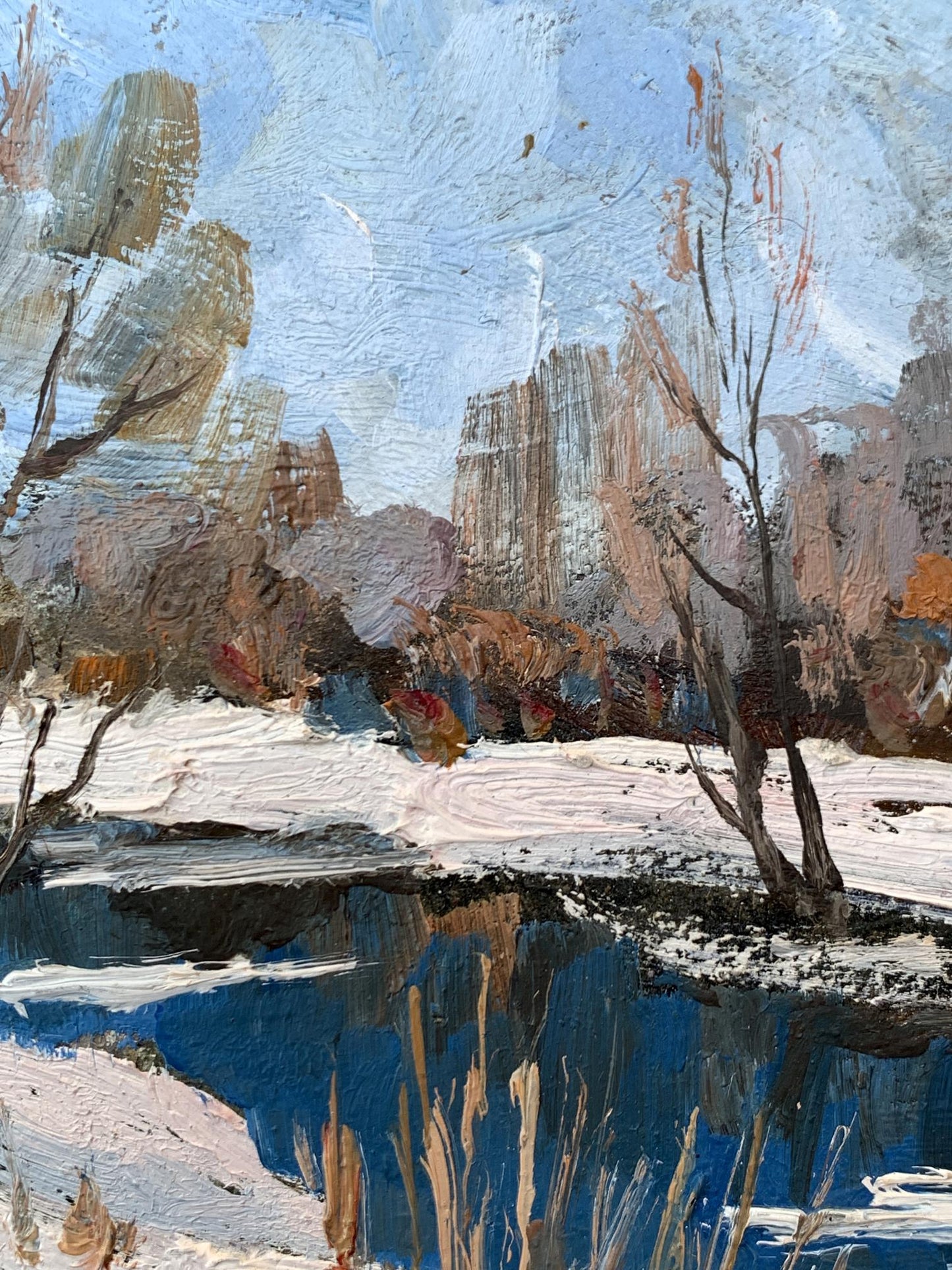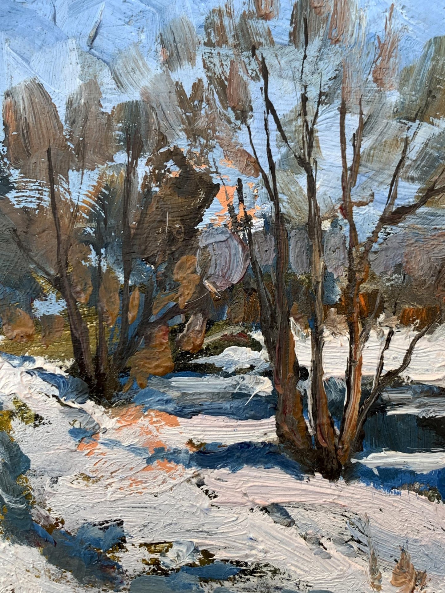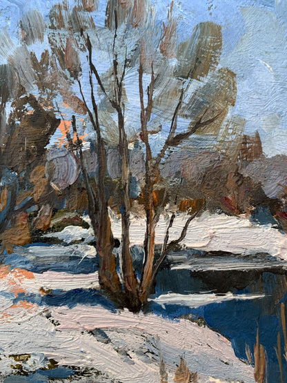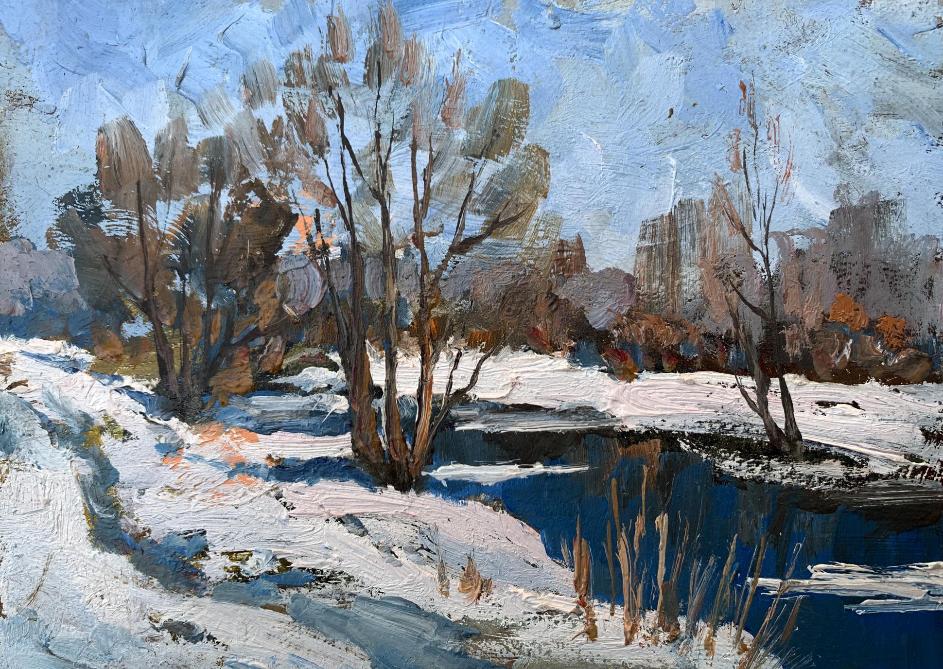 The painting "Bright Winter Meadow" is a captivating depiction of a serene winter landscape, skillfully rendered with oil on cardboard. The artist masterfully captures the crispness of a cold, sunny day, where nature appears tranquil yet full of life. The scene is filled with vibrant contrasts and dynamic elements that draw the viewer into the heart of the meadow.In the foreground, a meandering river reflects the deep blue of the sky, its surface broken by streaks of ice and gentle ripples. The water, with its dark tones and shimmering highlights, serves as a central focal point, dividing the composition and providing a sense of depth. Surrounding the river, patches of snow blanket the ground, painted in shades of white, blue, and soft orange, suggesting the sunlight's warm touch on a chilly day.The trees, both bare and partially covered in subtle foliage, stand tall and graceful along the riverbank. Their slender trunks and intricate branches create a rhythmic pattern, leading the viewer's eye toward the distant horizon. The artist employs a palette of muted browns, warm ochres, and delicate grays to depict the trees, adding a natural and harmonious contrast to the icy tones of the snow and water.In the background, the meadow extends toward a line of distant trees and gentle hills, rendered in soft, diffused colors. The warm light of the winter sun bathes the scene, creating long shadows and a golden glow that adds a touch of warmth to the otherwise cold environment. The vibrant blue sky above, with its hints of white clouds, enhances the sense of openness and tranquility.Through "Bright Winter Meadow," the artist aims to convey the peaceful beauty of winter in nature. The interplay of light and shadow, along with the careful balance of warm and cool tones, evokes a sense of serenity and quiet reflection. The painting celebrates the stillness and clarity of a bright winter day, reminding the viewer of the subtle joys found in nature's seasonal transformations. It invites us to pause, observe, and appreciate the delicate balance of life and light in even the coldest of settings.