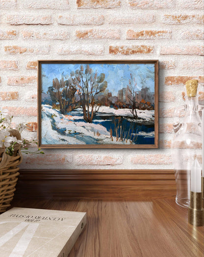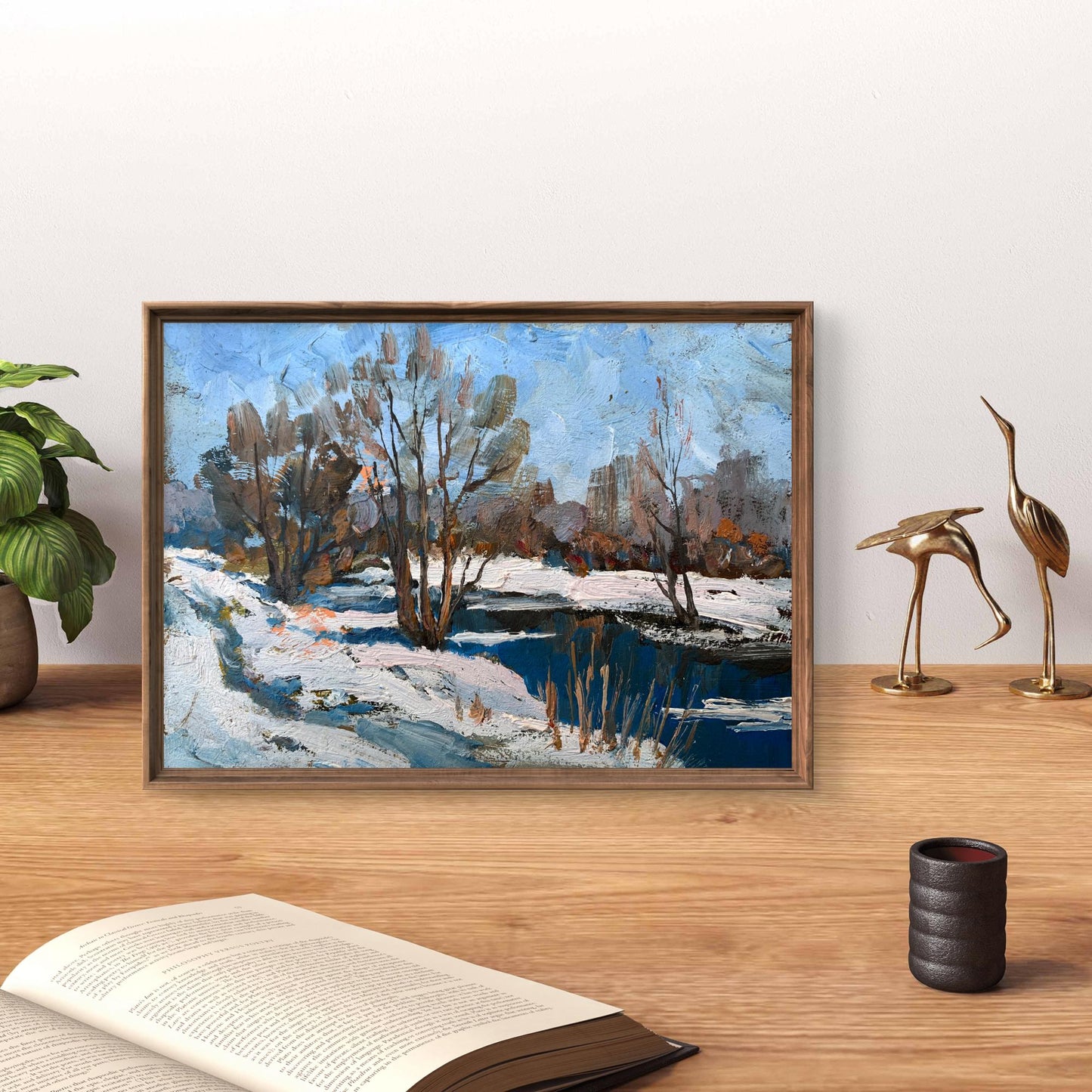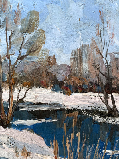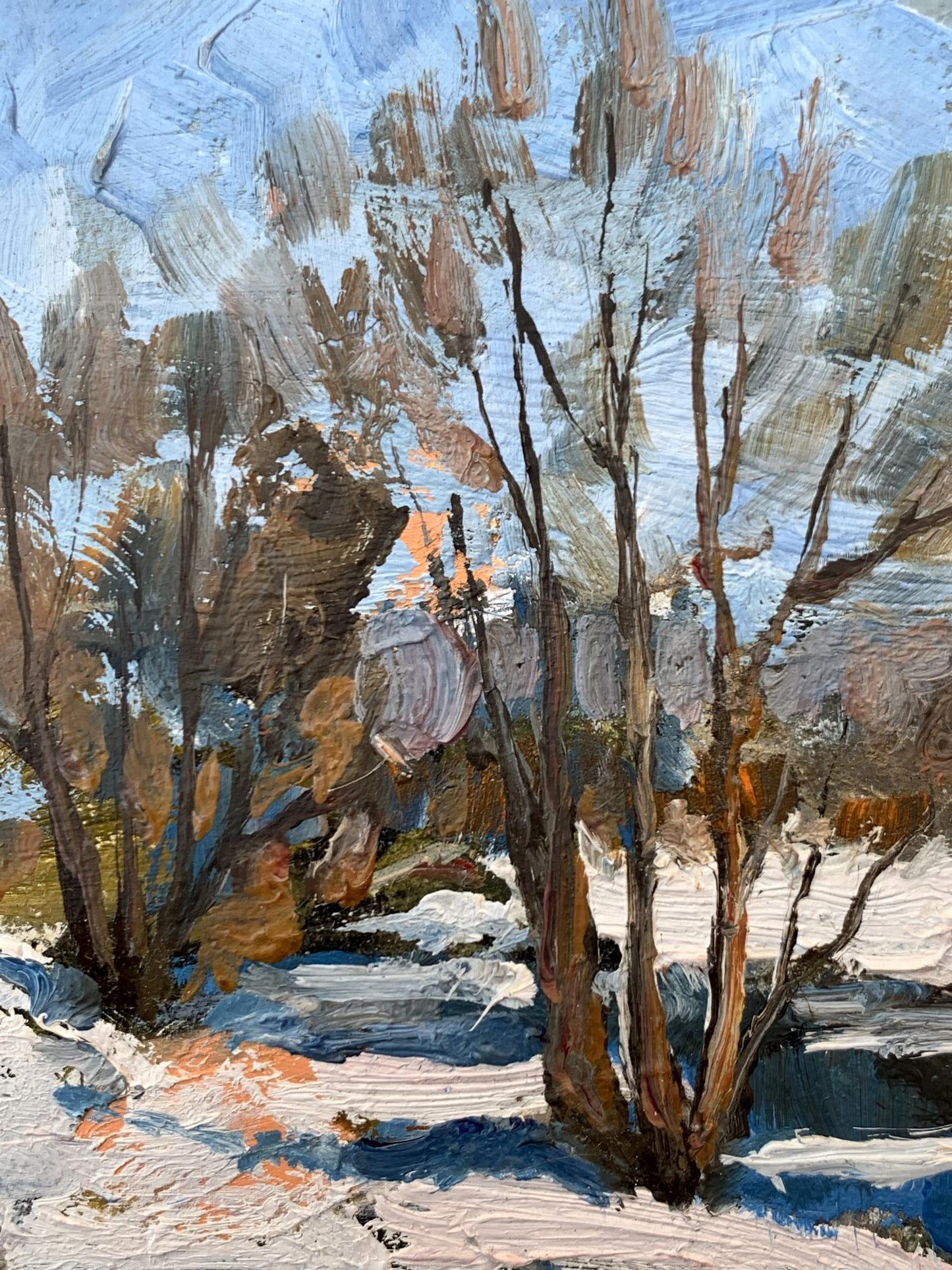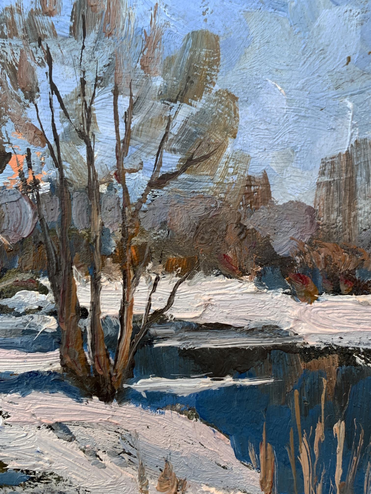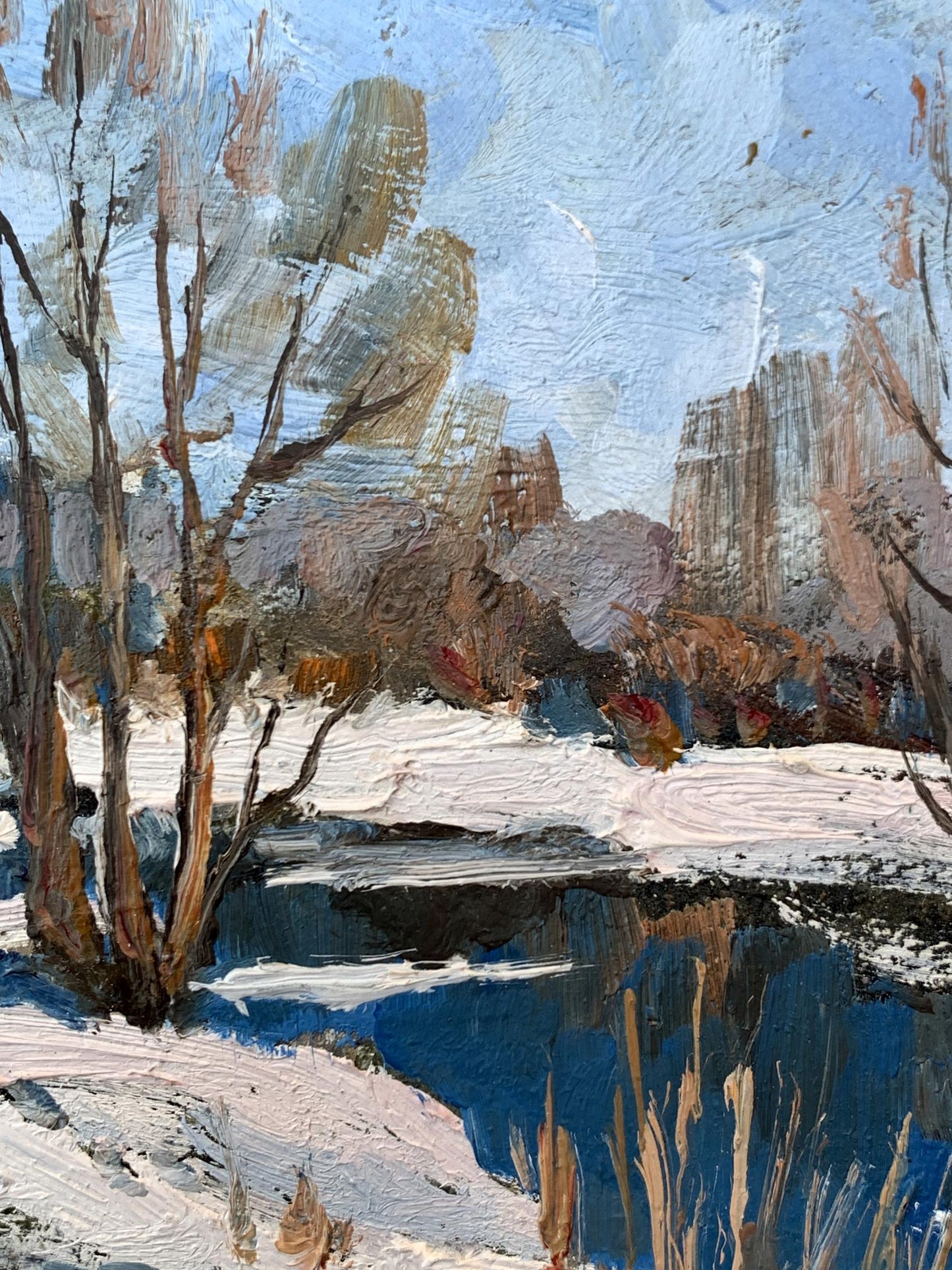 The painting "Bright Winter Meadow" is a captivating depiction of a serene winter landscape, skillfully rendered with oil on cardboard. The artist masterfully captures the crispness of a cold, sunny day, where nature appears tranquil yet full of life. The scene is filled with vibrant contrasts and dynamic elements that draw the viewer into the heart of the meadow.In the foreground, a meandering river reflects the deep blue of the sky, its surface broken by streaks of ice and gentle ripples. The water, with its dark tones and shimmering highlights, serves as a central focal point, dividing the composition and providing a sense of depth. Surrounding the river, patches of snow blanket the ground, painted in shades of white, blue, and soft orange, suggesting the sunlight's warm touch on a chilly day.The trees, both bare and partially covered in subtle foliage, stand tall and graceful along the riverbank. Their slender trunks and intricate branches create a rhythmic pattern, leading the viewer's eye toward the distant horizon. The artist employs a palette of muted browns, warm ochres, and delicate grays to depict the trees, adding a natural and harmonious contrast to the icy tones of the snow and water.In the background, the meadow extends toward a line of distant trees and gentle hills, rendered in soft, diffused colors. The warm light of the winter sun bathes the scene, creating long shadows and a golden glow that adds a touch of warmth to the otherwise cold environment. The vibrant blue sky above, with its hints of white clouds, enhances the sense of openness and tranquility.Through "Bright Winter Meadow," the artist aims to convey the peaceful beauty of winter in nature. The interplay of light and shadow, along with the careful balance of warm and cool tones, evokes a sense of serenity and quiet reflection. The painting celebrates the stillness and clarity of a bright winter day, reminding the viewer of the subtle joys found in nature's seasonal transformations. It invites us to pause, observe, and appreciate the delicate balance of life and light in even the coldest of settings.