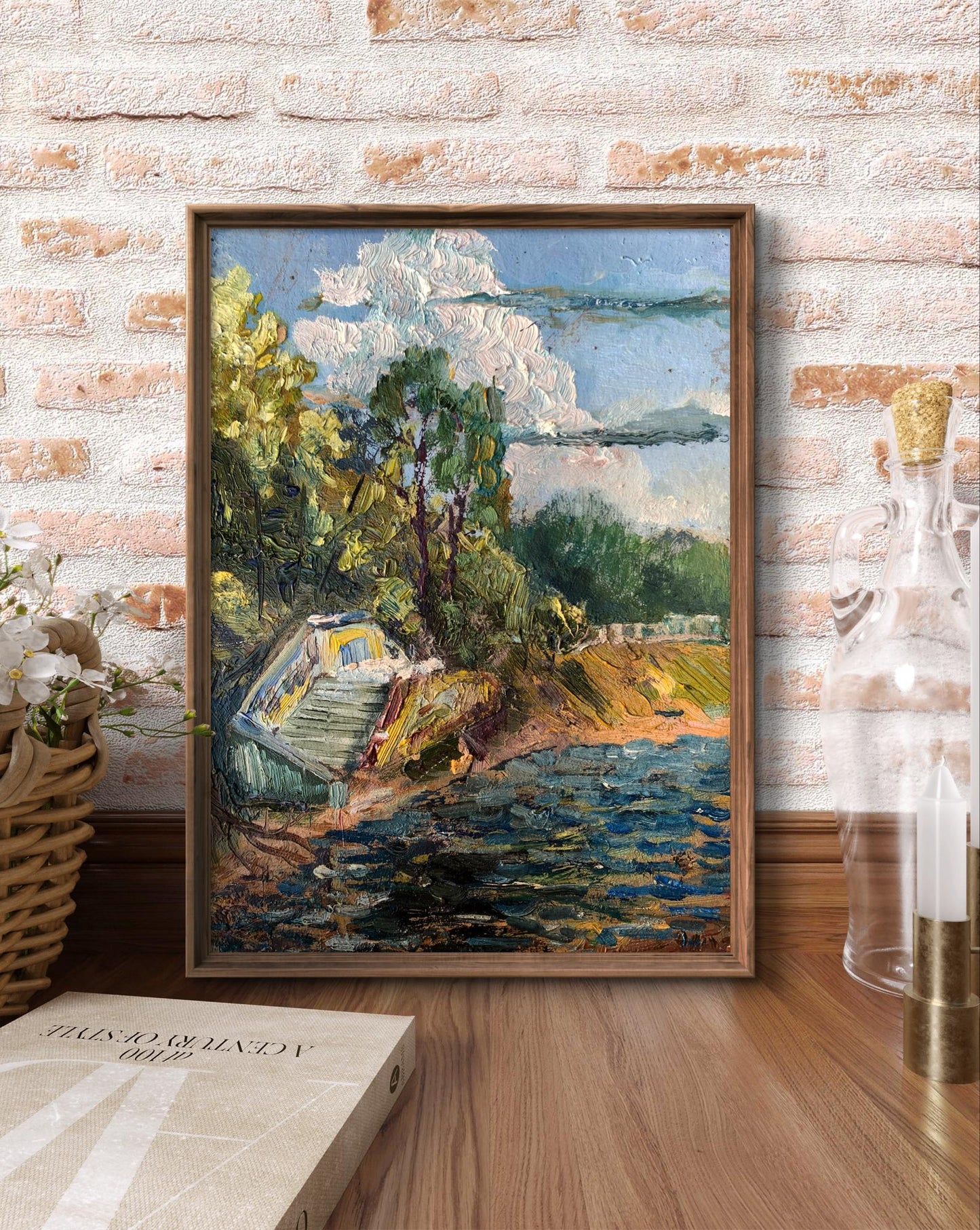The painting titled "City Park with a Lake", created in oil on cardboard, vividly captures the tranquil beauty of a natural retreat within an urban environment. The composition is dominated by a lush green shoreline, where trees and foliage grow thickly, their leaves shimmering with sunlight. The painter uses expressive, textured brushstrokes to bring the greenery to life, suggesting movement in the wind and the vitality of nature.To the left, a small wooden boat rests on the embankment, partially concealed by overhanging branches. The boat, painted in subdued tones of white and blue, provides a sense of human presence without disrupting the natural tranquility of the scene. Its placement near the water’s edge conveys a feeling of stillness and quiet waiting, as though it is inviting viewers to imagine themselves stepping into it to drift across the serene lake.The lake itself, occupying the bottom portion of the painting, is depicted with deep blue and green hues, reflecting the surrounding trees and the sky above. The textured waves suggest a gentle ripple across the water's surface, likely caused by a light breeze. The right side of the composition reveals a sloping bank, leading toward what appears to be a pathway or park structure, hinting at the park's role as a shared public space.The sky above is a striking element of the painting, filled with large, billowing clouds that seem to float effortlessly. Their soft white tones are contrasted against the warm blue of the sky, creating a dynamic yet peaceful atmosphere. The clouds' texture mirrors the thick application of paint used for the trees and water, unifying the elements of the composition.Through this work, the artist seeks to emphasize the harmonious coexistence of human life and nature within a cityscape. The painting invites viewers to reflect on the importance of green spaces as places of respite and contemplation. The scene evokes a sense of nostalgia and serenity, encouraging the audience to appreciate the simplicity and beauty of moments spent in nature, even in the midst of urban life.