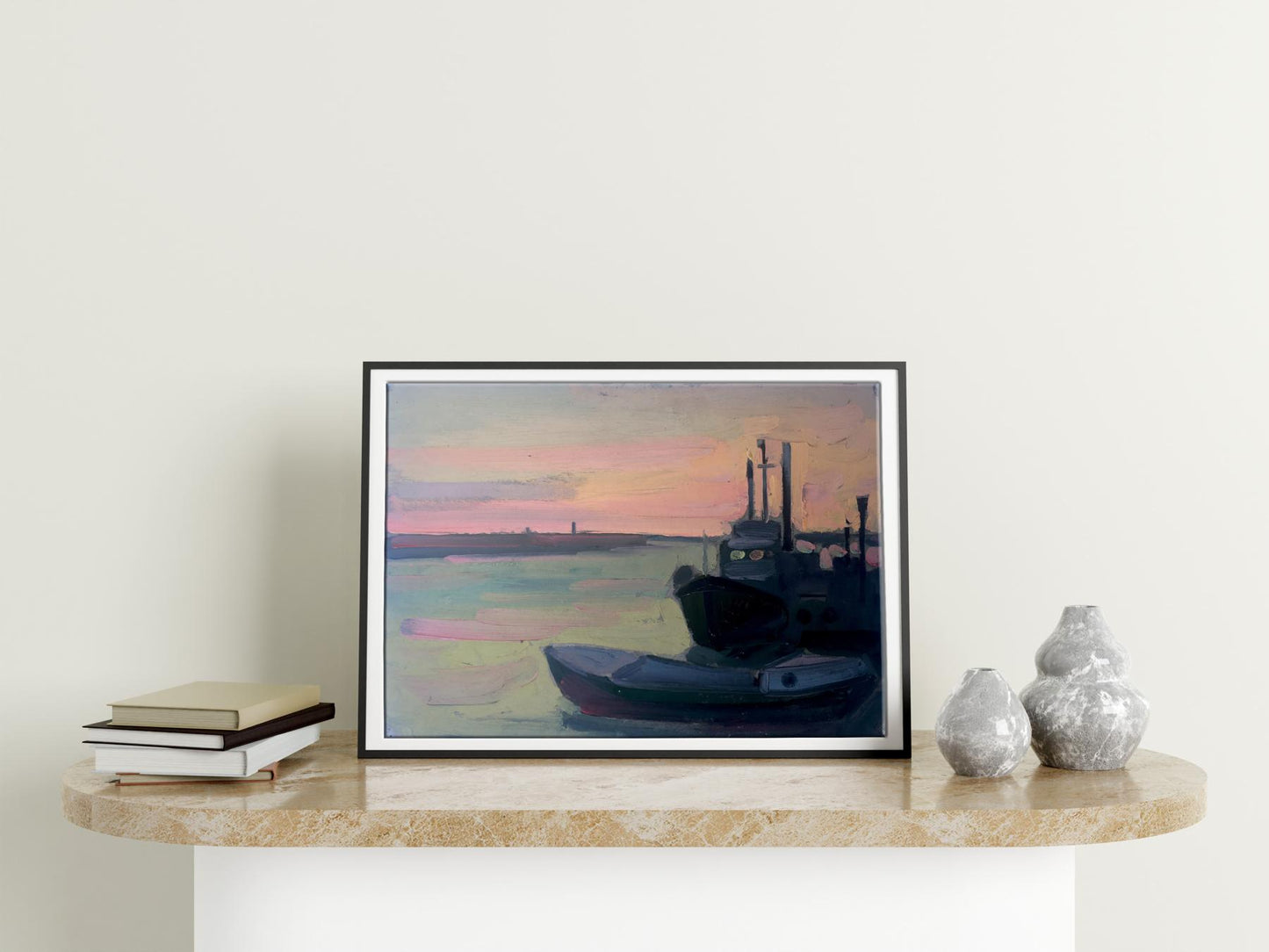 "City Wharf" is more than just a painting; it is a portal to a peaceful riverside at dusk, offering an escape into the beauty of nature. Perfect for any home or office, this painting promises to be a cherished addition to your art collection, providing a constant source of calm and inspiration.