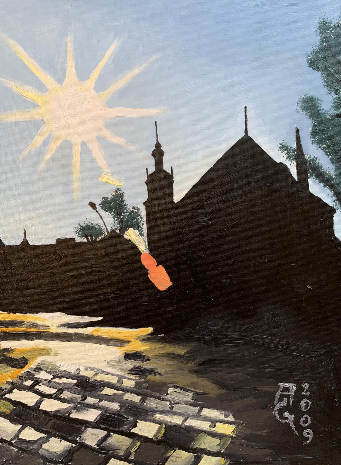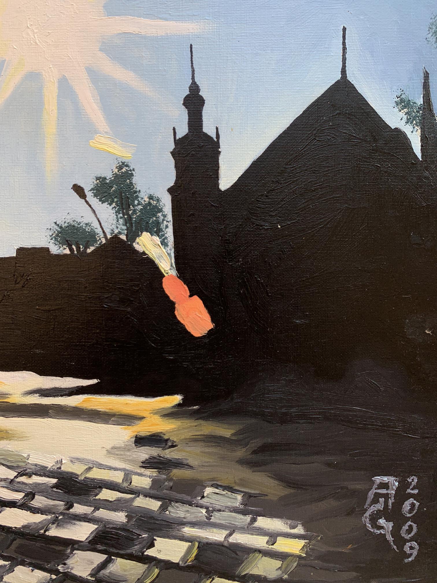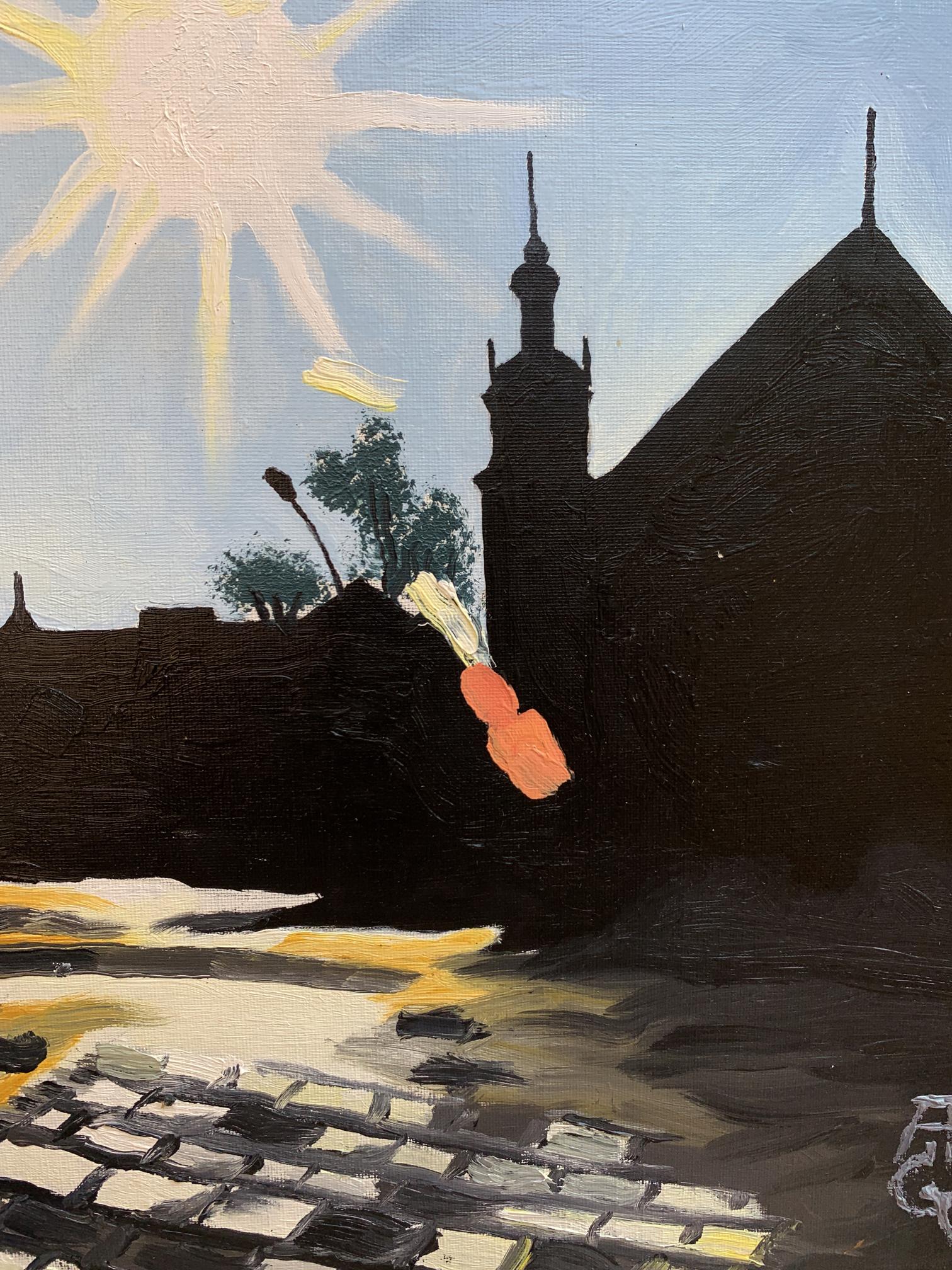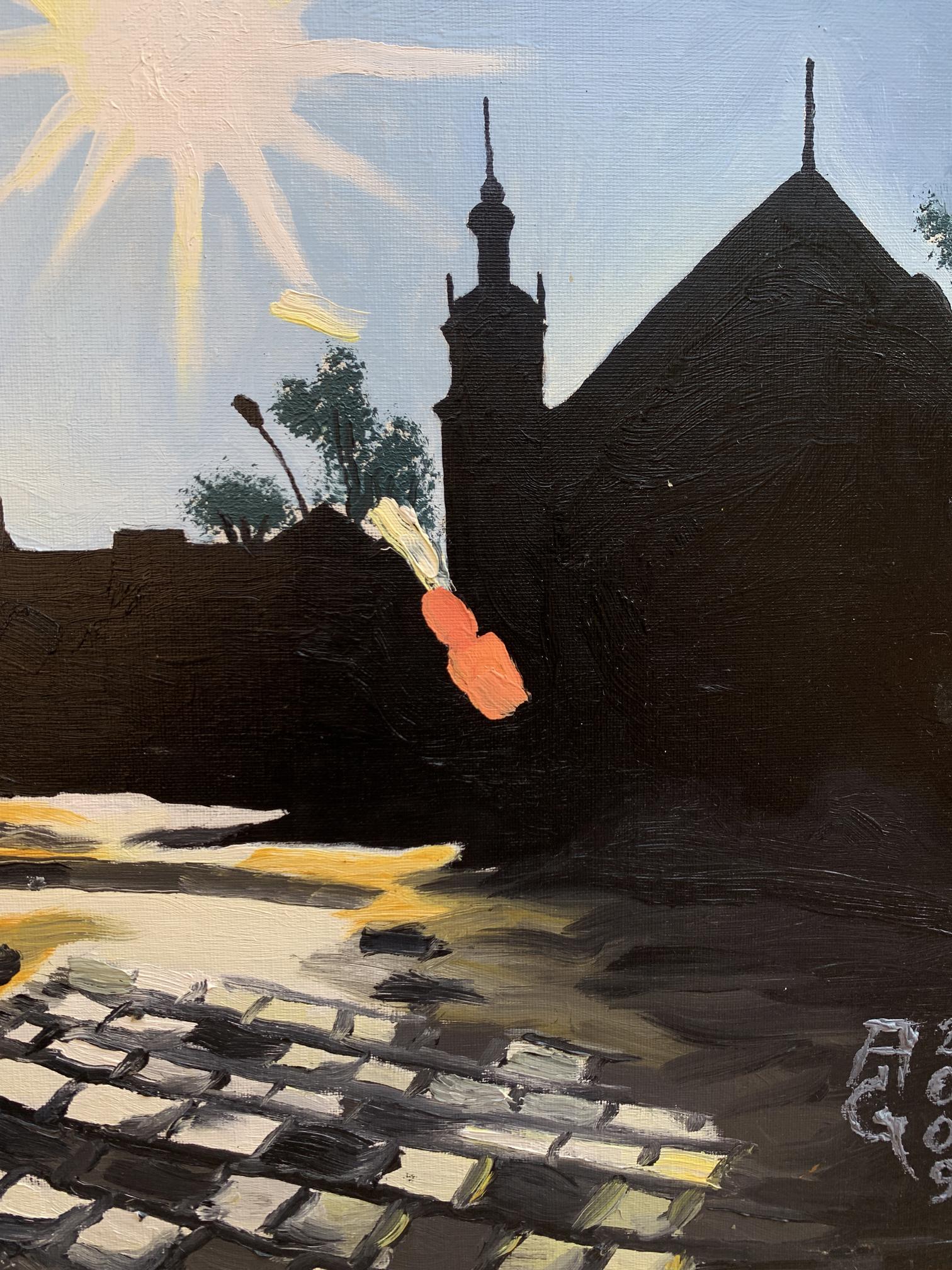 The painting titled "City Streets", created with oil on canvas, captures the interplay of light and shadow in an urban setting. The artist uses a dynamic composition to explore the relationship between architectural forms and the natural environment, creating an evocative atmosphere that highlights the passage of time.At the heart of the composition stands a silhouette of a building, its sharp spires and angular roofline clearly outlined against a vibrant, glowing sky. The darkened structure, painted in deep blacks and browns, contrasts starkly with the brilliance of the sun, which radiates in exaggerated, luminous rays. This contrast not only emphasizes the sun's dominance in the scene but also suggests a fleeting moment where the light overtakes the shadows.The foreground features cobblestone streets, depicted with textured brushstrokes that add depth and tactile realism to the scene. The cobblestones reflect the golden light of the sun, creating a shimmering pathway that leads the viewer’s gaze into the distance. The reflection appears almost fluid, blurring the boundaries between solid ground and ephemeral light.Scattered across the composition are subtle hints of color—warm yellows and oranges in the sunlight, a soft blue in the sky, and the dark green of nearby trees. These elements bring balance to the stark contrast of the black silhouette, offering a sense of warmth and life to the otherwise somber tones.Through "City Streets," the artist communicates a sense of stillness and introspection. The painting evokes the quiet beauty of a city caught between day and night, where the light holds a fleeting power over the darkness. The exaggerated radiance of the sun suggests themes of hope, renewal, and the enduring presence of nature amidst man-made structures. The work invites the viewer to reflect on the passage of time and the subtle interplay of light and shadow in their own lives, encouraging them to find beauty in fleeting moments of contrast and harmony.