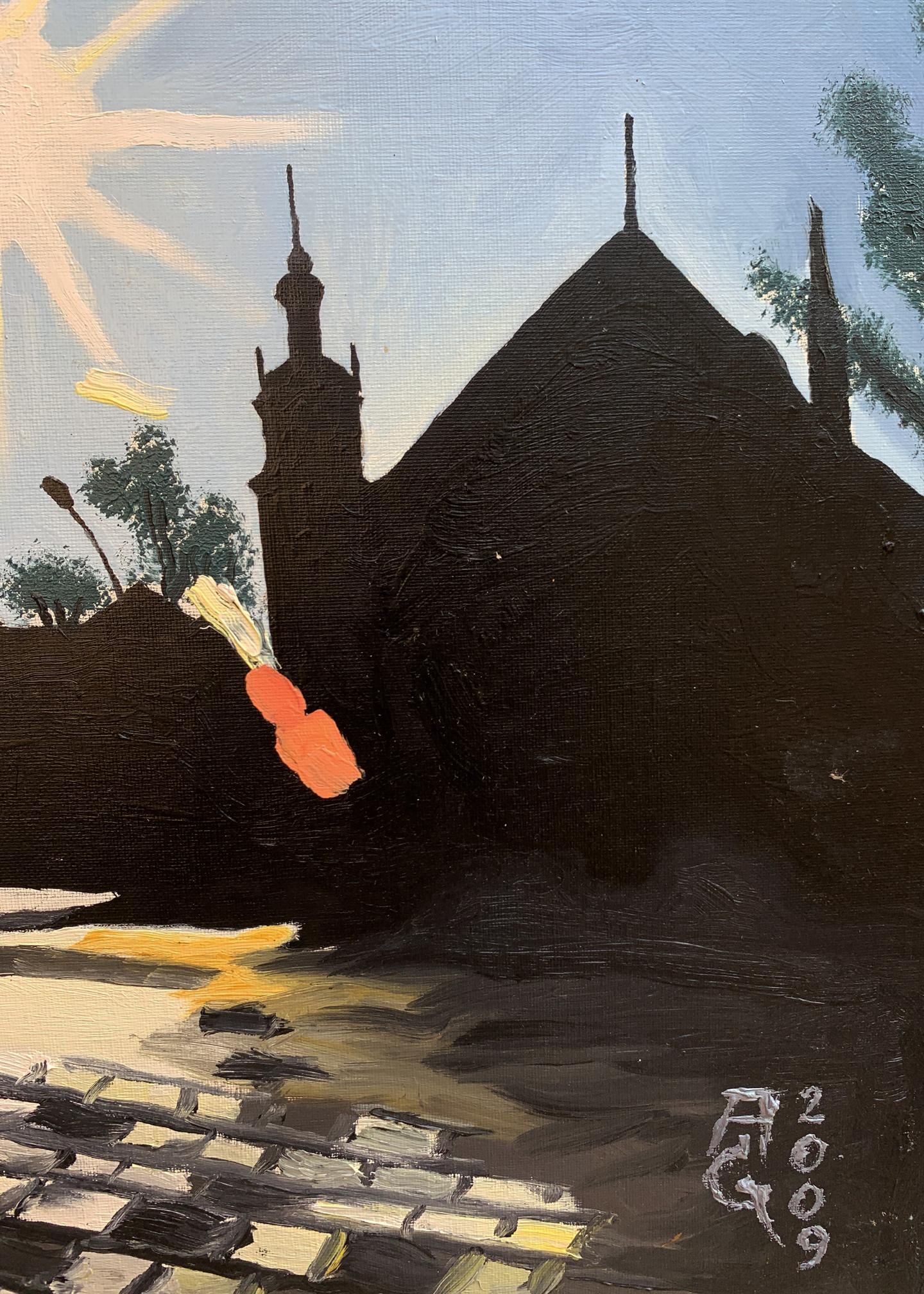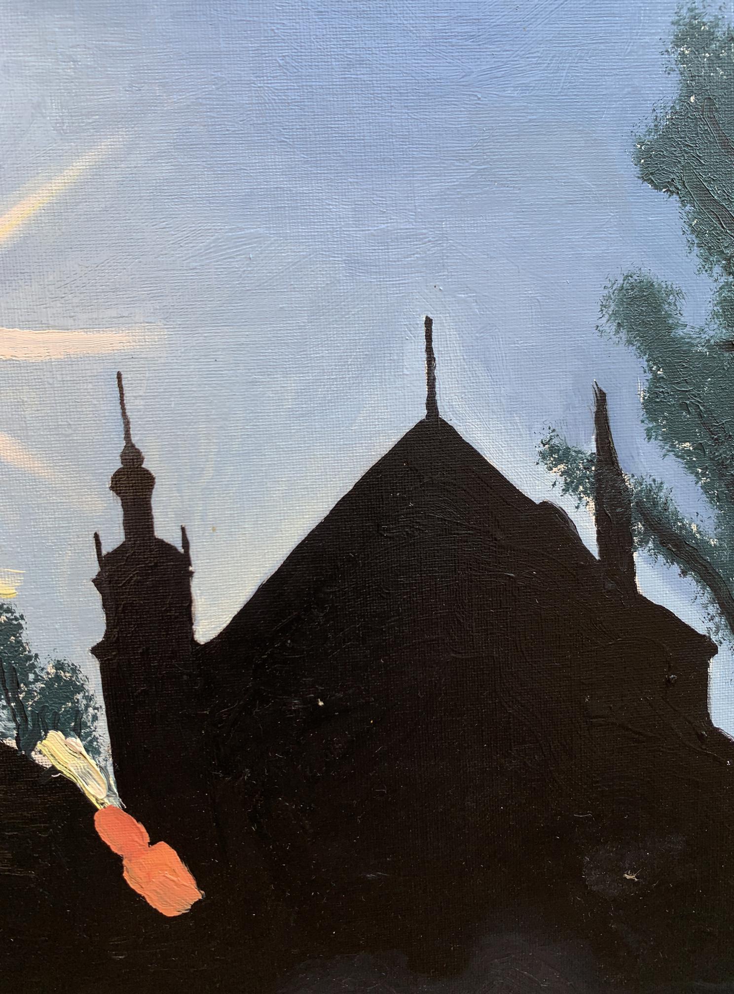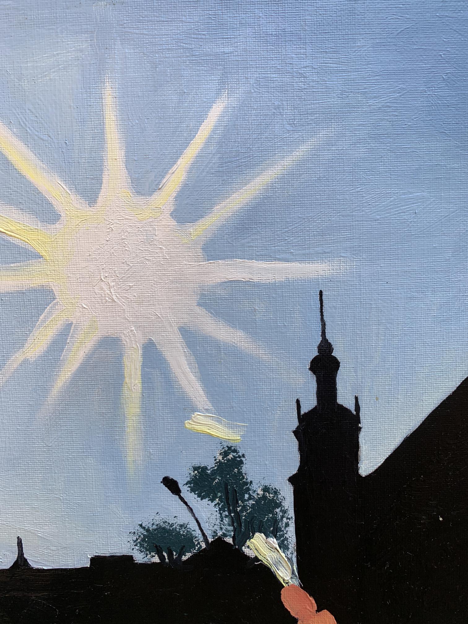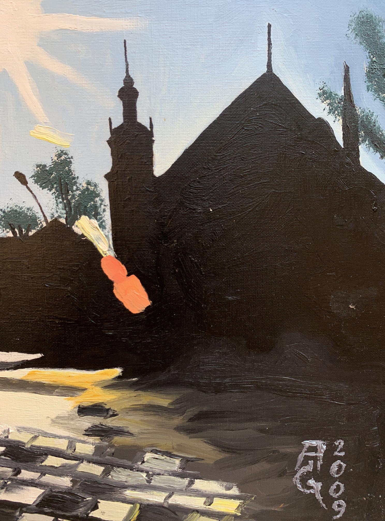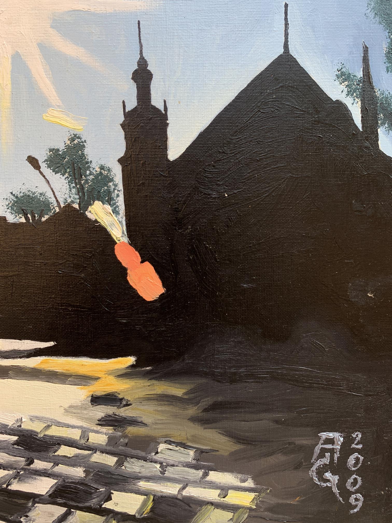 The painting titled "City Streets", created with oil on canvas, captures the interplay of light and shadow in an urban setting. The artist uses a dynamic composition to explore the relationship between architectural forms and the natural environment, creating an evocative atmosphere that highlights the passage of time.At the heart of the composition stands a silhouette of a building, its sharp spires and angular roofline clearly outlined against a vibrant, glowing sky. The darkened structure, painted in deep blacks and browns, contrasts starkly with the brilliance of the sun, which radiates in exaggerated, luminous rays. This contrast not only emphasizes the sun's dominance in the scene but also suggests a fleeting moment where the light overtakes the shadows.The foreground features cobblestone streets, depicted with textured brushstrokes that add depth and tactile realism to the scene. The cobblestones reflect the golden light of the sun, creating a shimmering pathway that leads the viewer’s gaze into the distance. The reflection appears almost fluid, blurring the boundaries between solid ground and ephemeral light.Scattered across the composition are subtle hints of color—warm yellows and oranges in the sunlight, a soft blue in the sky, and the dark green of nearby trees. These elements bring balance to the stark contrast of the black silhouette, offering a sense of warmth and life to the otherwise somber tones.Through "City Streets," the artist communicates a sense of stillness and introspection. The painting evokes the quiet beauty of a city caught between day and night, where the light holds a fleeting power over the darkness. The exaggerated radiance of the sun suggests themes of hope, renewal, and the enduring presence of nature amidst man-made structures. The work invites the viewer to reflect on the passage of time and the subtle interplay of light and shadow in their own lives, encouraging them to find beauty in fleeting moments of contrast and harmony.