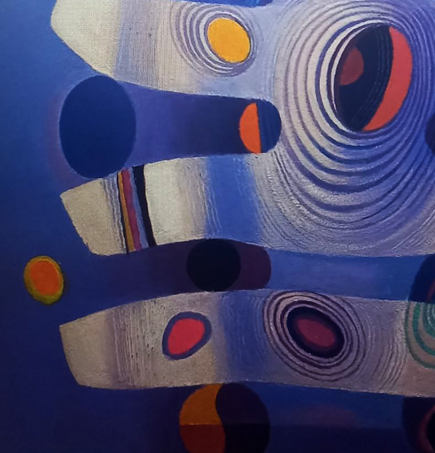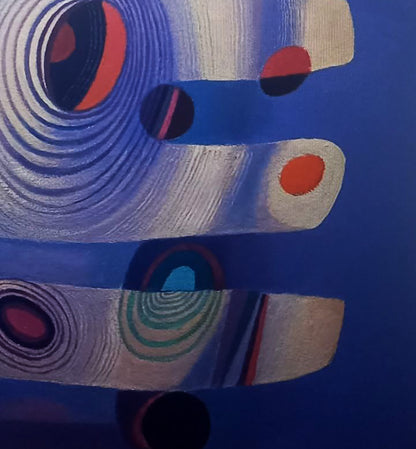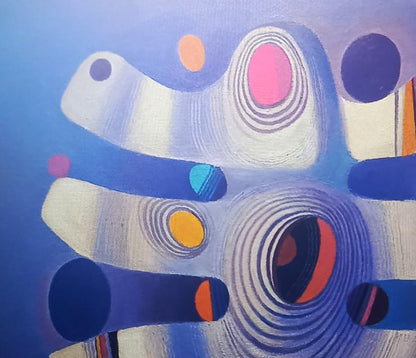 In "Colored Stones" by Alexander Strashevich, the artist presents a vivid and harmonious interplay of colors and shapes against a serene blue backdrop. The painting features abstract forms resembling smooth stones, arranged in rhythmic layers, each adorned with vibrant hues and concentric patterns. The use of circular and elliptical motifs creates a sense of depth and dynamic movement, evoking the natural flow of water around stones in a stream.