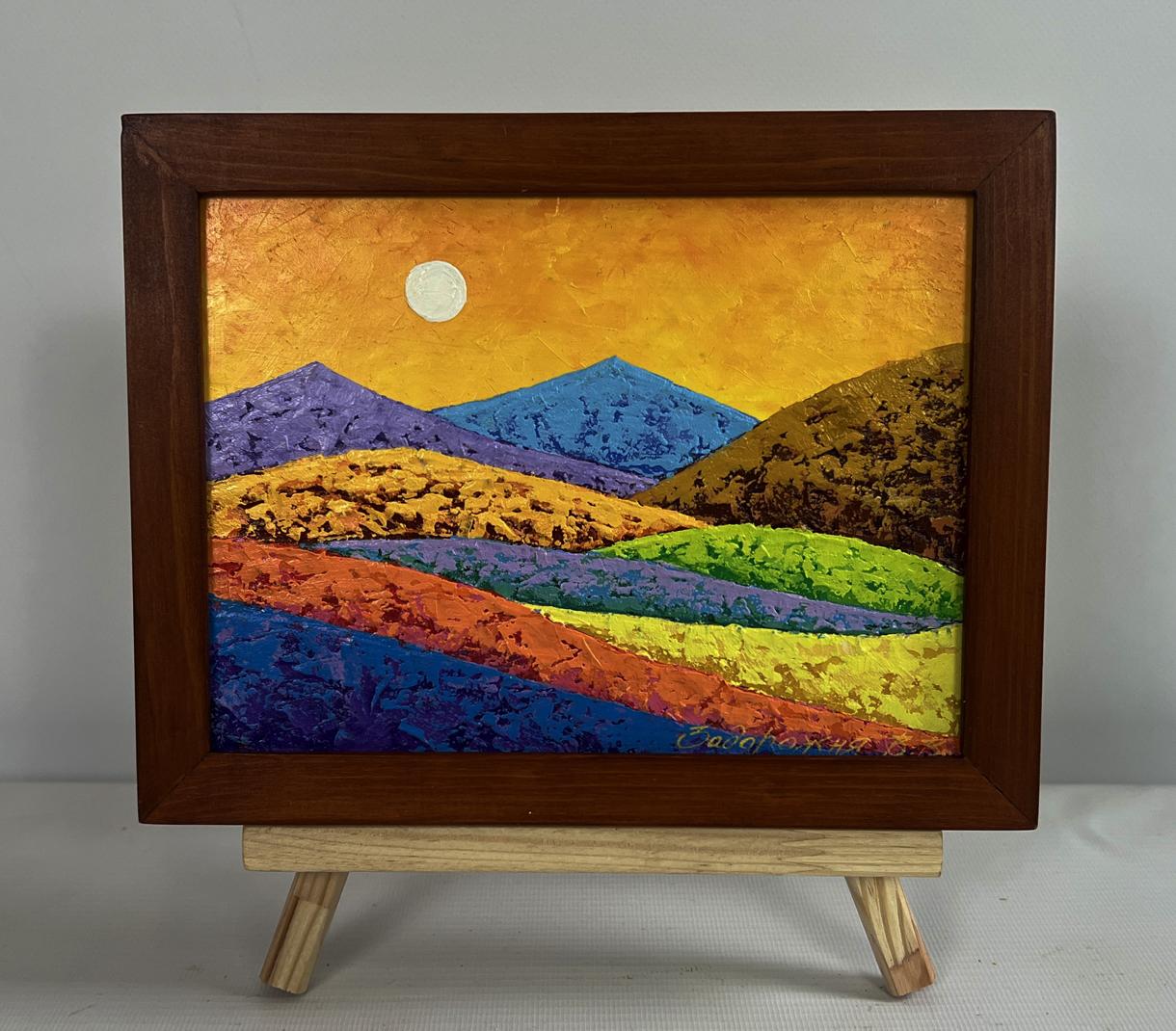 The oil painting on cardboard titled "Contrast Between the Beautiful" is a visually striking composition that masterfully plays with color, texture, and light to create a landscape that feels both dreamlike and deeply expressive. The painting showcases a vibrant interplay of warm and cool tones, creating a mesmerizing contrast that enhances the sense of depth and emotion within the scene. Through bold brushstrokes and thick applications of oil paint, the artist brings this landscape to life, capturing not only its physical beauty but also the dynamic energy that exists within nature. At the heart of the composition lies a series of rolling hills and mountains, each rendered in distinct hues that set them apart while maintaining a harmonious balance. The foreground bursts with an array of rich, saturated colors, from deep blues and purples to fiery oranges and vivid greens. The impasto technique gives the surface a sense of movement, as though the land itself is pulsating with life. The hills seem to fold and unfold upon each other, guiding the viewer’s gaze toward the horizon, where distant peaks rise against the golden sky. The background presents a radiant, golden expanse, possibly depicting the sky at sunset or under the glow of a full moon. The sun or moon, depicted as a perfectly round, textured orb, floats gently in the sky, casting a soft illumination over the landscape below. The warm, golden hues contrast dramatically with the deep blues and purples of the mountains, reinforcing the theme of contrast that runs throughout the painting. This juxtaposition of warm and cool tones enhances the sense of dimensionality, making the viewer feel as if they are standing before a vast, almost surreal terrain. One of the most captivating aspects of this painting is the way the artist uses texture to define form and depth. The thick, expressive brushstrokes in the fields and mountains create a tactile quality that makes the painting feel almost sculptural. The rough, impasto layers in the golden fields suggest the presence of wildflowers or dry, sun-kissed grass, while the jagged textures of the blue and purple mountains evoke the ruggedness of rocky cliffs. The deliberate contrast in texture between different elements of the painting mirrors the contrast in colors, reinforcing the theme of duality—between warmth and coolness, softness and roughness, serenity and intensity.