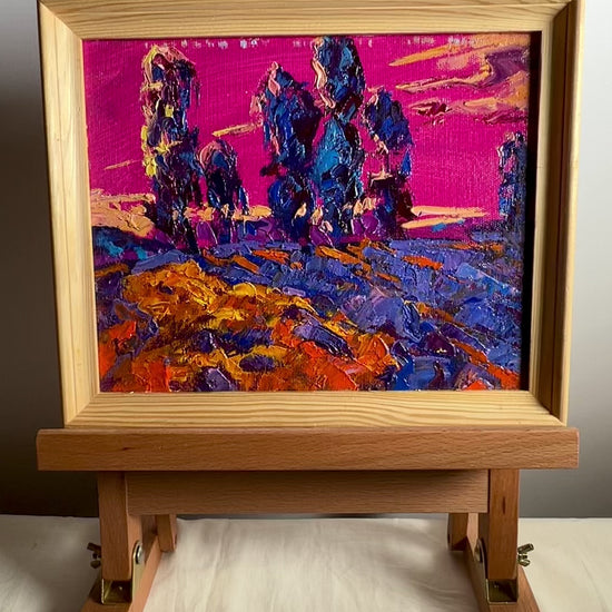 At the heart of the painting, a vivid magenta sky sets a dynamic backdrop, streaked with pink, yellow, and white, suggesting a sky alive with the fleeting light of dusk. This striking use of color not only sets a dramatic tone but also invigorates the canvas with a sense of otherworldly beauty.