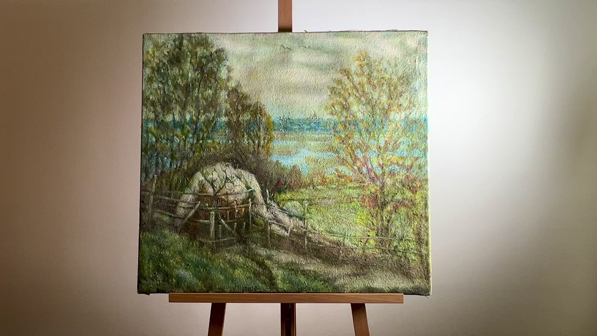 The oil painting "Distance" explores themes of solitude and reflection. Through the winding path leading to the simple yet symbolic haystack, and the tranquil flow of the river set against a somber sky, the artist invites viewers to a journey of inner discovery and calm reflection. This painting not only captures the beauty of the landscape but also conveys a deeper sense of quiet introspection.