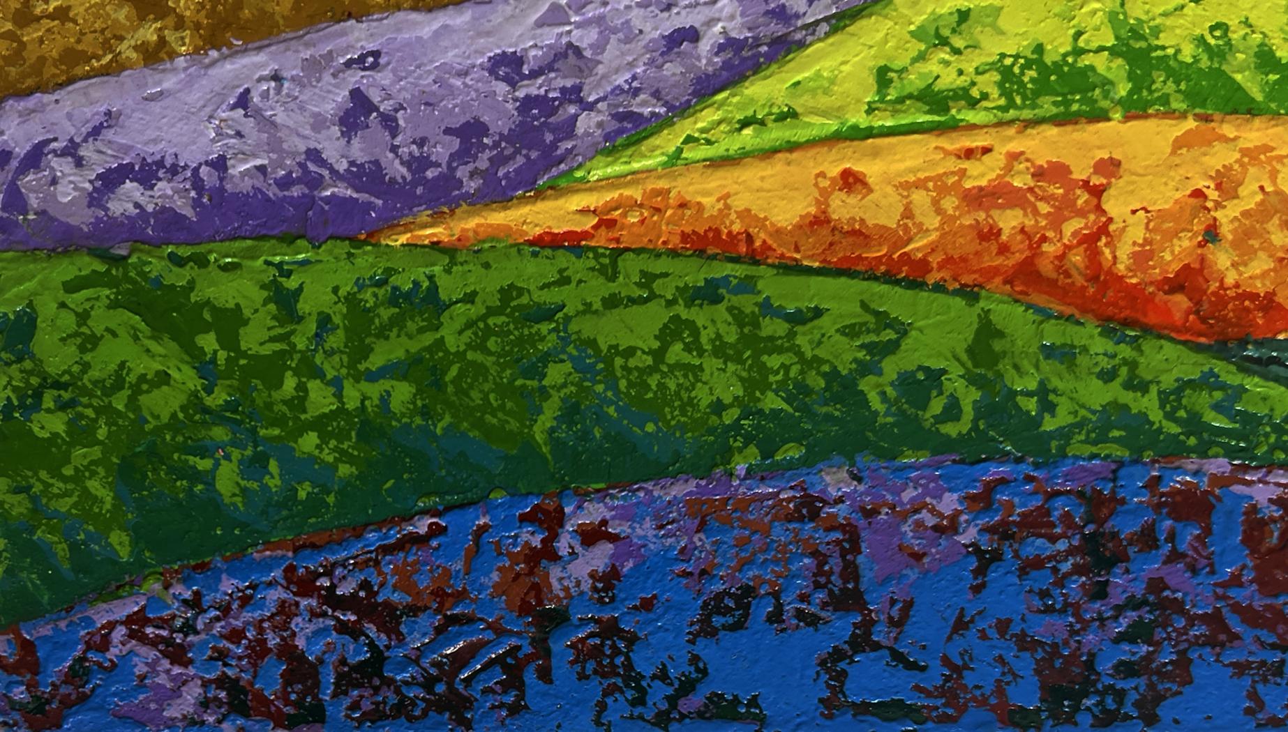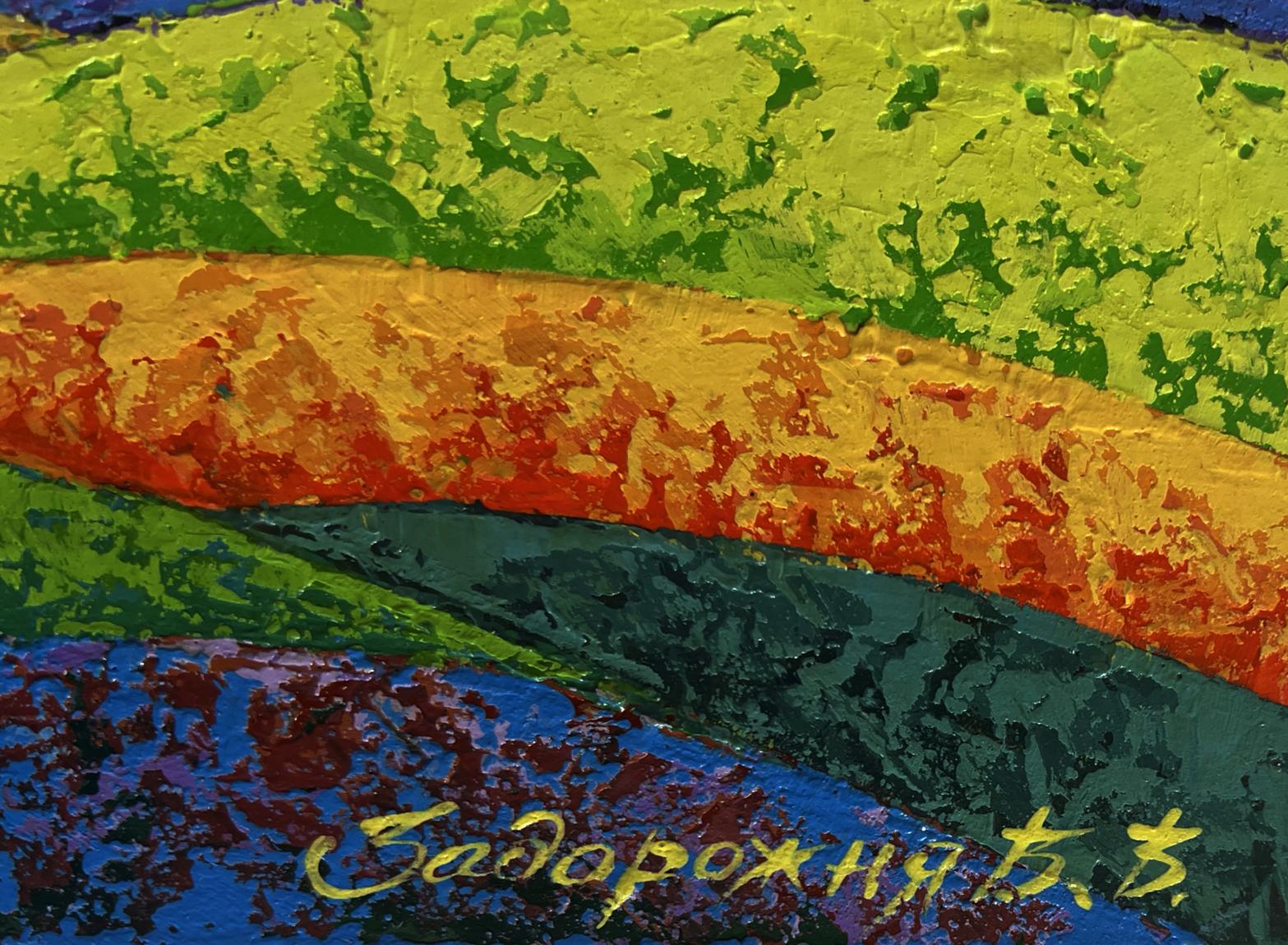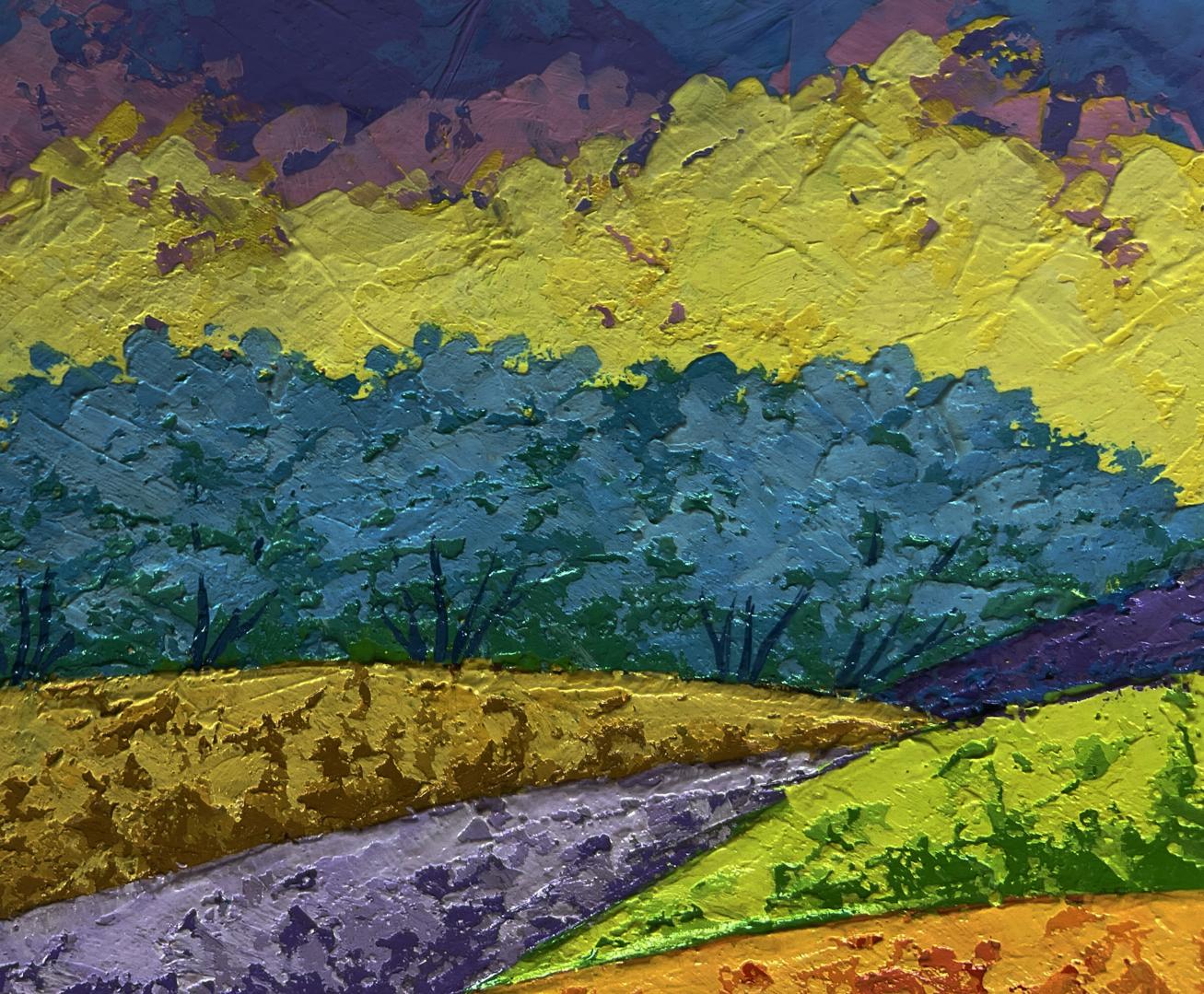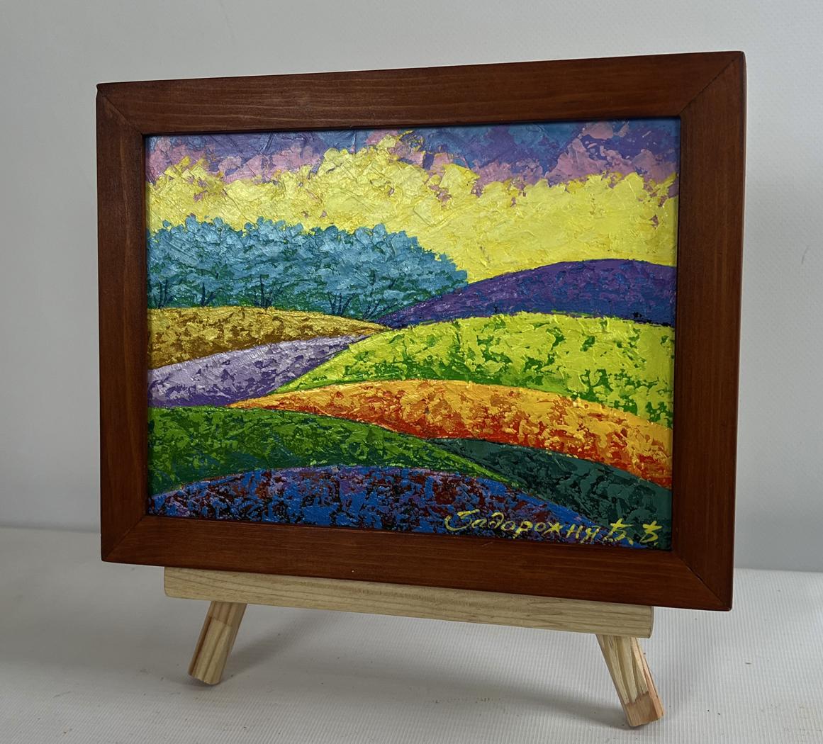 The oil painting on cardboard titled "Fiery Sky Over Green Forest" is a vibrant celebration of color, movement, and emotion. The artist skillfully uses a rich palette to capture the essence of a mesmerizing sunset as it casts its golden light over rolling hills and a lush green forest. With bold and expressive brushstrokes, the scene comes to life, evoking a sense of tranquility and wonder. At the heart of the composition is the dramatic sky, painted in luminous shades of yellow, gold, and fiery orange. The swirling clouds, infused with hints of pink and purple, create a striking contrast against the rich blue upper sky. The impasto technique, with thick layers of oil paint applied to the surface, adds depth and texture, making the sky appear as if it is ablaze with the last rays of sunlight. Beneath this radiant sky, a dense forest of deep blue-green trees stretches across the middle ground. The foliage, depicted with a combination of soft and energetic brushstrokes, conveys the organic movement of leaves swaying in the evening breeze. The trees stand as a peaceful barrier between the rolling fields and the distant hills, adding a sense of stability and balance to the composition. The foreground is dominated by undulating fields painted in a harmonious blend of warm and cool tones. Vivid greens, golden yellows, fiery oranges, and deep purples form a stunning patchwork of cultivated land, each section flowing seamlessly into the next. The interplay of colors suggests a fertile landscape bathed in the warm light of sunset, highlighting the richness of nature’s palette. The thick application of paint adds a tactile quality, making the hills feel almost tangible. The use of contrast in this painting is particularly striking. The bright, almost neon-like yellows and oranges of the sky and fields stand in sharp relief against the deeper, cooler hues of the trees and distant hills. This dynamic interplay of light and shadow creates a dramatic yet harmonious balance, drawing the viewer’s eye across the canvas and into the depths of the landscape. The perspective and composition invite the viewer to experience the vastness of the scene, leading the eye along the rolling fields toward the glowing horizon. There is a sense of movement, as if the earth itself is alive, responding to the changing light and shifting atmosphere of dusk.