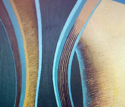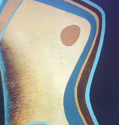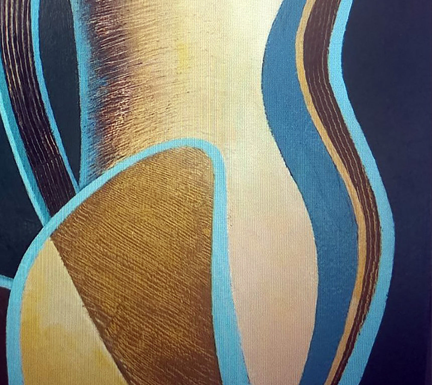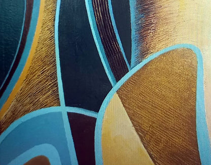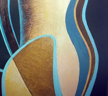 In "Figure," Alexander Strashevich explores the human form through abstract shapes and flowing lines. The soft curves and layered patterns suggest a body in profile, yet the figure remains undefined, blending seamlessly with surrounding shapes. This ambiguity captures the fluidity and complexity of identity, as the human form appears both distinct and interconnected with its environment. The cool blue tones juxtaposed with warm earthy hues create a balanced contrast, symbolizing harmony between self and surroundings. Strashevich’s abstract representation invites viewers to contemplate the essence of form beyond physical boundaries, celebrating the beauty of the human figure as a part of a greater whole.