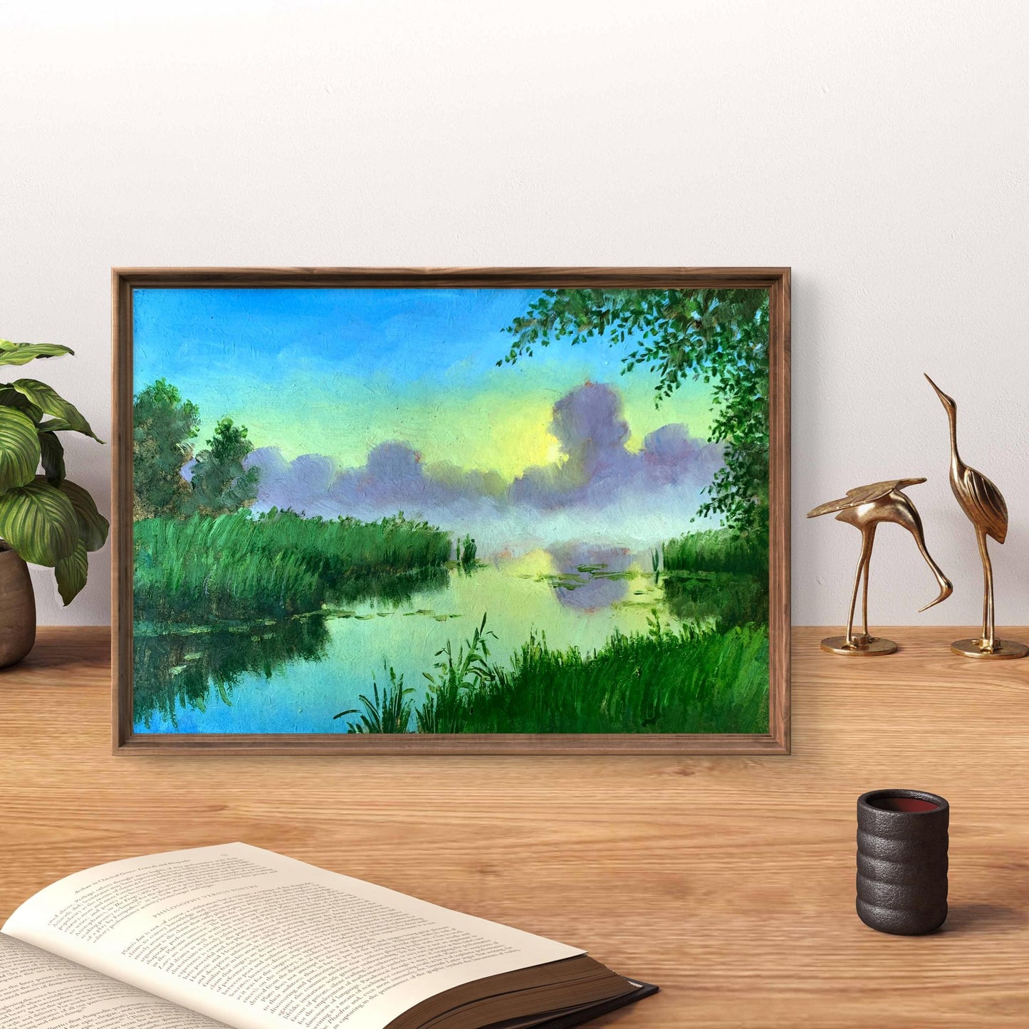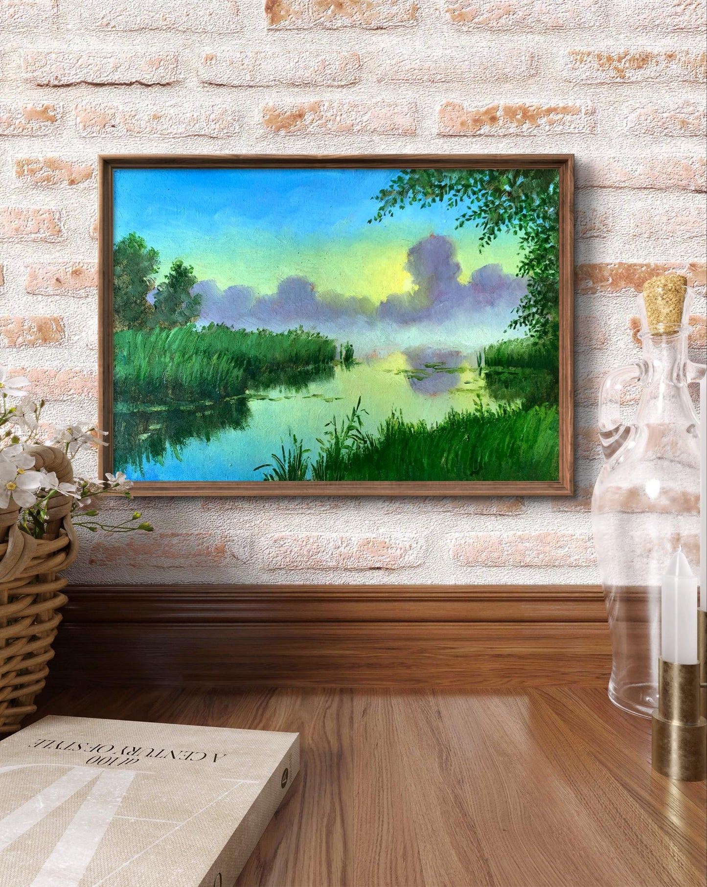 The painting titled "Fog Over the River" is a serene and evocative depiction of a tranquil river shrouded in morning mist. The scene captures a moment of quiet beauty, where nature seems to pause in stillness. The soft fog rising over the river creates a dreamlike atmosphere, blending seamlessly with the delicate pastel tones of the sky, which transitions from the cool blue of dawn to the gentle yellow and green hues of the rising sun.The river itself serves as a central element in the composition, its surface reflecting the lush greenery and soft light above. The calm water mirrors the silhouettes of nearby reeds and trees, emphasizing the harmony between the natural elements. The dense vegetation on either side of the riverbank frames the view, leading the eye toward the vanishing point where the fog thickens and the landscape fades into mystery.The artist has skillfully used soft brushstrokes and a muted palette to convey the ethereal quality of the mist. The wispy, undefined edges of the fog contrast with the sharper, vibrant greens of the foreground plants, creating depth and drawing attention to the interplay of light and shadow. The subtle blending of colors in the sky and the water enhances the peacefulness of the scene, inviting viewers to immerse themselves in its tranquility.Through this painting, the artist seeks to evoke a sense of connection to nature's quiet moments. The fog, often symbolic of mystery and transition, encourages viewers to reflect on the fleeting beauty of such ephemeral scenes. The stillness of the river and the gentle illumination of the rising sun remind us of the delicate balance and continuity of life."Fog Over the River" is a celebration of nature's understated magnificence. It invites contemplation and a sense of inner peace, drawing viewers into the tranquil embrace of the natural world as it awakens in the gentle light of dawn. The painting is a poetic reminder of the beauty found in simplicity and the profound serenity of nature's quiet moments.