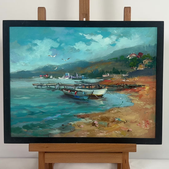 The painting "Hidden Corner by the Sea" captures the essence of a tranquil coastal village, where time moves slowly, and the beauty of nature harmonizes with human presence. The artist's skillful use of oil paints on cardboard brings the scene to life with vibrant hues and dynamic brushstrokes, creating a sense of depth and movement that draws the viewer into this serene maritime setting. The foreground showcases the sandy shoreline, textured with earthy browns, ochres, and hints of pink, suggesting the presence of small stones and seashells scattered along the coast. The sand appears slightly damp, glistening under the sun, reflecting the colors of the sky and water. The gentle waves lap against the shore, their blue and turquoise hues merging seamlessly with the sand, creating a mesmerizing interplay of light and shadow. Two wooden boats, tethered to the shore, rest on the calm water. The boats, painted in muted shades of white and deep blue, bear signs of wear and age, suggesting years of faithful service to the local fishermen. A few pieces of cloth, possibly drying after a day's labor, hang over the edge of one boat, adding a human touch to the composition. The reflections of the boats ripple across the water's surface, subtly distorted by the gentle movement of the sea. A weathered wooden pier extends into the water, its planks and beams darkened by time and exposure to the elements. The pier appears rustic, a simple construction that serves as a docking point for local fishermen. Its partially submerged beams cast soft, elongated reflections onto the water, emphasizing the transparency and depth of the sea. The wooden structure, though aged, remains sturdy, a testament to the resilience of coastal communities. The sea itself is a masterpiece of color and texture, depicted in shades of deep blue, turquoise, and emerald green. The artist captures the ever-changing nature of water, with patches of light and shadow dancing on its surface. In the distance, a small red boat sails toward the horizon, adding a focal point that suggests life beyond the immediate shore. Further out, the water meets a distant coastline where a village, painted in soft pastel tones, nestles at the foot of rolling hills.