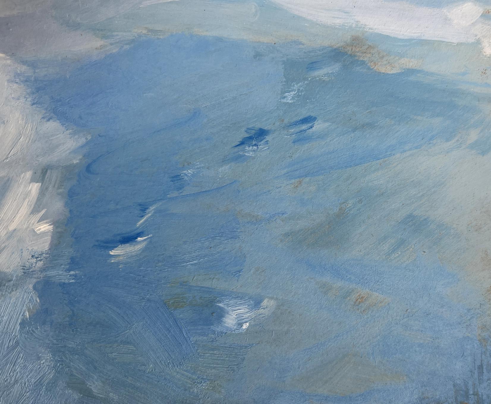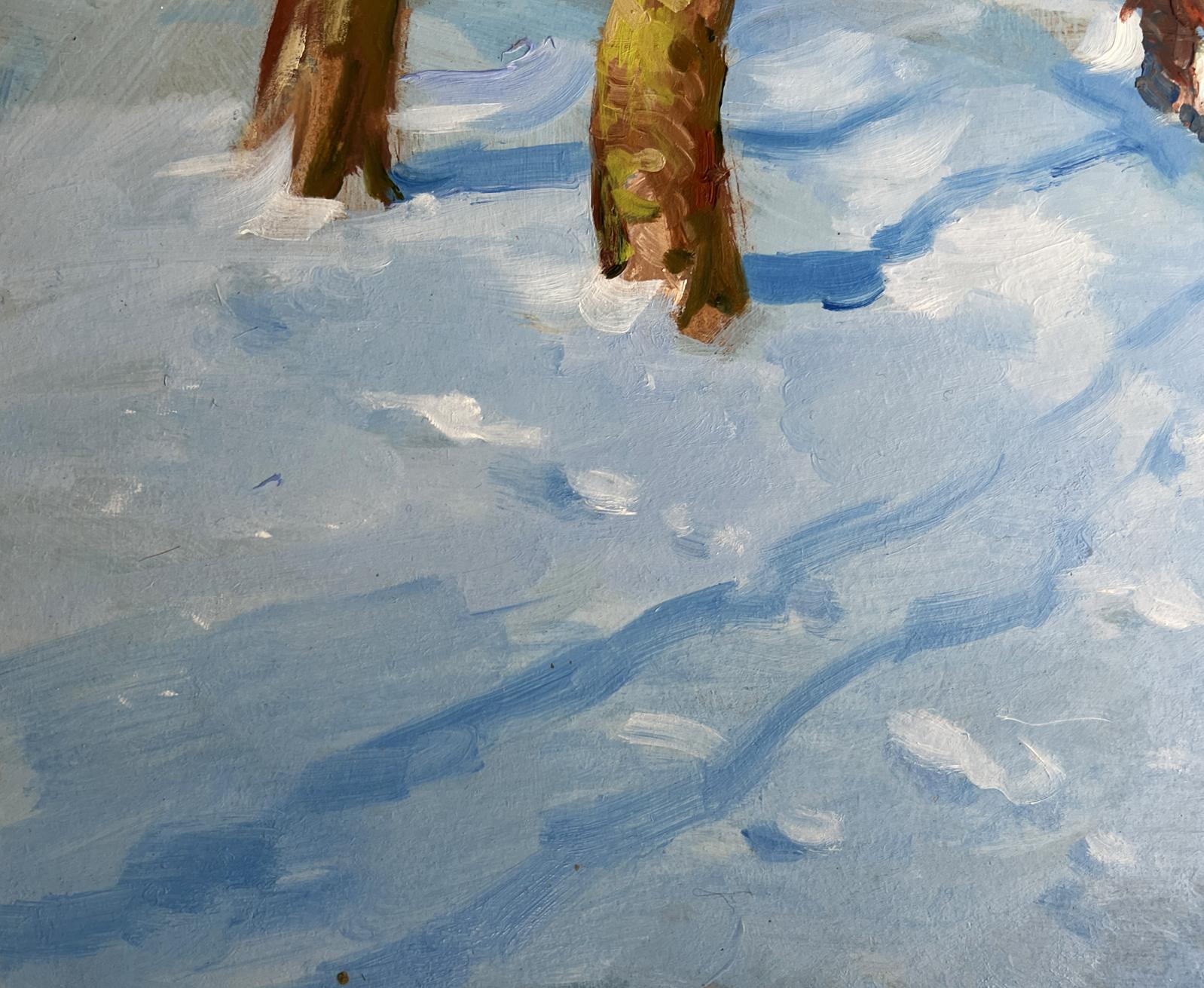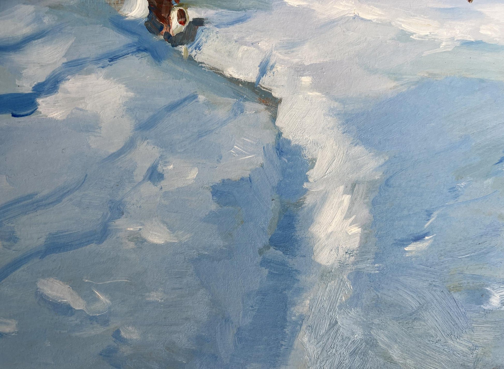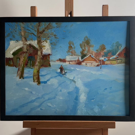 This oil painting titled "Quiet Village in Winter" - landscape captures the peacefulness of a rural village blanketed in fresh snow. The scene is bathed in crisp sunlight, casting soft blue shadows across the ground, while the clear, bright sky enhances the feeling of a serene, cold winter day. In the foreground, large snowdrifts dominate the composition, their surface textured with undulating patterns created by the wind. The artist skillfully uses a mix of cool blues and whites to depict the smooth yet slightly uneven terrain of the untouched snow. A well-trodden path cuts through the landscape, leading the viewer's eye deeper into the village. To the left, a rustic wooden house with a thick snow-covered roof stands beneath two large, sturdy trees. The trunks and branches of the trees are painted in warm earthy tones, contrasting with the cold hues of the snow. Their rough, textured bark and sparse, remaining leaves add a sense of life and movement to the otherwise still setting. In the middle of the composition, a figure in warm winter clothing is pulling a small sled with a child seated on it. This small yet lively detail brings a human element to the otherwise quiet and tranquil setting, emphasizing the charm and simplicity of village life. Further in the background, several wooden cottages with snow-laden roofs are nestled among a grove of trees. Their warm golden and brown tones create a cozy contrast against the icy blues and whites of the snow. The trees surrounding the houses are a mix of evergreens and leafless deciduous trees, their branches painted with expressive brushstrokes that capture the crispness of winter air. The sky is a radiant blue, with hints of white and soft strokes suggesting wisps of clouds. The lighting in the painting is bright and natural, emphasizing the clarity and freshness of a winter day. The artist’s brushwork is loose yet deliberate, with bold, expressive strokes used to render the trees, snow, and buildings. The color palette is a harmonious balance of warm and cool tones, creating a vibrant yet calming winter atmosphere. Overall, "Quiet Village in Winter" is a masterful depiction of the beauty and stillness of rural life during the colder months. Through its well-composed scenery, dynamic brushwork, and delicate use of light and shadow, the painting immerses the viewer in a picturesque winter landscape full of warmth and tranquility.