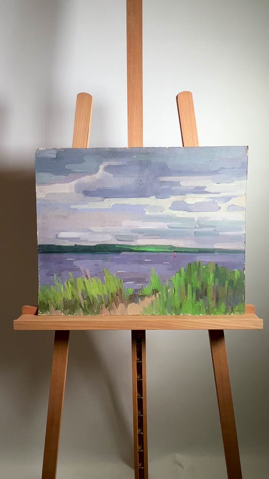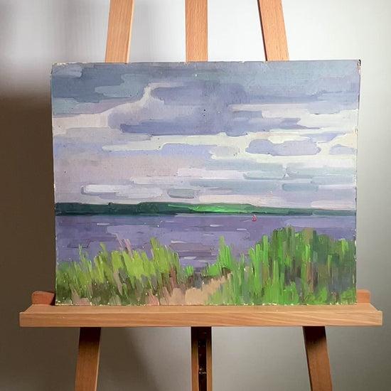 "Reeds on the River" is a captivating oil painting that beautifully captures the tranquil and serene atmosphere of a riverside scene. The artist masterfully uses color and brushwork to bring this peaceful landscape to life. The sky is painted in a range of soft, muted tones of gray, lavender, and light blue. The clouds are rendered with smooth, horizontal brushstrokes, creating a layered effect that gives depth to the sky. The subtle variations in the cloud colors suggest a calm, overcast day. The river is depicted in cool shades of blue and purple, with gentle horizontal strokes that mimic the calm surface of the water. The water reflects the colors of the sky, enhancing the painting's overall harmony. The riverbank is adorned with lush green reeds, painted with vertical brushstrokes that add texture and movement to the scene. The reeds' vibrant green hues contrast beautifully with the softer tones of the water and sky, drawing the viewer's eye to the foreground. The foreground features a dense cluster of green reeds, painted with dynamic, upward brushstrokes that give a sense of growth and vitality. The reeds serve as a natural frame for the river scene, grounding the composition. The middle ground is dominated by the wide expanse of the river, its surface calm and reflective. The subtle ripples in the water are suggested through the horizontal brushwork, adding to the sense of tranquility. The background features a distant shoreline, painted in darker greens and blues, providing a sense of depth and perspective. The far horizon is subtly highlighted, indicating a gradual shift in the landscape. The painting uses soft lighting to create a gentle and serene atmosphere. The lack of harsh shadows suggests a diffused light source, typical of an overcast day. The interplay of light and shadow on the reeds and water adds depth to the composition. The artist employs varied brushstrokes to create texture throughout the painting. The smooth, horizontal strokes in the sky and water contrast with the more textured, vertical strokes in the reeds, enhancing the painting's visual interest. The overall mood of the painting is peaceful and contemplative. The calm water and soft colors evoke a sense of quiet reflection, making the viewer feel as though they are standing by the river, enjoying the serene view. "Reeds on the River" captures a moment of stillness and tranquility. The subdued color palette and gentle brushwork create a soothing and calming effect, inviting the viewer to pause and appreciate the beauty of nature. This painting can be interpreted as a celebration of the quiet beauty found in nature. The serene river, framed by vibrant reeds, serves as a reminder of the peaceful moments that can be found in everyday landscapes. It encourages viewers to take a moment to appreciate the simple yet profound beauty of the natural world. Overall, "Reeds on the River" is a beautifully executed oil painting that uses color, texture, and composition to convey a serene and tranquil riverside scene. The artist's skillful technique and attention to detail create a vivid and immersive depiction of nature's quiet beauty.