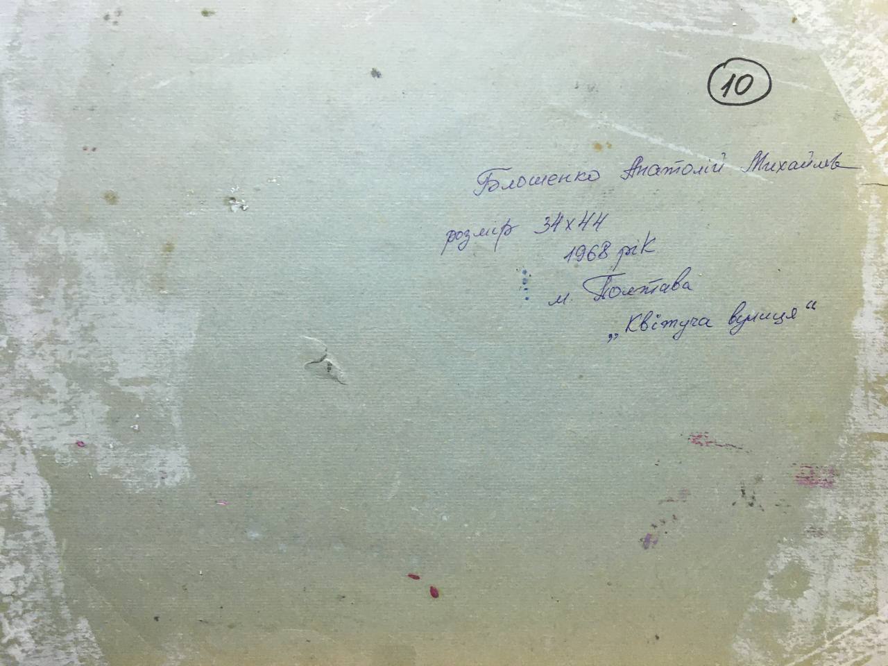 About the artist: Born on November 26, 1938 in the village of Kalinovo (now Popasnyansky district of Luhansk region). Graduated from the Kharkov Institute of Art and Industry (1970). Teachers by profession: A. Constantinople and V. Nenado. Painter. Artist of monumental art. He worked at the Poltava Art and Industrial Combine (1971). Participated in exhibitions: all-Ukrainian (1981, 1990), foreign in Poland (1979), in Bulgaria (1980). Major works - monumental panels: "Wreath" (1986), "Oil", "Minerals", "Energy" (1990-1992); painting: "Towards the next summer" (1988), "Awakening" (1990), "Movement", "In memory of V. Stus" (1992), "After the rain" (1994), "To each his own" (1998-2002). The works are kept in the museum of the Military Academy of the General Staff in Moscow.