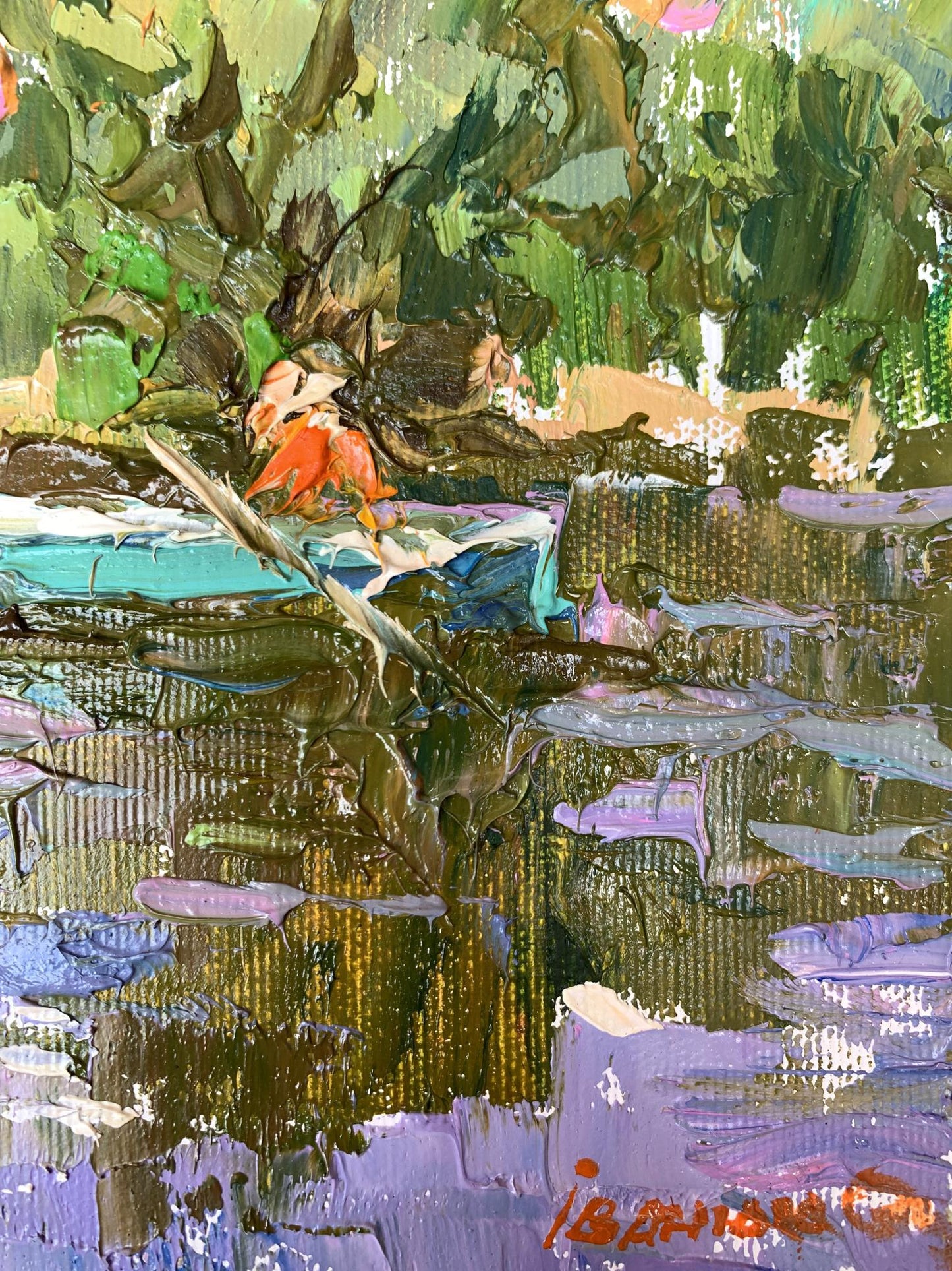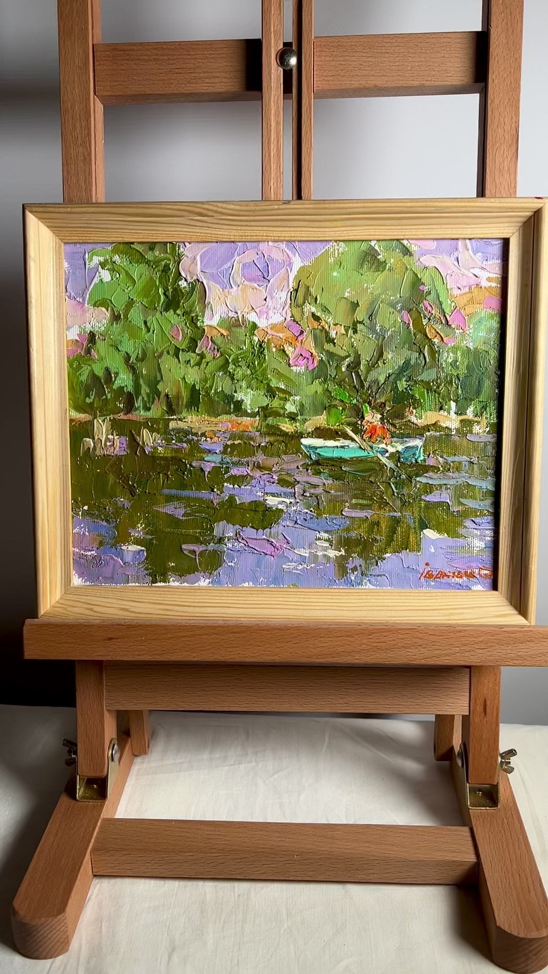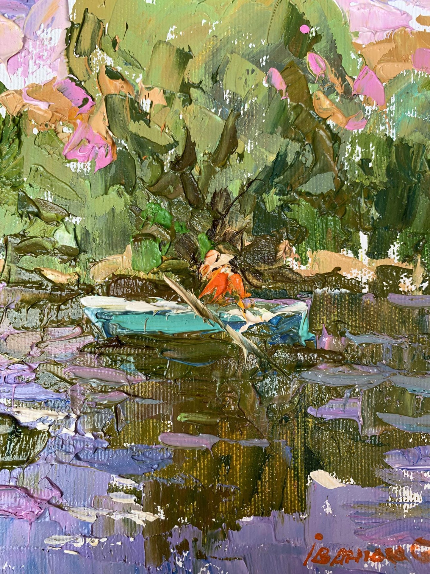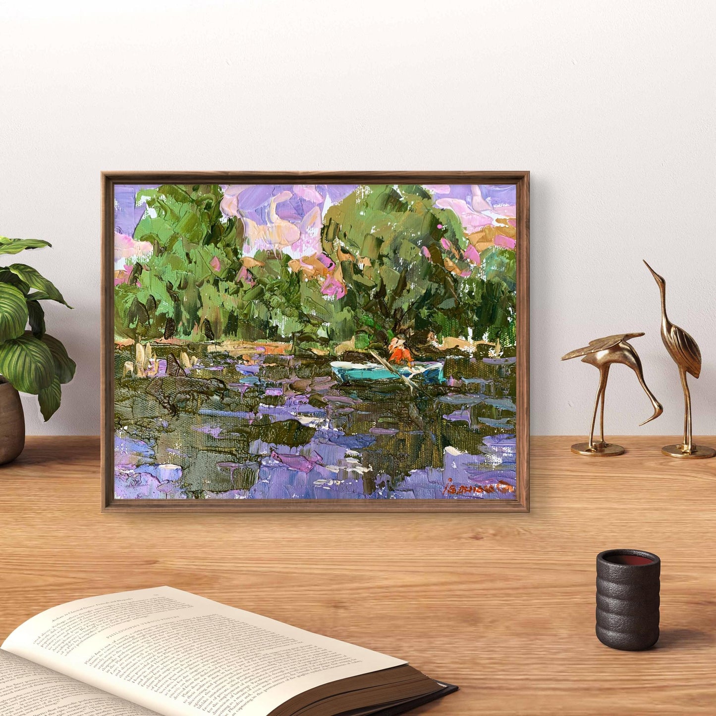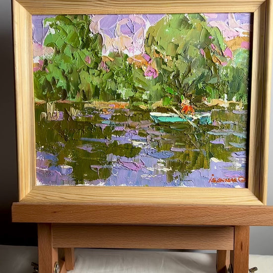 "Summer Fishing" is a vivid and lively oil painting that captures the essence of a serene summer day spent fishing. The artist uses a thick impasto technique, creating a textured surface that adds depth and dimension to the artwork. The painting is rich in color and detail, offering a sense of immersion into a peaceful natural setting. The artist employs a vibrant color palette dominated by various shades of green and purple, which are complemented by touches of pink, blue, and orange. The use of thick, expressive brushstrokes and palette knife work brings an almost three-dimensional quality to the scene. The impasto technique is particularly effective in conveying the texture of the foliage and the reflections on the water. The composition centers on a tranquil scene of a person fishing from a small boat, surrounded by lush vegetation and a calm, reflective body of water. The focal point of the painting is a small boat painted in blue, with a figure dressed in orange seated inside. The fisherman's relaxed posture and the gentle ripples in the water suggest a peaceful, leisurely activity. The background is filled with dense greenery, with trees and bushes painted in a variety of green hues. The thick application of paint for the leaves and branches creates a sense of depth and richness. The water surface is depicted with a mix of purples and greens, capturing the reflections of the surrounding vegetation. The use of contrasting colors and textures for the water adds to the overall vibrancy of the scene. The central element, representing the leisurely activity of fishing, highlights the calm and peaceful nature of the scene. The rich and varied shades of green create a lush and inviting natural setting, emphasizing the beauty of the summer landscape. The reflections in the water add a dynamic element to the painting, enhancing the sense of tranquility and harmony. The mood of "Summer Fishing" is one of relaxation and contentment. The bright colors and lively brushstrokes convey the warmth and vibrancy of a summer day, inviting the viewer to share in the peaceful moment. The painting evokes a sense of nostalgia and appreciation for simple pleasures in nature. "Summer Fishing" can be interpreted as a celebration of nature and the joy of outdoor activities. The artist captures a moment of serene beauty and leisure, where the viewer can almost feel the warm sun and hear the gentle sounds of the water. The rich textures and vibrant colors enhance the sensory experience, making the scene come alive. Overall, "Summer Fishing" is a delightful and engaging work that showcases the artist's skill in using color and texture to create a vivid and immersive landscape. The painting invites the viewer to pause and enjoy the tranquility and beauty of a summer day spent fishing.