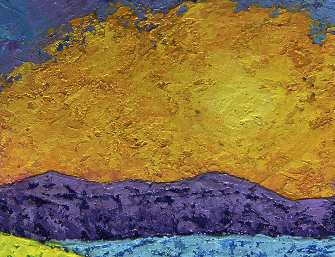 The oil painting on cardboard titled "Summer Flower Fields and Sunset" presents a mesmerizing depiction of nature bathed in the warm glow of a setting sun. The artist uses a rich and expressive color palette to bring out the beauty of summer meadows in full bloom, contrasting with the deep purples and blues of distant mountain ridges. The composition is both dynamic and peaceful, drawing the viewer into a world where light and color dance in perfect harmony. The sky is a magnificent display of warm golden hues, with shades of yellow and orange blending into soft pinks and purples at the horizon. The sun, partially obscured by textured clouds, radiates warmth, casting its glow across the entire landscape. The thick impasto brushstrokes used to create the sky add depth and movement, making it feel alive as if the light is continuously shifting. In the middle ground, the rolling mountain range is painted in deep purples and muted blues, providing a cool contrast to the fiery sky. The artist skillfully adds highlights and shadows to the mountains, making them appear distant yet present, standing as silent guardians over the fields below. Their rugged, textured surfaces are depicted with heavy brushstrokes, emphasizing their permanence and solidity against the softness of the meadows. The lower portion of the painting bursts with an explosion of color, capturing the vibrancy of summer flower fields stretching towards the horizon. Bright yellows, lush greens, deep pinks, and soft purples weave together in a harmonious tapestry of wildflowers and tall grasses. The rich, thick application of oil paint adds texture, making the fields appear almost tangible, as if one could reach out and feel the softness of the blossoms. The interplay of light and shadow across the fields is masterfully executed. The areas touched by the sun's last rays appear almost golden, while the portions further from the light are cast in cooler, darker shades, suggesting the gentle progression of evening. The transition from the sunlit foreground to the shadowed valleys adds depth and perspective, guiding the viewer’s eye across the canvas. The use of bold, confident brushstrokes and a lively color palette gives the painting an impressionistic feel, capturing not just the physical beauty of the scene but also the emotions it evokes.