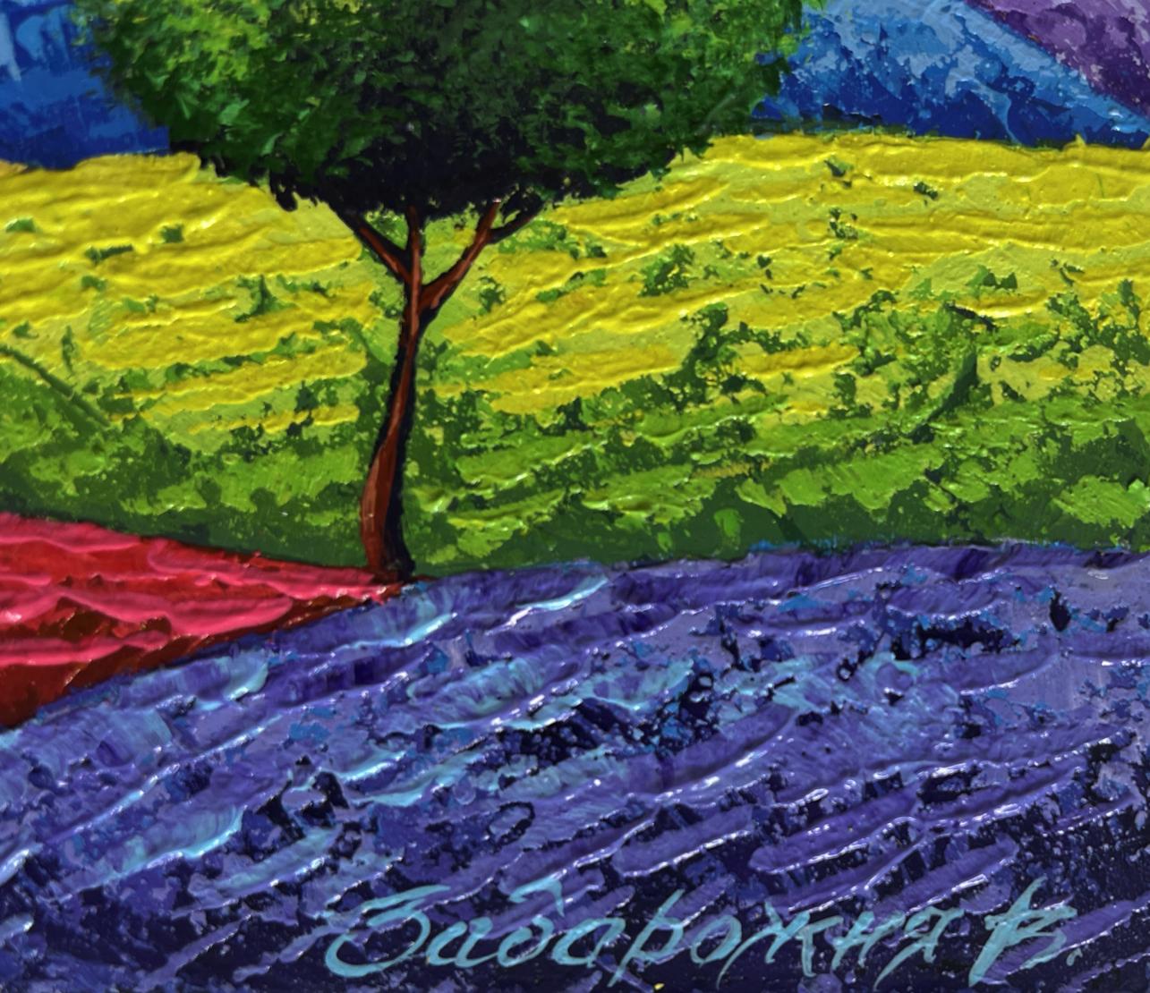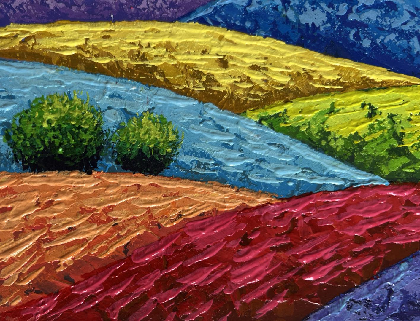 The oil painting on cardboard titled "Summer Sunset Over Flowering Slopes" captures the serene yet vibrant atmosphere of a warm evening as the sun begins to set over rolling hills. The composition is rich in color, texture, and contrast, drawing the viewer into a landscape that radiates warmth and tranquility. The background features a sky ablaze with hues of deep orange, gold, and soft lavender, creating a stunning sunset that seems to engulf the entire scene in its glow. The sun, positioned slightly off-center, shines with a luminous white tone, its edges blending subtly into the surrounding sky. The artist uses expressive brushstrokes to create the effect of sunlight dispersing in soft waves, giving the impression of a sky in constant motion. Beneath this radiant sky, a series of mountains and hills unfold, each rendered in striking shades of deep blue, soft purple, and golden yellow. The layering of colors and the interplay of light and shadow give the terrain a remarkable sense of depth and dimension. The cool tones of the mountains contrast harmoniously with the warmth of the sky, adding to the painting’s balance and visual appeal. The textured brushstrokes used for the mountains enhance the ruggedness of their form, making them feel both distant and tangible. The middle ground showcases undulating slopes adorned with fields of bright green, golden yellow, and earthy red. These rolling landscapes are divided by natural curves, leading the viewer’s eye deeper into the painting, as if inviting them to follow the gentle contours of the land. The variation in color intensity suggests the presence of wildflowers, creating a mosaic of nature’s beauty across the terrain. One of the most striking elements of the painting is the lush, round tree in the foreground. Its full, deep green foliage stands out against the backdrop of warm yellows and reds, serving as a focal point that anchors the composition. The thick, textured brushstrokes used to depict the tree’s leaves give it a three-dimensional quality, making it feel as though it could be touched. Its sturdy trunk and vibrant foliage symbolize life and growth amidst the peaceful landscape. Closer to the foreground, the slopes are painted with bold, rich strokes of crimson red, soft lavender, and fiery orange, suggesting fields brimming with flowers. The heavy application of paint creates a tactile effect, enhancing the sense of movement and natural abundance.
