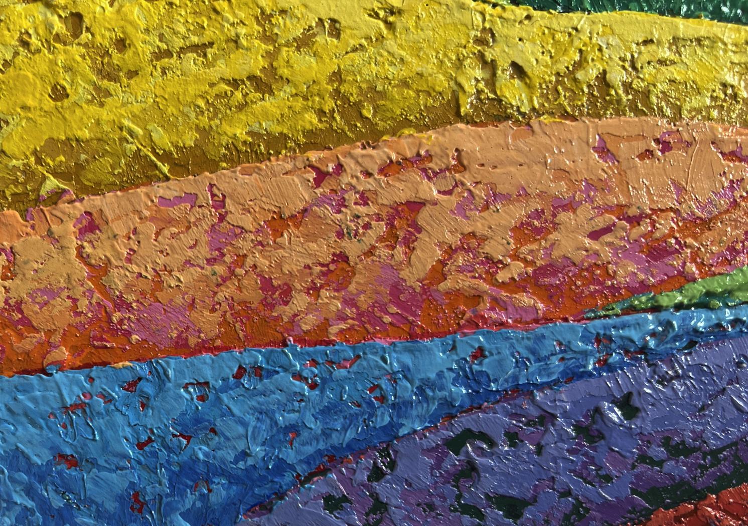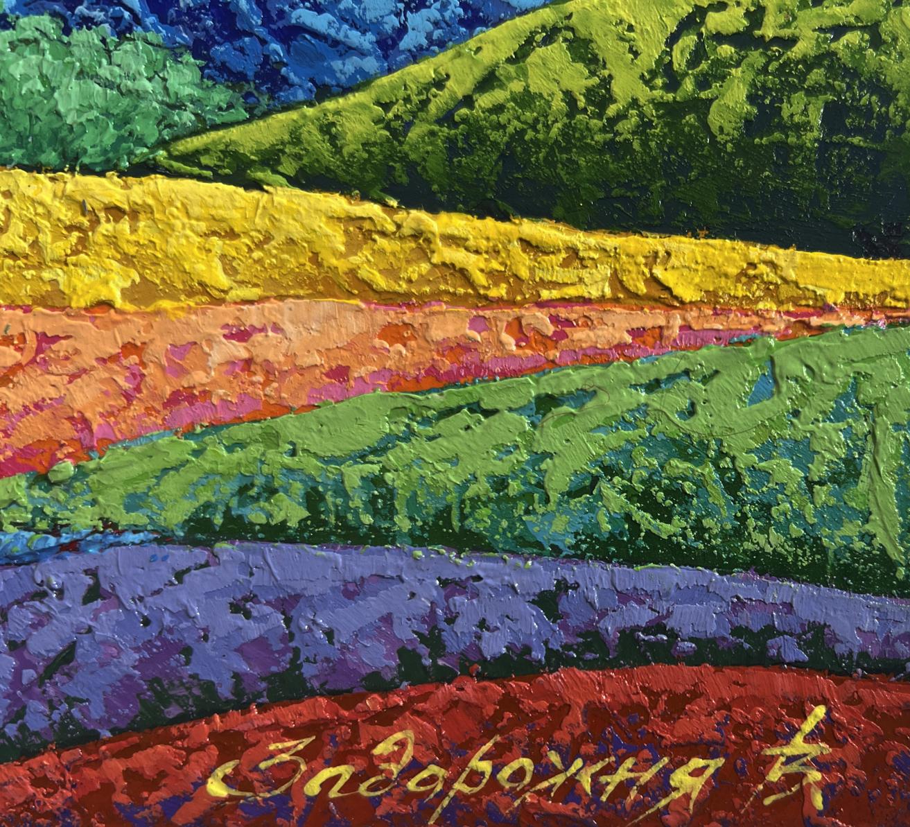 The oil painting on cardboard titled "Sunset Rays Over a Mountain Valley" is a stunning visual representation of nature’s brilliance at the end of the day. Through the interplay of color, light, and texture, the artwork captures the magical moment when the sun casts its final golden rays across the landscape, illuminating rolling hills and a majestic mountain range. At the center of the composition, the sun is depicted as a radiant white orb, emitting beams of light that stretch across the sky in dynamic, textured strokes. These rays create a sense of movement and energy, as if the warmth of the sun is spilling over the entire valley, bathing it in a golden glow. The sky transitions from bright yellow near the sun to hints of soft oranges and warm hues, creating depth and contrast against the cooler tones of the mountains below. The background features a series of mountains, painted in deep shades of blue with touches of lighter tones, suggesting the reflection of the fading daylight. The artist uses thick, expressive brushstrokes to render the texture of the rocky peaks, giving them a sense of solidity and presence. The contrast between the warm sky and the cool, shadowy mountains enhances the painting’s depth, drawing the viewer’s gaze toward the horizon. In the middle ground, rolling green hills provide a lush transition from the mountains to the foreground. The vibrant greens, painted with thick impasto strokes, suggest the presence of dense vegetation, possibly meadows or forested slopes. The way these hills curve and overlap adds to the painting’s sense of perspective, leading the eye naturally through the landscape. The foreground is a vibrant patchwork of fields in warm and cool tones, arranged in flowing, undulating patterns. The rich yellows, oranges, reds, and purples create a tapestry of color, giving the impression of a fertile valley bursting with life. These fields could represent cultivated land, blooming wildflowers, or simply the natural variations of the earth as it catches the sunlight. The texture of the paint is particularly striking here, with thick, tactile layers that give the landscape a sense of movement and vitality. The composition of the painting is carefully balanced, with the sun as the focal point and the lines of the hills and fields guiding the viewer’s eye throughout the scene.