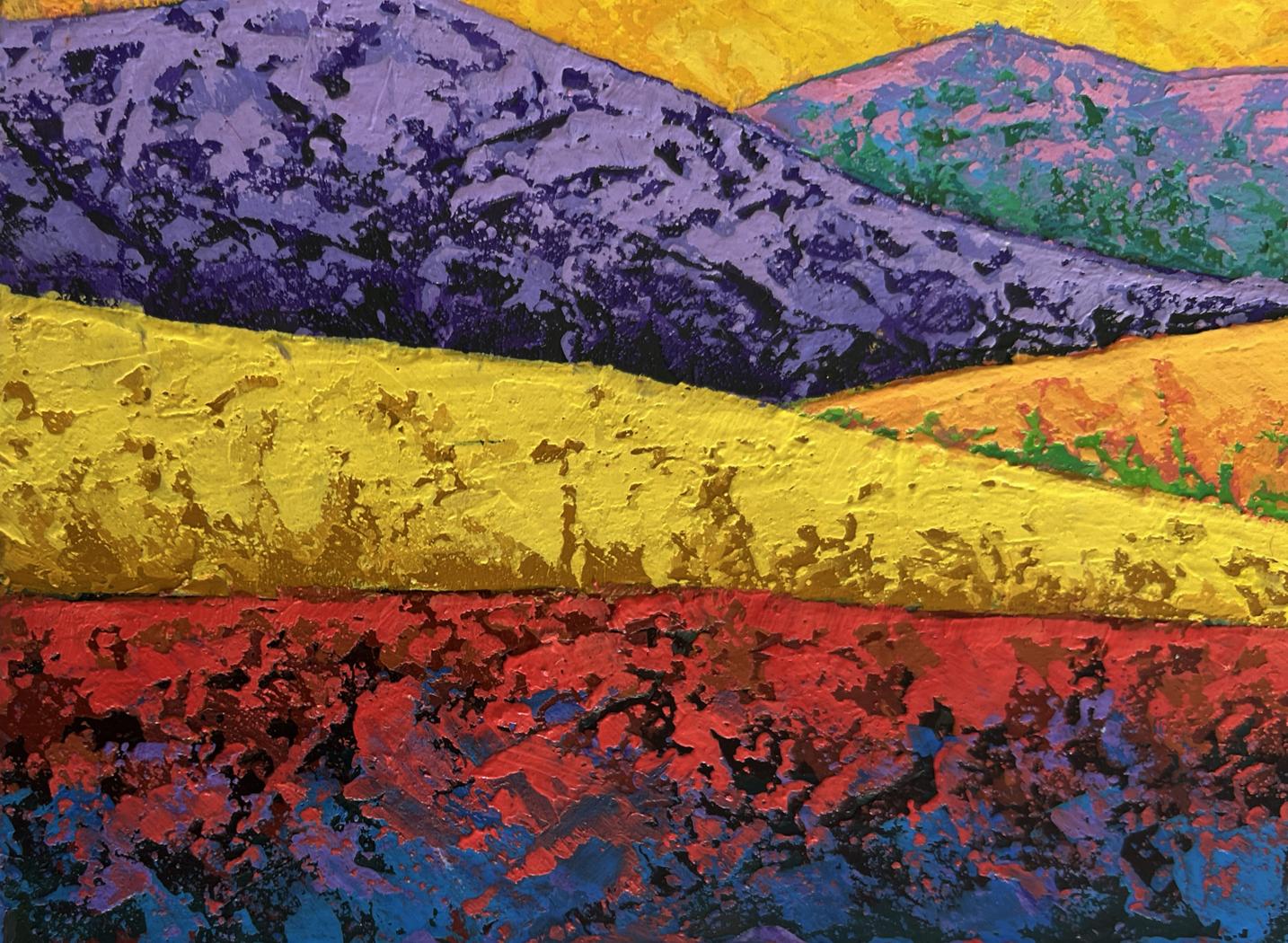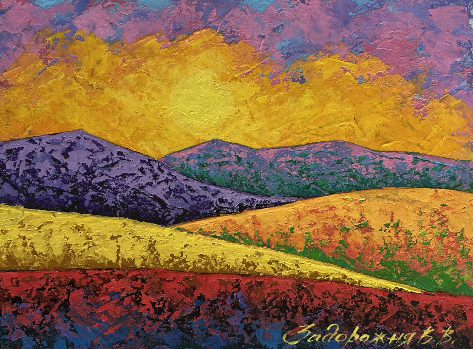 The oil painting on cardboard titled "The Blazing Sky Above the Peaks" captures the dramatic interplay of color and light in a breathtaking mountainous landscape. The artist’s expressive use of thick, textured strokes and bold, saturated hues brings a sense of movement and energy to the canvas, immersing the viewer in the grandeur of nature’s ever-changing beauty. The sky dominates the upper half of the composition, painted in fiery golden yellows, deep oranges, and hints of magenta and violet. These colors swirl together in a dynamic, almost turbulent pattern, evoking the sensation of a setting sun igniting the heavens. The sun itself, though subtly blended into the sky, radiates warmth and intensity, its light diffusing through the clouds in a mesmerizing display. The artist masterfully captures the transition between day and night, the fleeting moment when the sky is ablaze with vivid hues before darkness slowly settles over the land. The mountains beneath this celestial spectacle rise with strength and solidity, their rugged peaks painted in deep purples, blues, and greens. The layering of colors and the use of varied brushstrokes create depth and dimension, making the mountains appear both distant and imposing. The choice of darker tones in the foreground, transitioning to lighter shades in the background, enhances the perception of space, inviting the viewer to journey into the vast expanse of the landscape. The rolling fields in the lower portion of the painting are a striking contrast to the mountains, painted in bright yellows, rich reds, and earthy greens. These warm, glowing colors mirror the intensity of the sky, uniting the different elements of the composition in a harmonious dance of light and shadow. The fields appear to stretch endlessly, their contours shaped by the natural curves of the land. The blending of colors suggests the presence of wildflowers, dry grasses, or cultivated fields, adding an element of mystery to the scene. The thick, textured application of paint adds to the raw, organic feel of the artwork. The artist’s use of impasto brushwork allows the colors to interact in a lively, almost sculptural manner, creating a tactile quality that enhances the emotional impact of the piece. The texture invites the viewer to experience the painting not just visually but almost physically, as if one could reach out and feel the rough surfaces of the mountain slopes or the softness of the illuminated clouds.