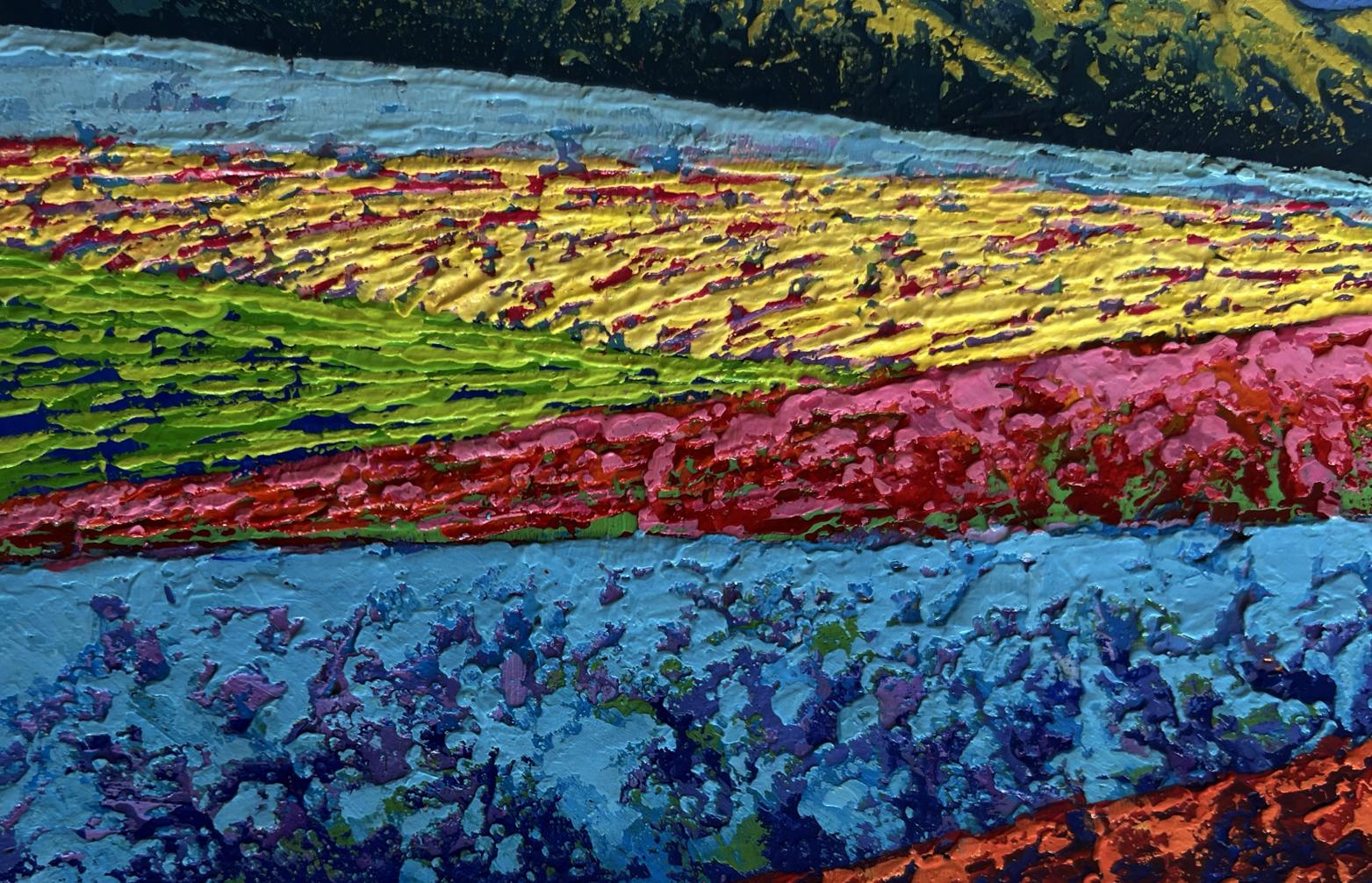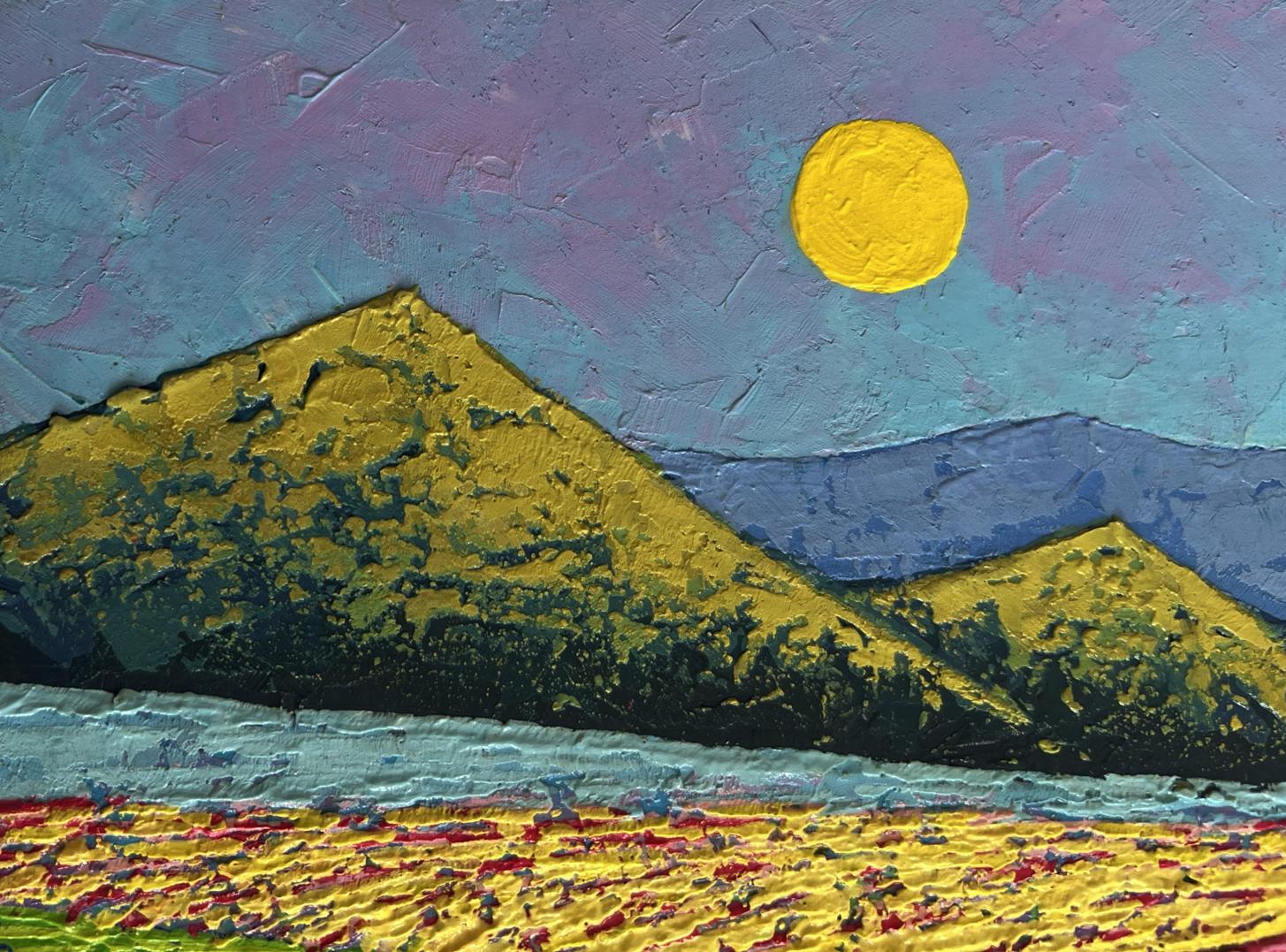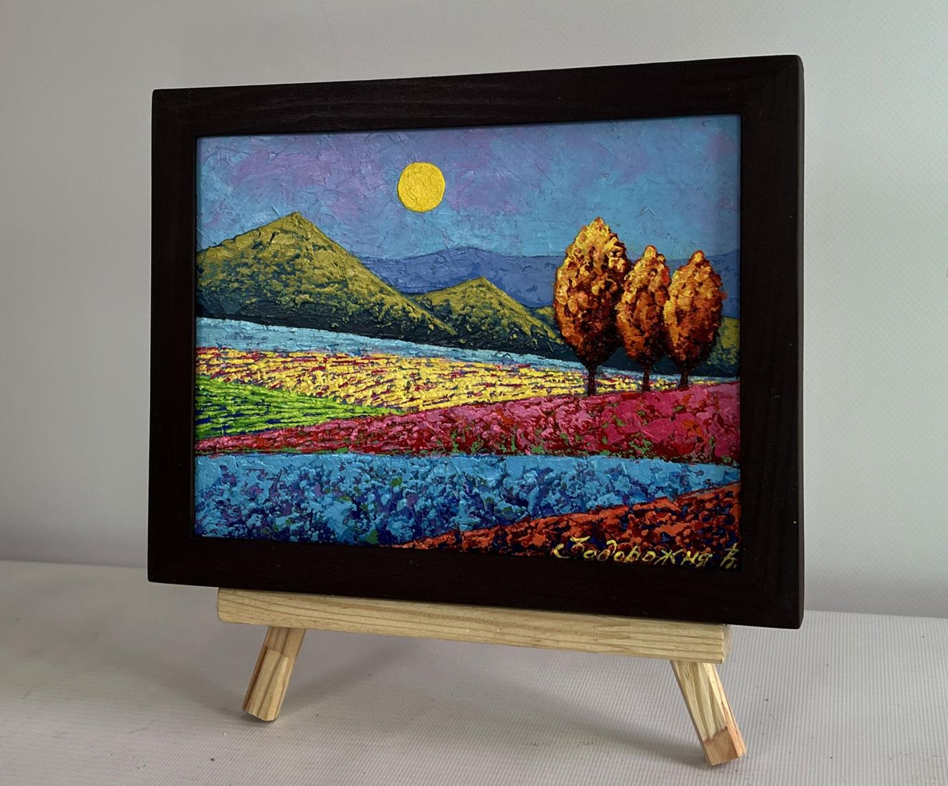 The oil painting on cardboard titled "Three Autumn Guards Among the Fields" presents a breathtaking landscape where nature's vibrancy and serenity coexist harmoniously. The composition is built upon a foundation of expressive colors, rich textures, and a dynamic contrast between elements, making the artwork both captivating and deeply evocative. The central focus of the painting is a trio of tall, golden-hued trees standing side by side, their bright foliage illuminated against the backdrop of rolling hills and an expansive sky. Their placement in the composition is deliberate, as they appear like sentinels, standing guard over the vast, colorful fields that stretch endlessly before them. Their autumnal tones, a blend of warm oranges, deep yellows, and hints of crimson, create a stunning contrast with the cooler shades of the surrounding landscape. The fields themselves are a mesmerizing interplay of colors and textures, divided into distinct bands that transition smoothly from one to the next. In the foreground, deep blues and purples suggest a shadowed expanse, possibly covered in wildflowers or vegetation. As the landscape extends, vibrant pinks, fiery reds, and soft golden yellows emerge, representing different sections of cultivated land bathed in the soft glow of the setting sun. The artist’s use of bold, impasto brushstrokes enhances the painting’s tactile quality, giving the impression of movement and depth within the fields. Beyond the fields, the landscape rises into rolling hills and rugged mountain slopes painted in earthy greens and moody blues. These towering formations provide a grounding element to the scene, contrasting with the fiery tones of the trees and fields. The mountains are rendered in a way that suggests distance, their peaks fading softly into the horizon. The cool, deep blues of the distant ridges add an element of tranquility, counterbalancing the energy of the foreground. Above this spectacular landscape, a vast sky stretches across the upper portion of the canvas. Painted in soft yet dynamic tones of lavender, cerulean blue, and hints of rose, the sky conveys a sense of peace and vastness. A glowing golden moon hovers above the peaks, its gentle radiance casting a quiet glow over the entire scene. The inclusion of the moon adds a layer of depth and contemplation to the painting, hinting at the passage of time and the transition between day and night.