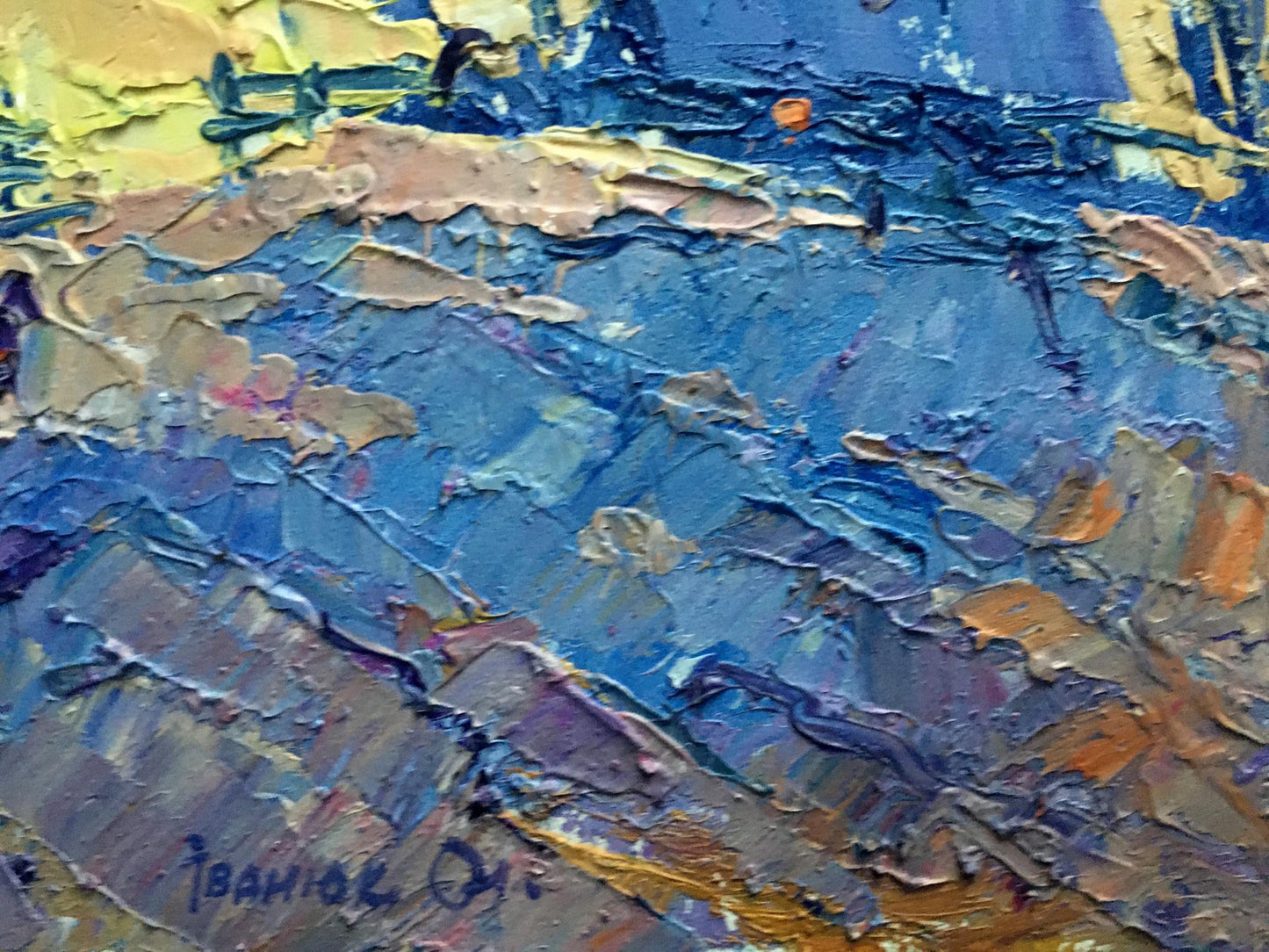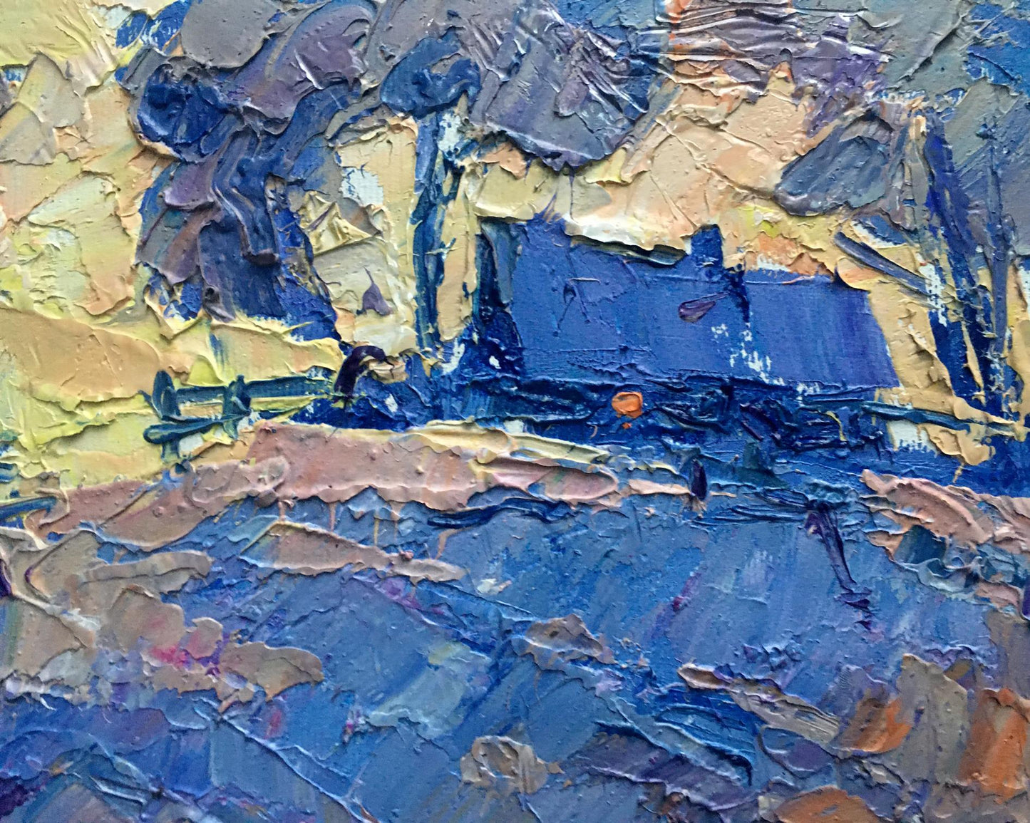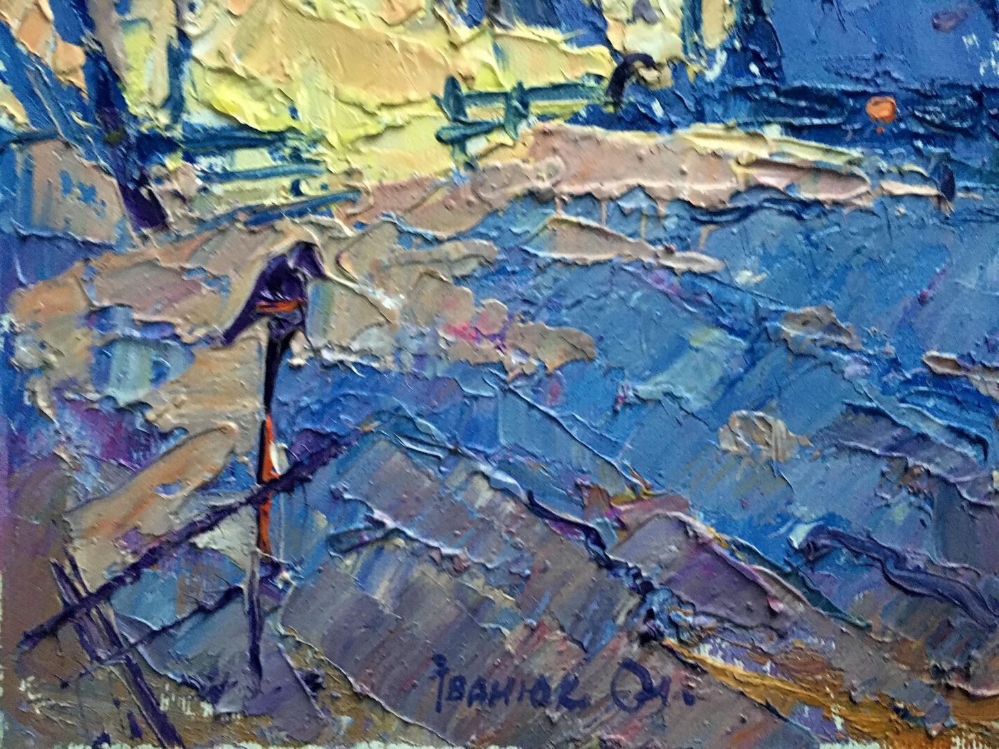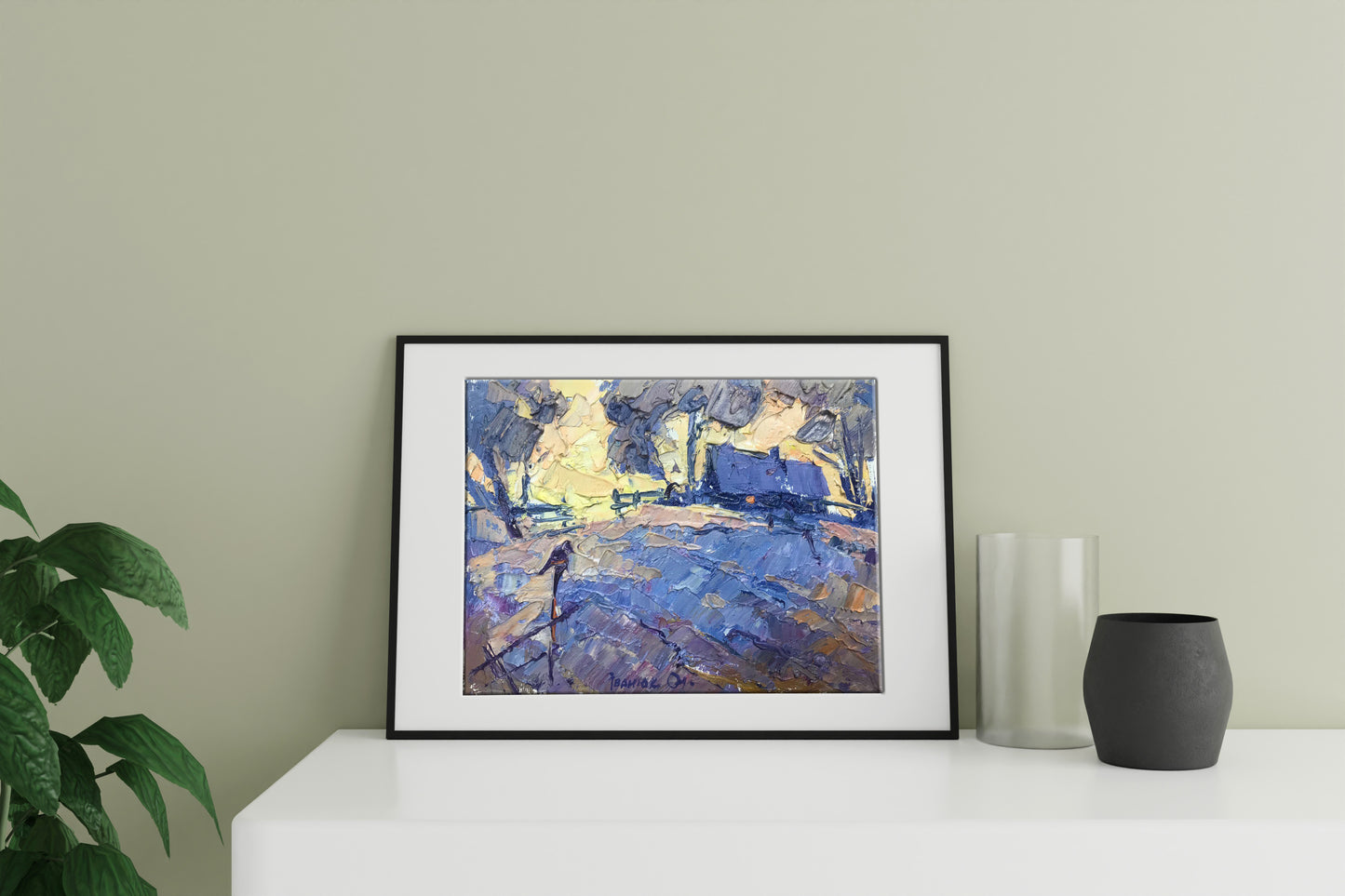 "Enchanting winter sunset" is an enchanting oil painting by Ivanyuk Alex that encapsulates the serene and introspective ambiance of a chilly evening in a rural winter setting. Utilizing a harmonious blend of blues, purples, and whites, Alex skillfully creates a vivid impression of a landscape cloaked in snow, where the tranquility of the scene is palpable. Flecks of yellow and soft hues in the sky capture the fleeting light of the sun as it dips below the horizon, casting a gentle glow over the snowy expanse.