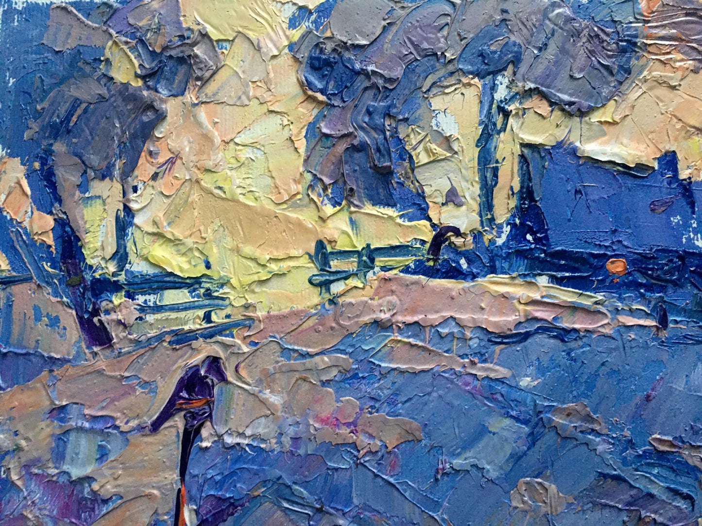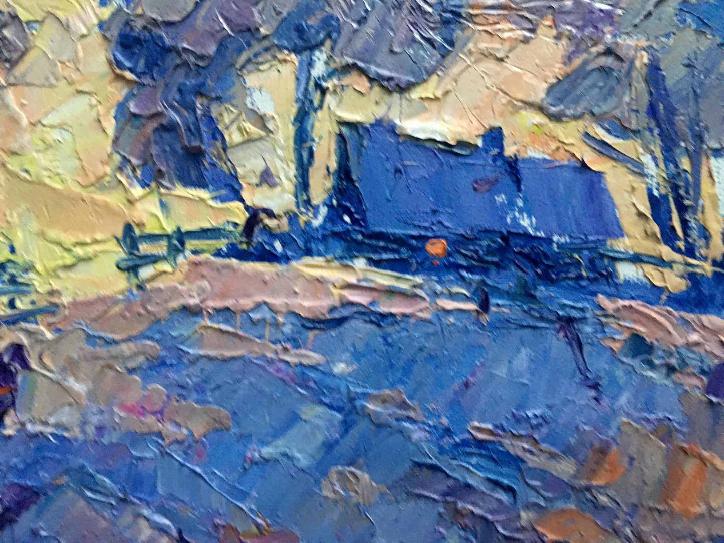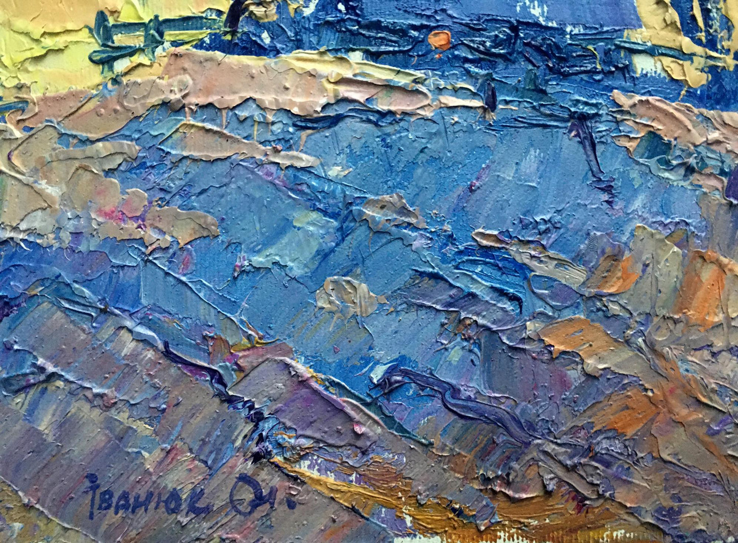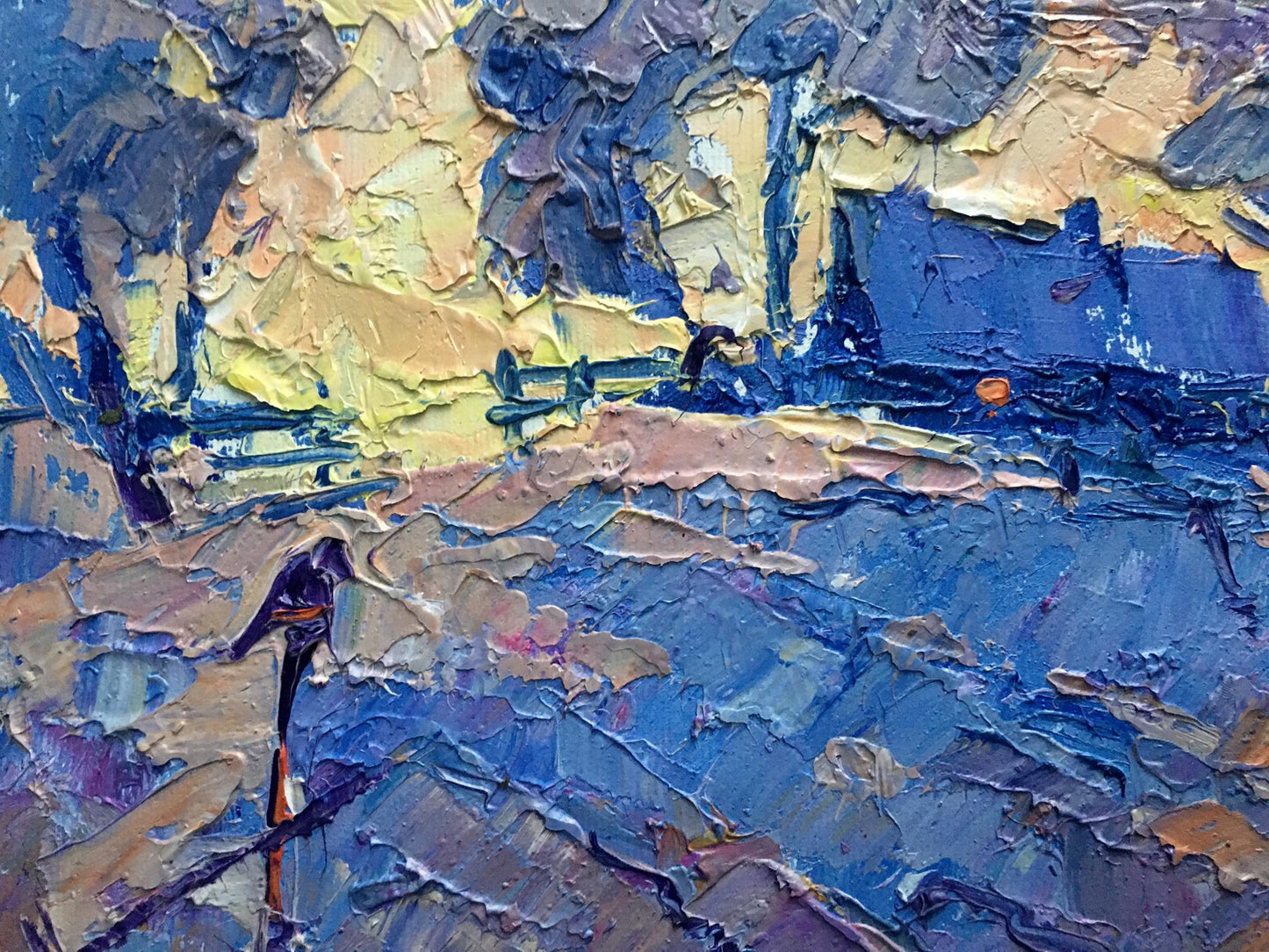"Enchanting winter sunset" is an enchanting oil painting by Ivanyuk Alex that encapsulates the serene and introspective ambiance of a chilly evening in a rural winter setting. Utilizing a harmonious blend of blues, purples, and whites, Alex skillfully creates a vivid impression of a landscape cloaked in snow, where the tranquility of the scene is palpable. Flecks of yellow and soft hues in the sky capture the fleeting light of the sun as it dips below the horizon, casting a gentle glow over the snowy expanse.