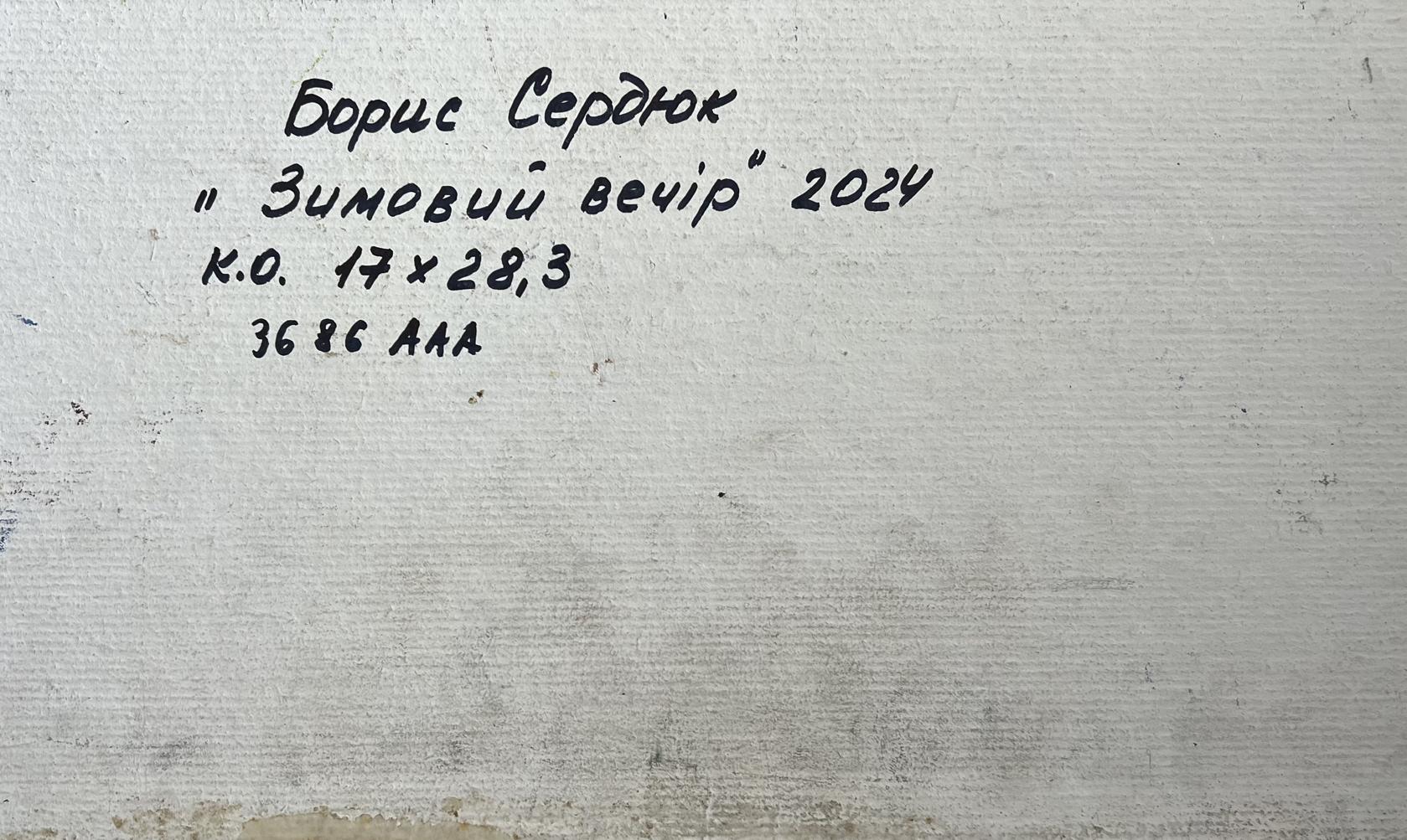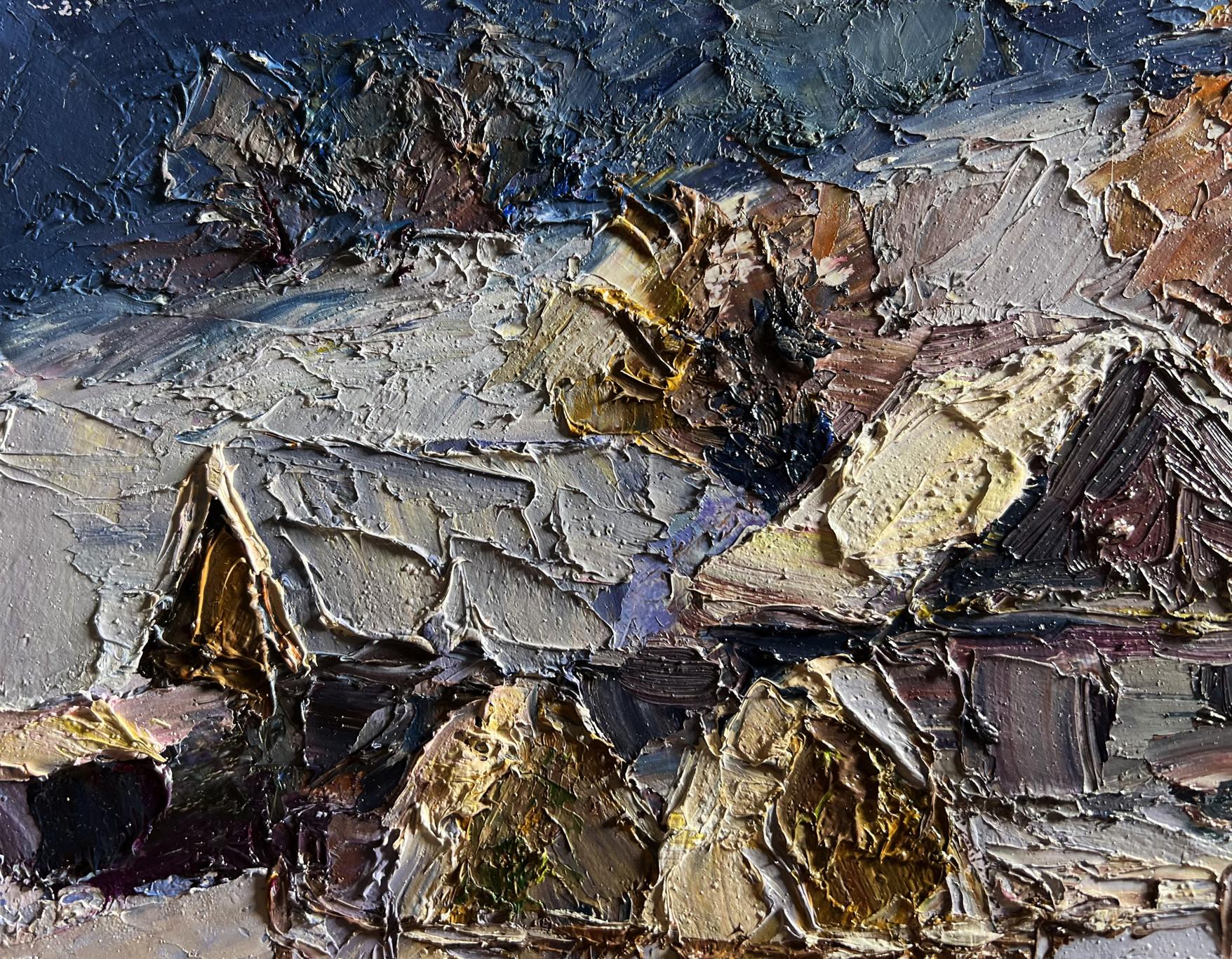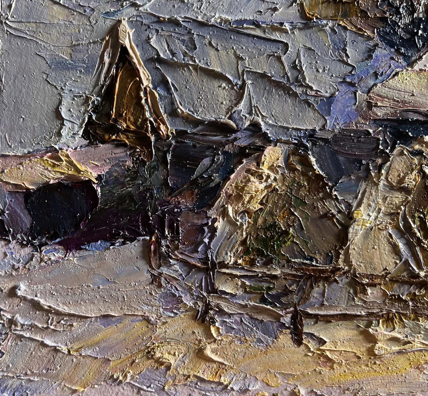 "Winter Village Evening" is a textured Oil painting on cardboard that captures the quiet beauty of a snow-covered rural landscape at dusk. The artist uses thick, expressive brushstrokes and a rich impasto technique to create depth and texture, giving the scene a tangible, almost sculptural quality.The foreground is dominated by the snow-covered ground, where patches of earth peek through the thick layers of white. The artist uses a mixture of warm and cool tones to depict the interplay of light and shadow on the uneven surface of the snow. This effect adds movement to the painting, making it feel as if the landscape is alive, shaped by the natural forces of winter.At the center of the composition, traditional village houses with steeply pitched roofs stand nestled among trees. Their roofs are heavy with fresh snow, emphasizing the weight of the season. The wooden walls, painted in dark earthy tones, contrast with the surrounding whiteness, making the structures appear sturdy and resilient against the cold. The artist’s technique captures the rough texture of the wood and the aged, weathered quality of the buildings, adding a sense of authenticity and nostalgia to the scene.To the left of the houses, two haystacks covered in snow stand enclosed by a rustic wooden fence. Their rounded shapes break the angularity of the architecture, bringing balance to the composition. The haystacks, painted with strokes of ochre and brown, add warmth to the predominantly cool palette, reminding the viewer of the village’s agricultural roots and the hard work that sustains it even in the harshest months.The background is dominated by a dense cluster of trees, their bare branches reaching toward the sky. Some of the trees still hold onto the last remnants of autumn, with golden leaves clinging to the branches, providing a striking contrast against the winter landscape. The sky, a deep mixture of blue and gray, suggests the approaching night, while hints of warm tones reflect the last light of the setting sun.Through "Winter Village Evening," the artist conveys a profound sense of peace and stillness. The painting evokes the warmth of home and the resilience of rural life, where nature and tradition exist in harmony. The heavy textures and dynamic brushstrokes reflect the raw beauty of winter, while the choice of color and composition create a mood of quiet contemplation. It is a scene that speaks of simplicity, endurance, and the comforting familiarity of home in the midst of the vast, snowy landscape.